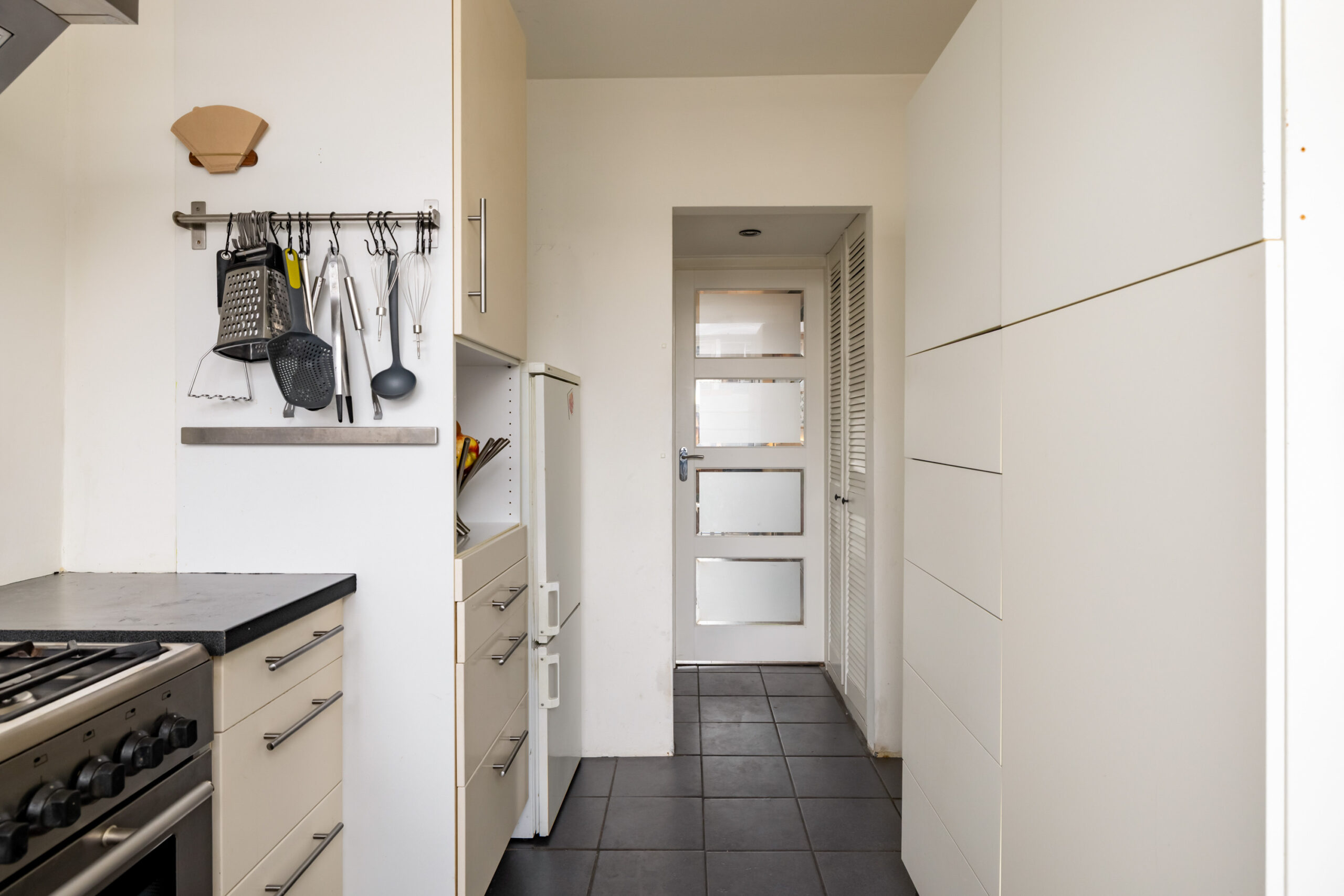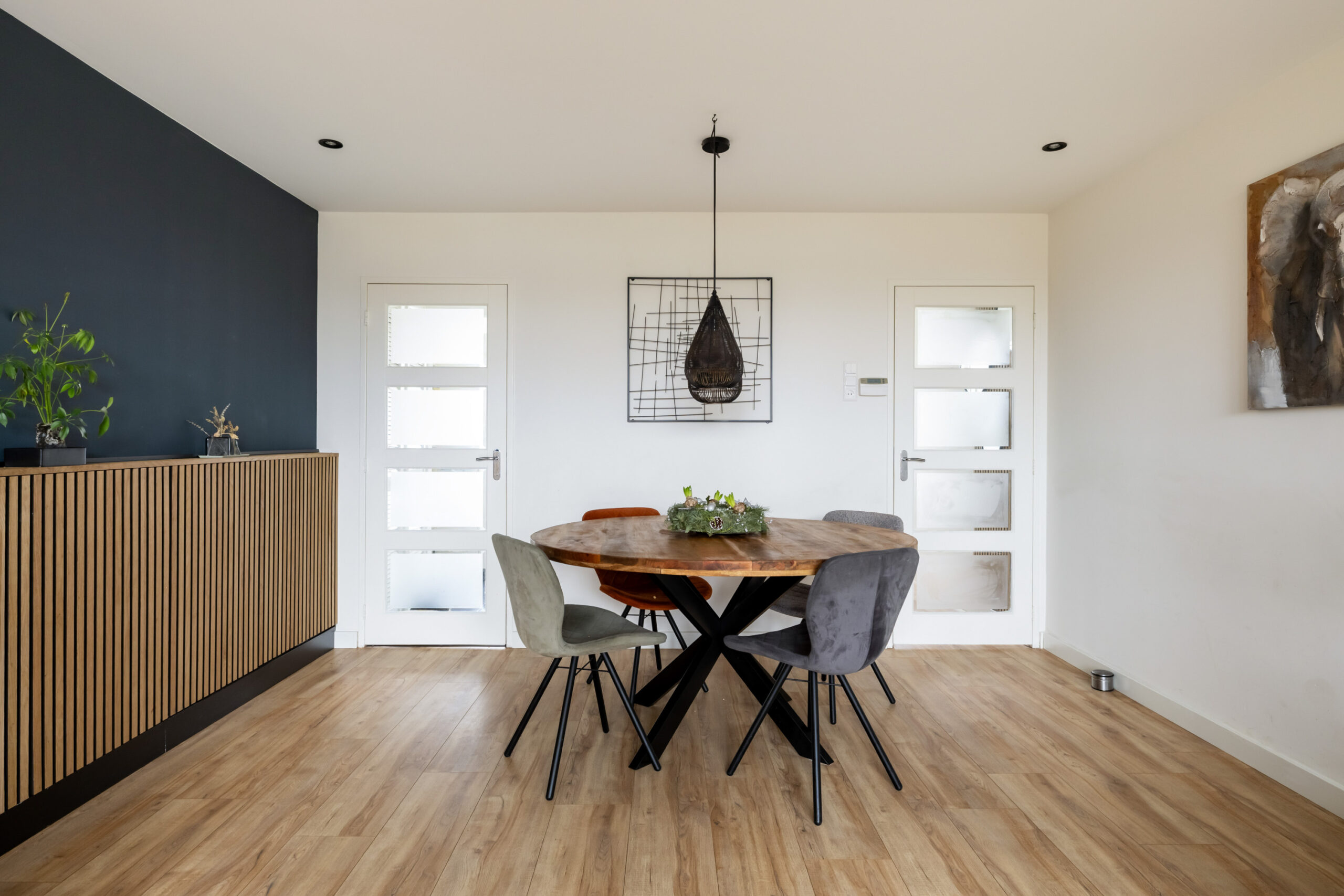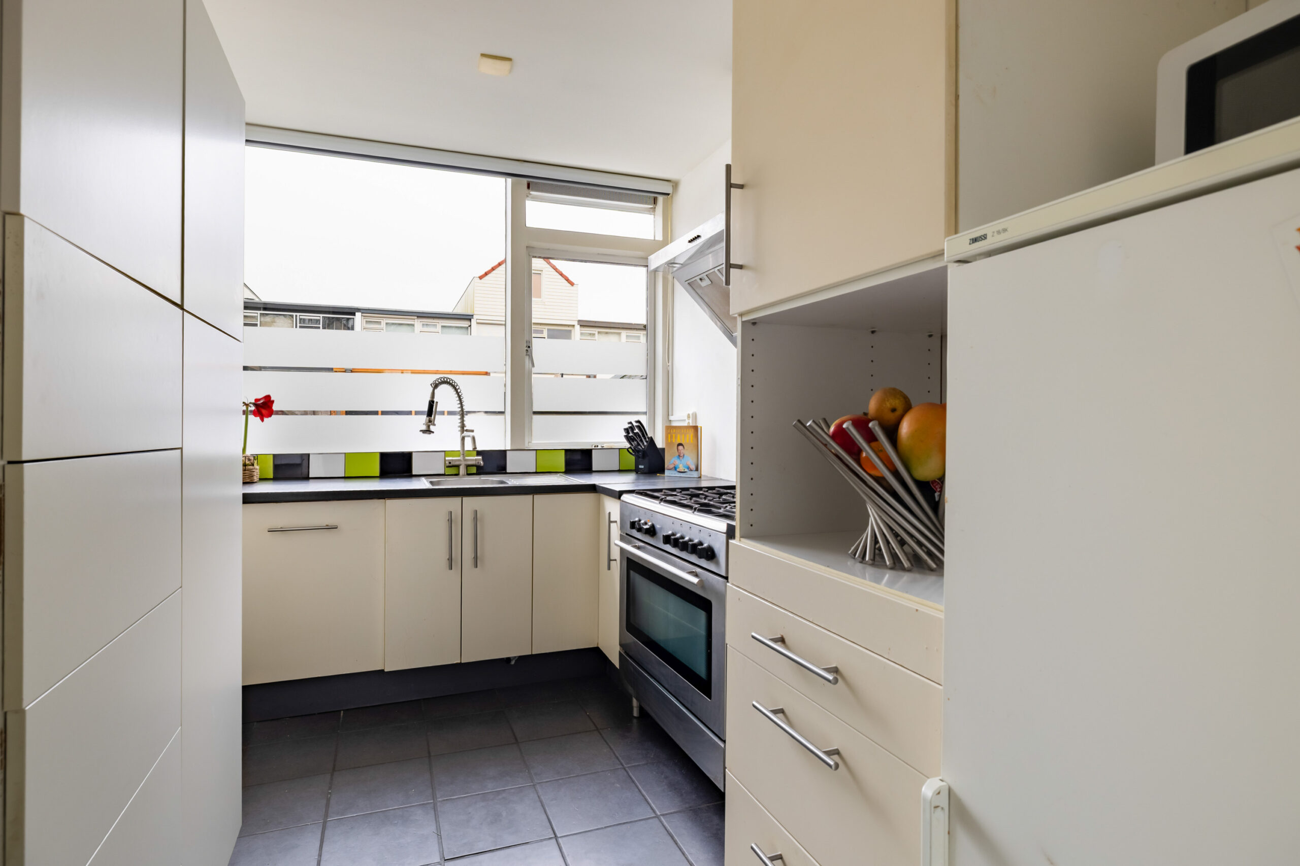 Je komt de woning binnen via de entree met hal, meterkast en het vrijhangende toilet. Het toilet is tot ca.1 meter betegeld en is voorzien van een fontein. Aan de voorzijde van de woning bevindt zich de keuken en is uitgerust met een 5-pits gasfornuis, afzuigkap, oven, combimagnetron, 10L boiler en een koel-/vriescombinatie. De woonkamer ligt aan de achterzijde en biedt uitzicht op de tuin. De ruimte is afgewerkt met een gestuukt plafond met inbouwspots en strak schilderwerk op de wanden. De gehele begane grond is voorzien van een laminaatvloer, wat zorgt voor een warme en uniforme uitstraling.