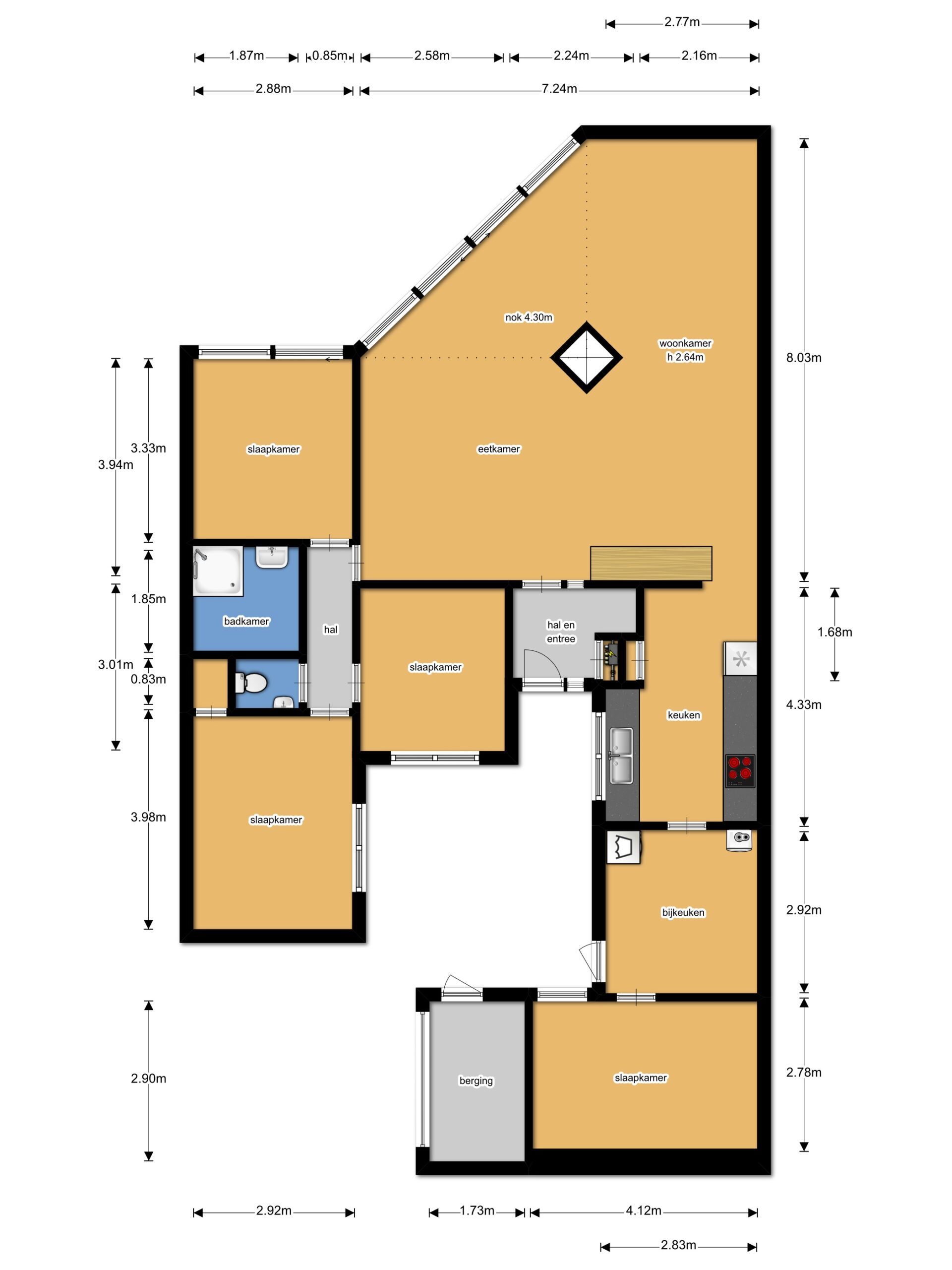 prettig in elkaar overlopen. Aan de voorzijde van de woning ligt de open keuken. Deze is uitgevoerd met een composiet aanrechtblad en uitgerust met een 4-pits inductiekookplaat en een koel-/vriescombinatie. Het plafond met inbouwspots geeft de keuken een moderne en verzorgde uitstraling. Aansluitend aan de keuken bevindt zich de bijkeuken. Hier zijn de aansluitingen voor de vaatwasmachine, wasmachine en droger gesitueerd. Vanuit de bijkeuken bereik je de voormalige garage. Deze ruimte is momenteel in gebruik als 4e (slaap)kamer en is afgewerkt met een stenen vloer. Dankzij de indeling en afwerking is deze kamer geschikt voor verschillende functies binnen de bungalow. Het voorste gedeelte van de voormalige garage wordt gebruikt als berging.