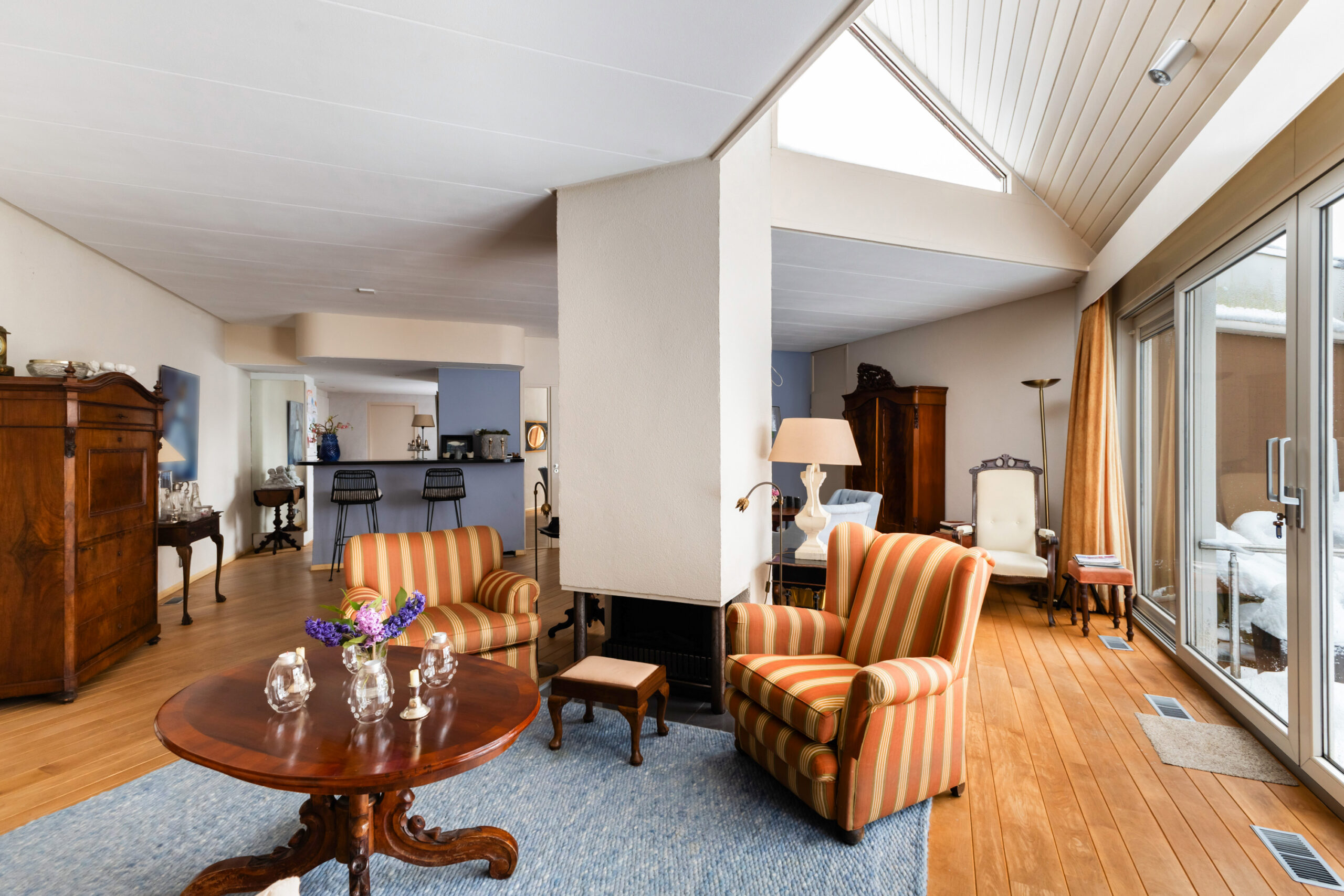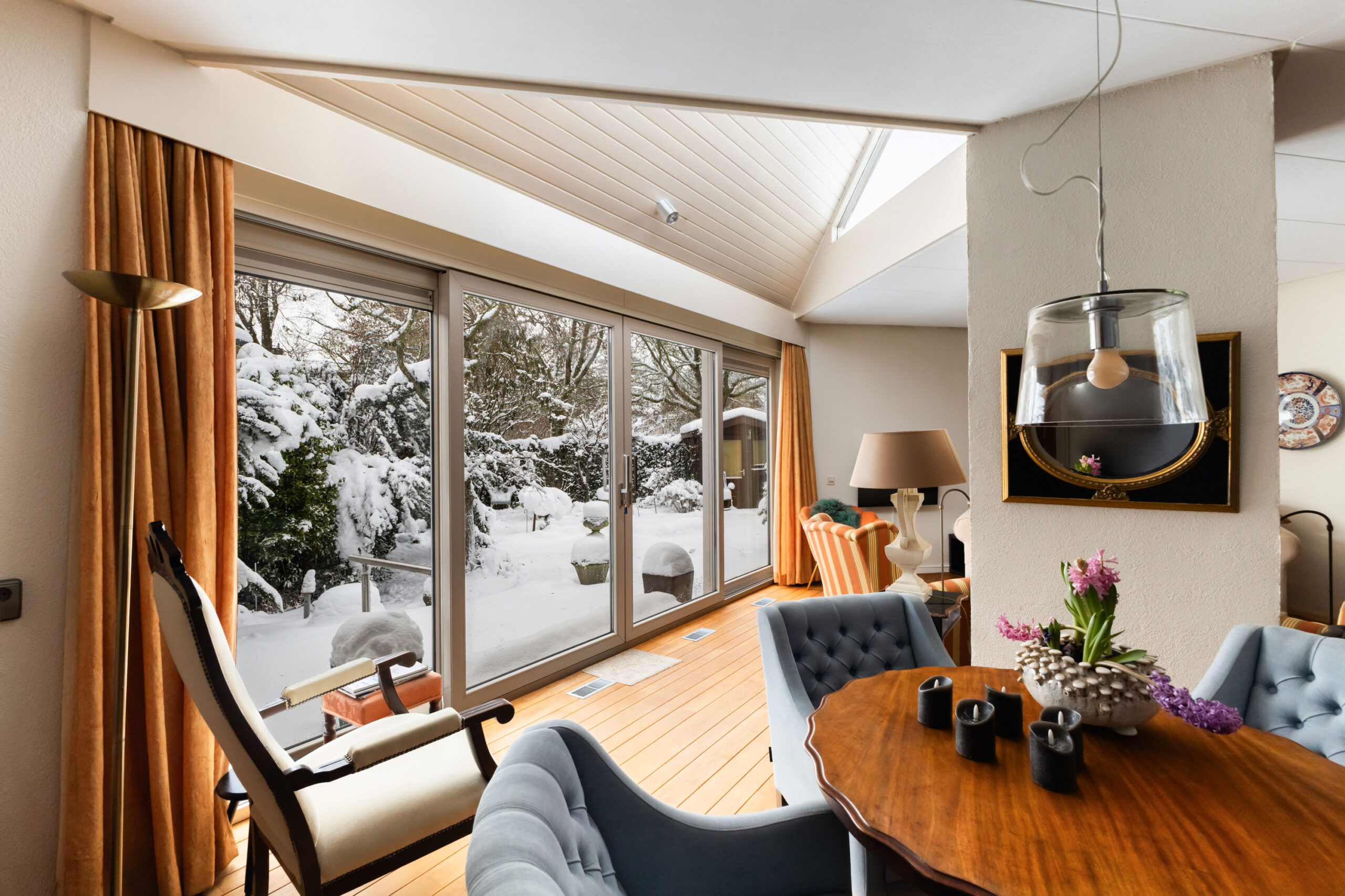 schilderwerk wanden en een open haard. Via de schuifpui stap je direct de achtertuin in, waardoor binnen en buiten