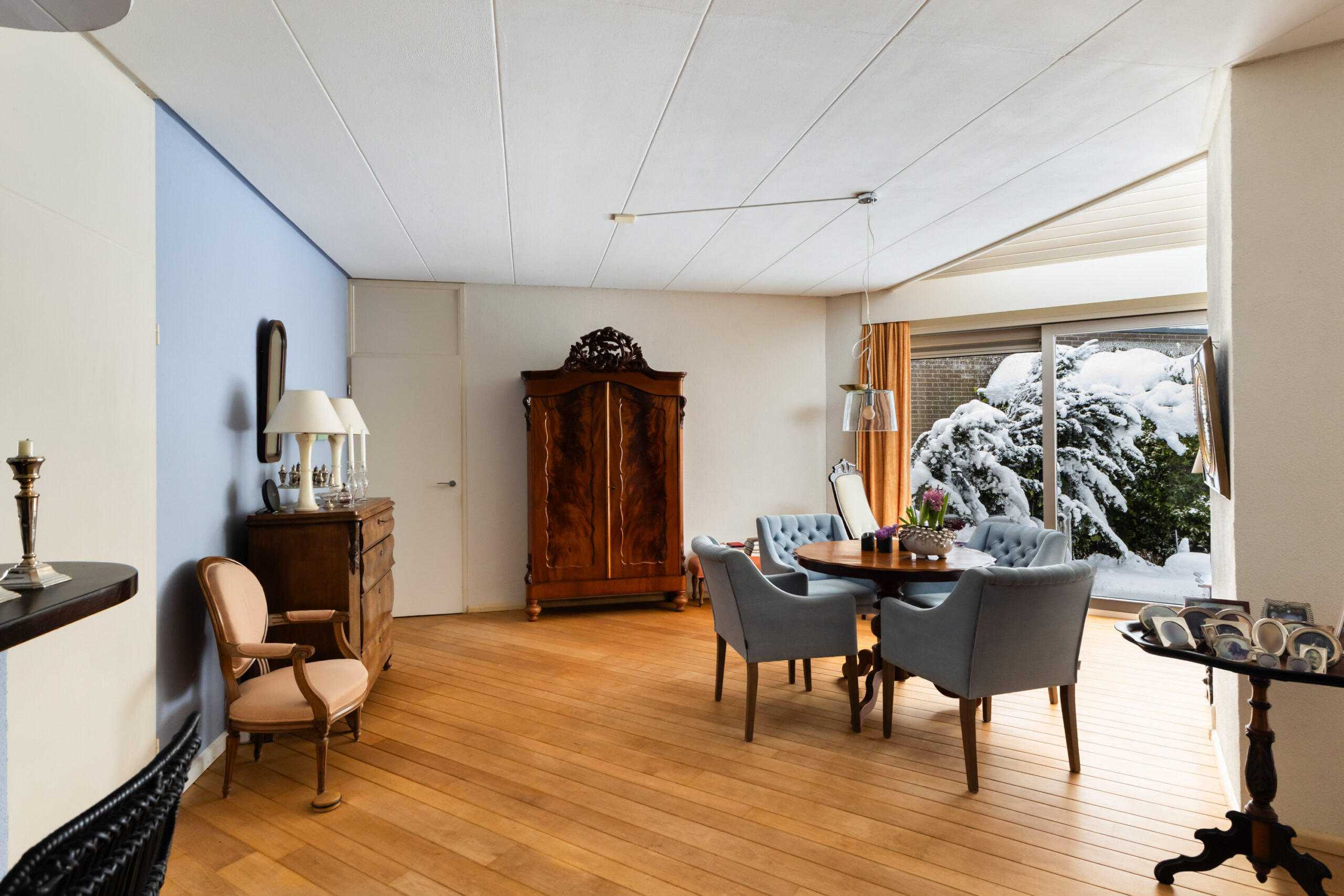 loop je door naar de leefruimtes van de woning. De woon-/eetkamer is ruim en sfeervol, met een houten vloer,