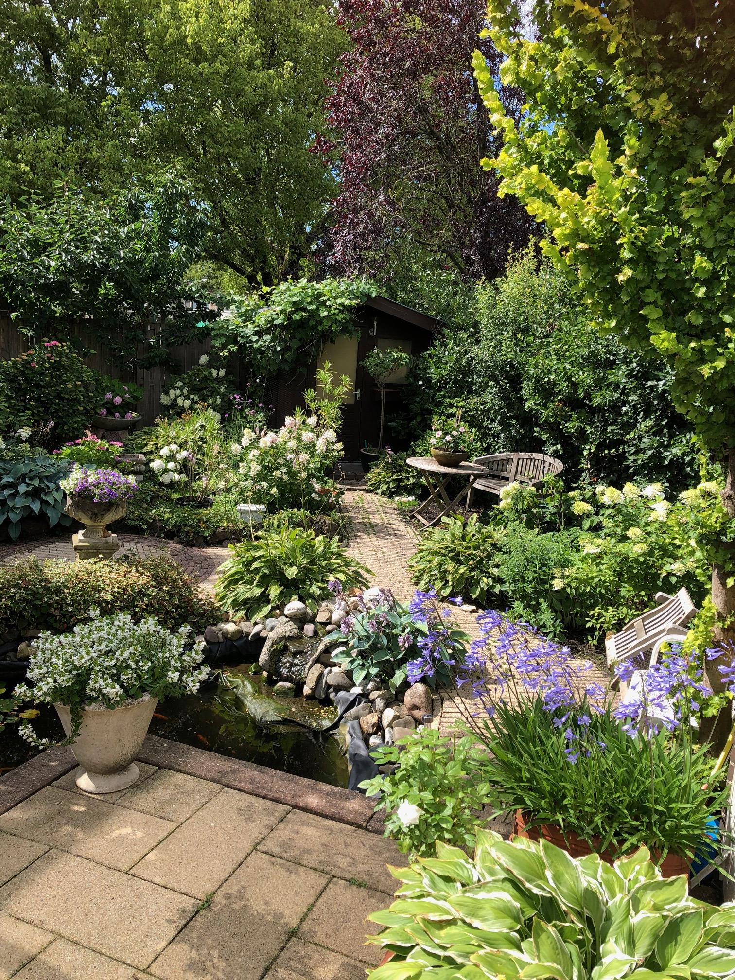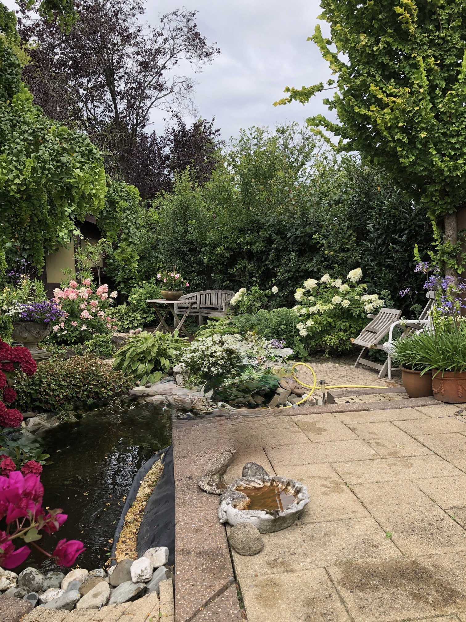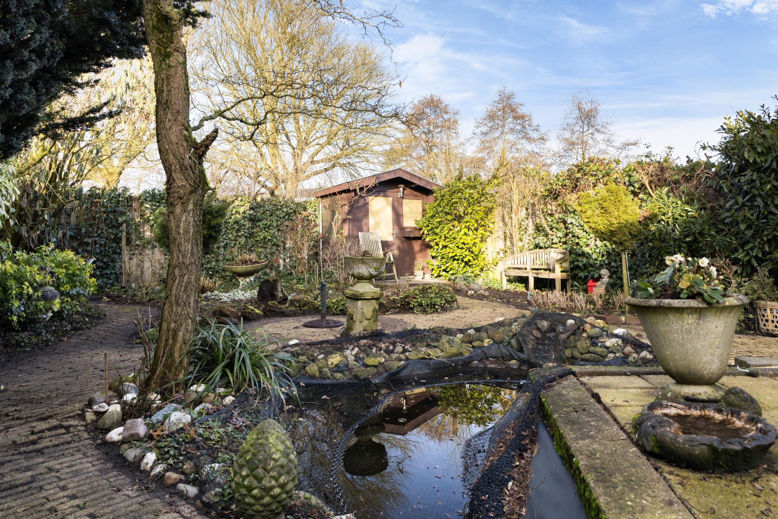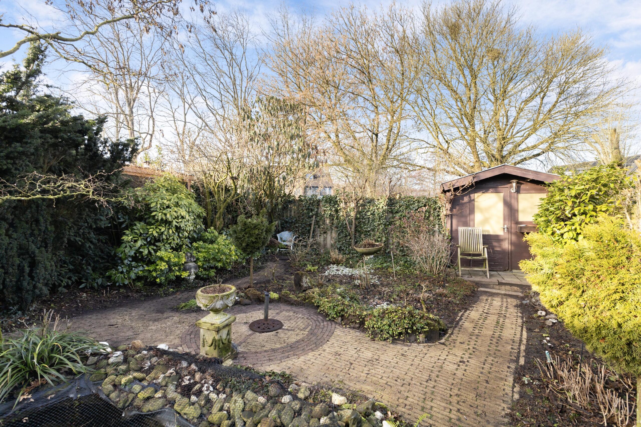 De zonnige prachtig aangelegde achtertuin op het westen grenst direct aan het park en is omringd door groen. Het