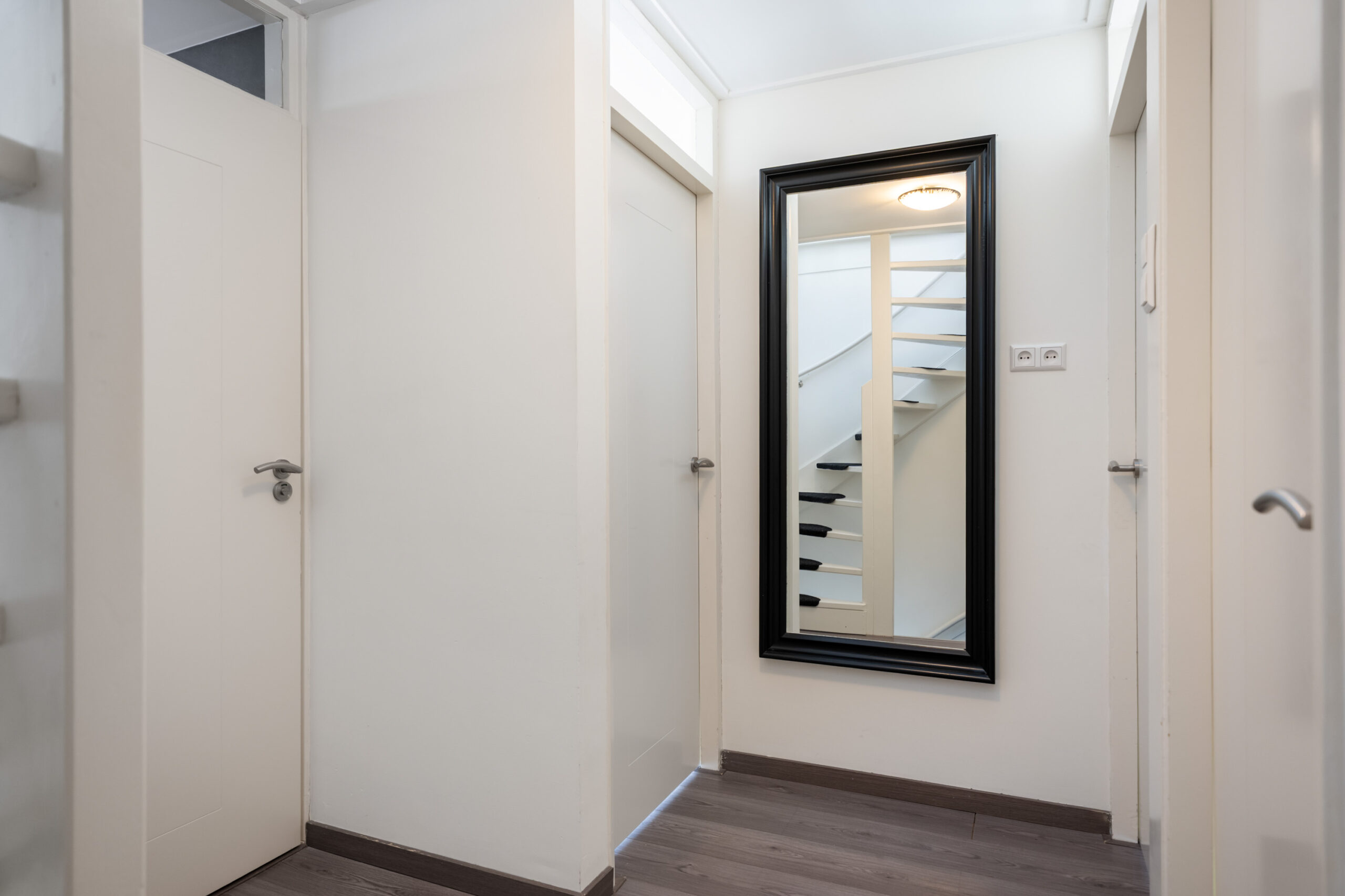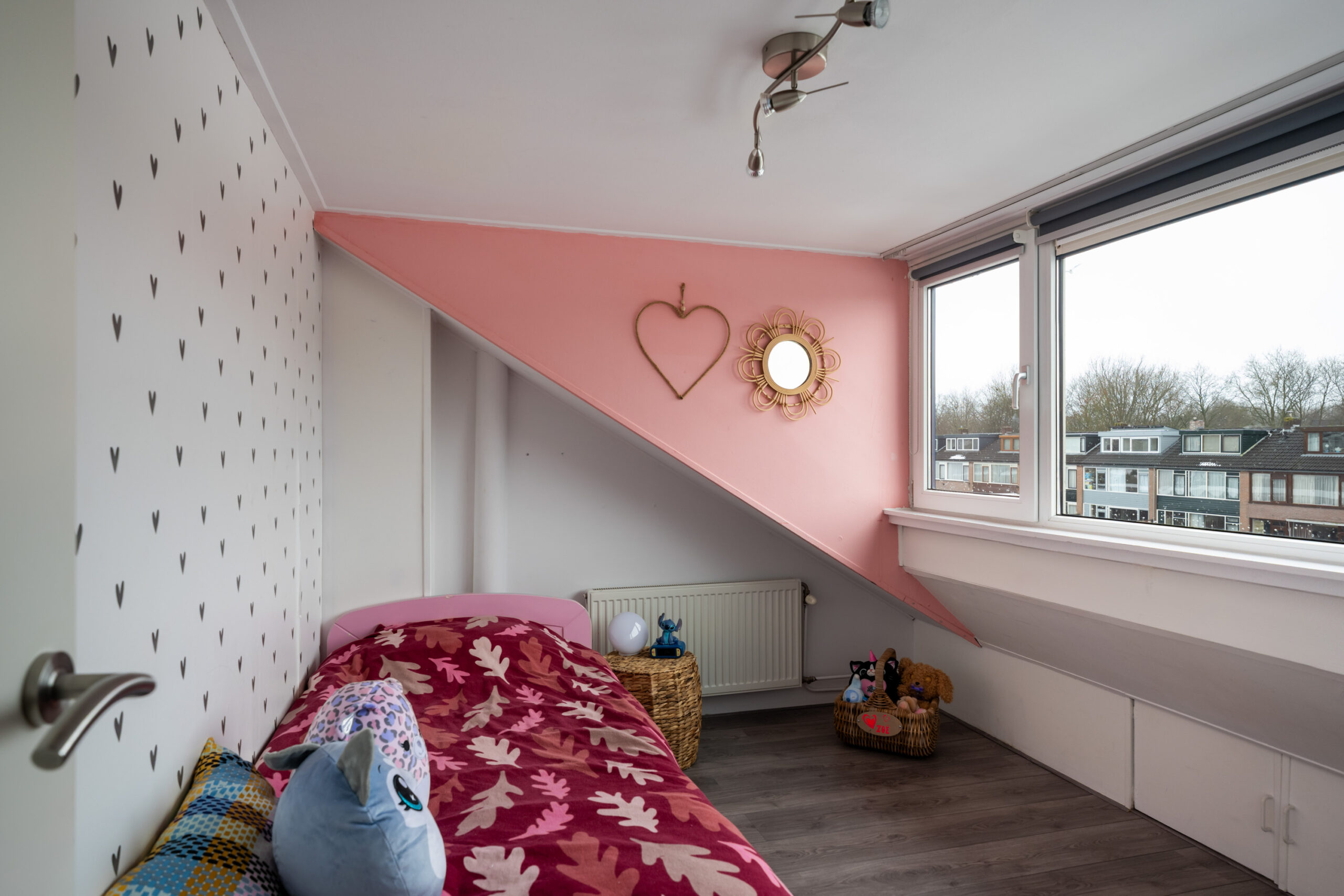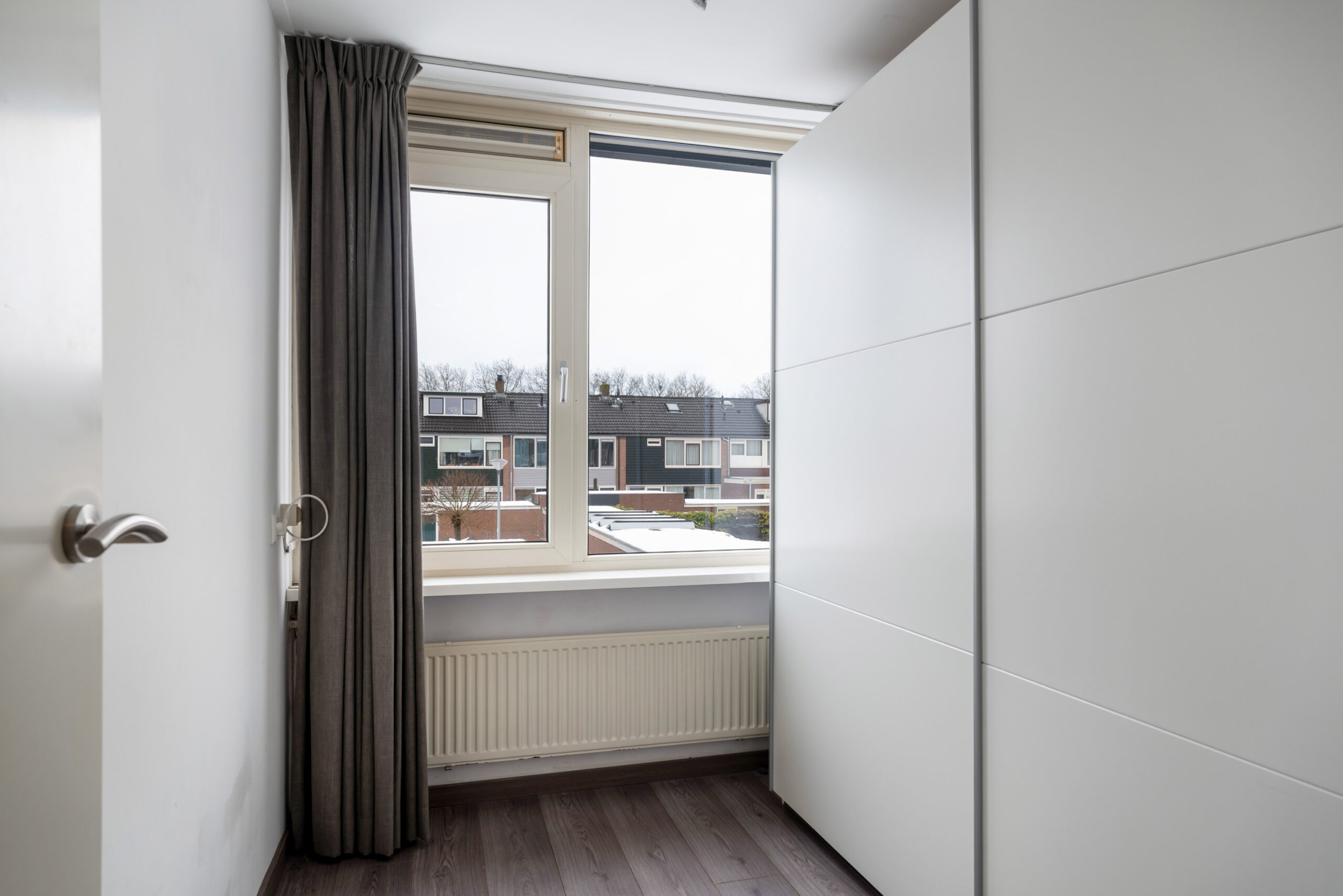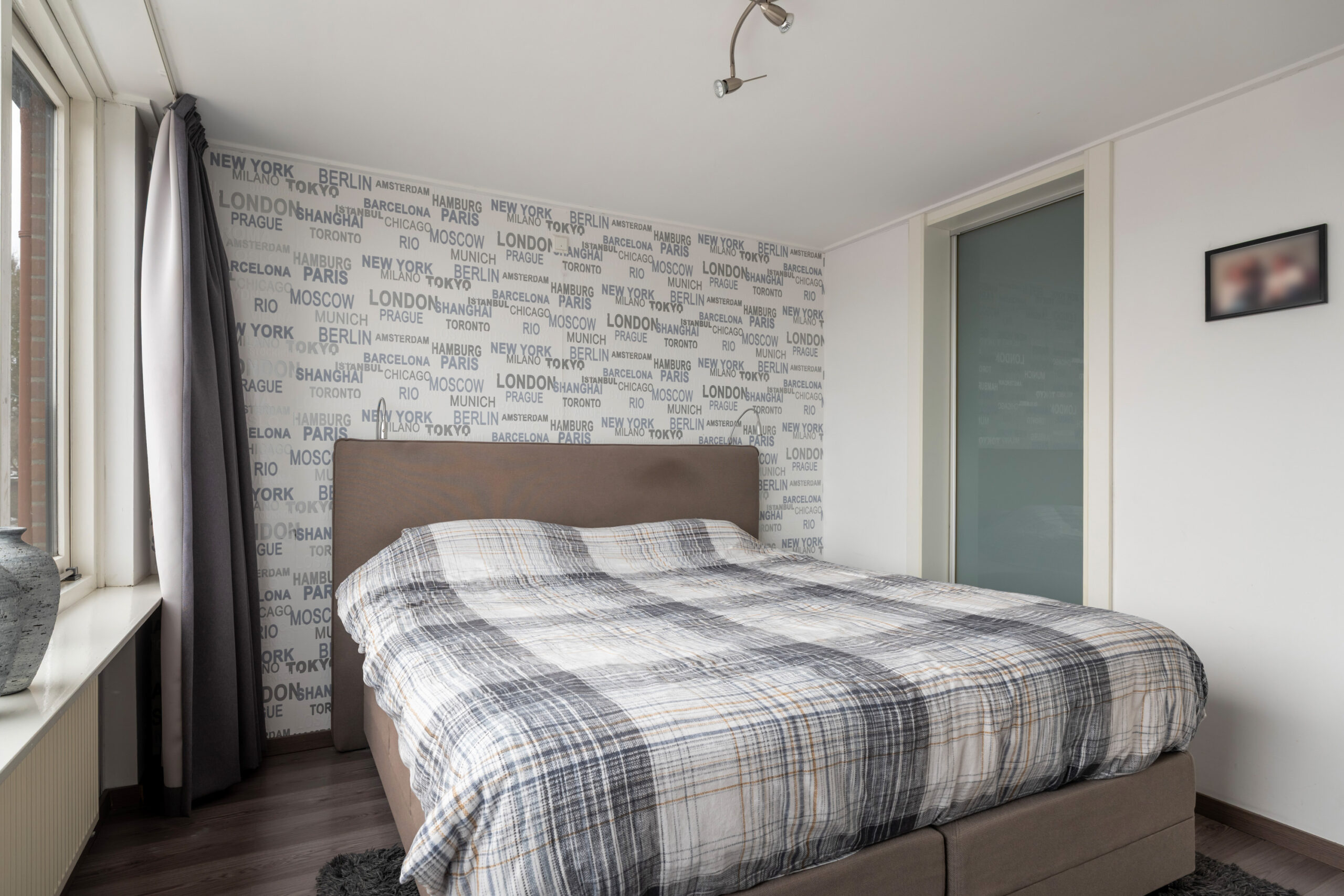 Via de trap in de hal kom je op de eerste verdieping, waar zich drie slaapkamers bevinden. De ruime hoofdslaapkamer is voorzien van een inloopkast. Alle slaapkamers hebben een laminaatvloer en gestuukte wanden en plafonds, deels afgewerkt met behang. De slaapkamers aan de achterzijde zijn bovendien voorzien van rolluiken. In 2017 zijn alle binnendeuren op deze en de tweede verdieping vernieuwd. De luxe badkamer, vernieuwd in 2019, is uitgerust met een royale douche, een dubbel wastafelmeubel en een vrijhangend toilet. De wanden zijn volledig betegeld tot aan het plafond en het gestuukte plafond is voorzien van inbouwspots.