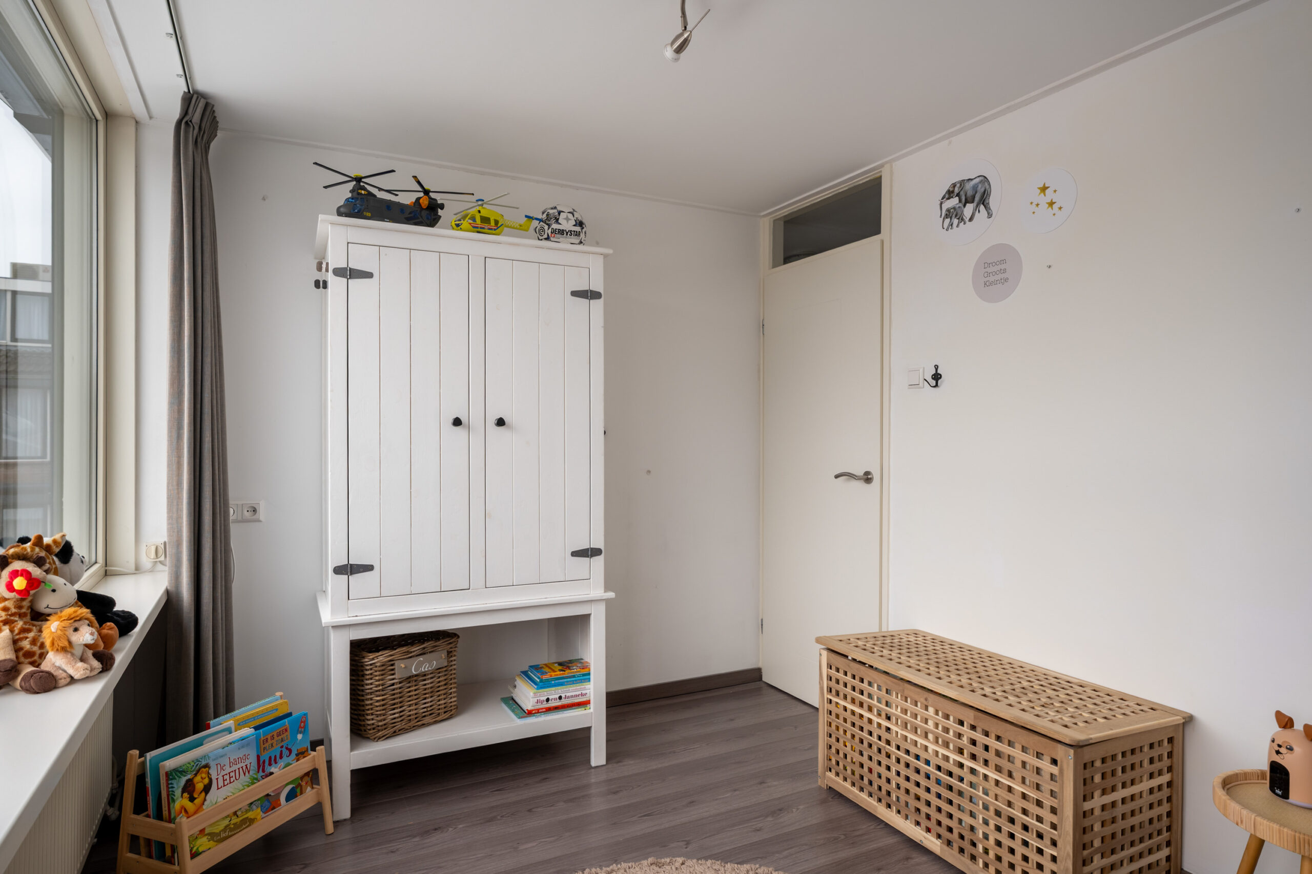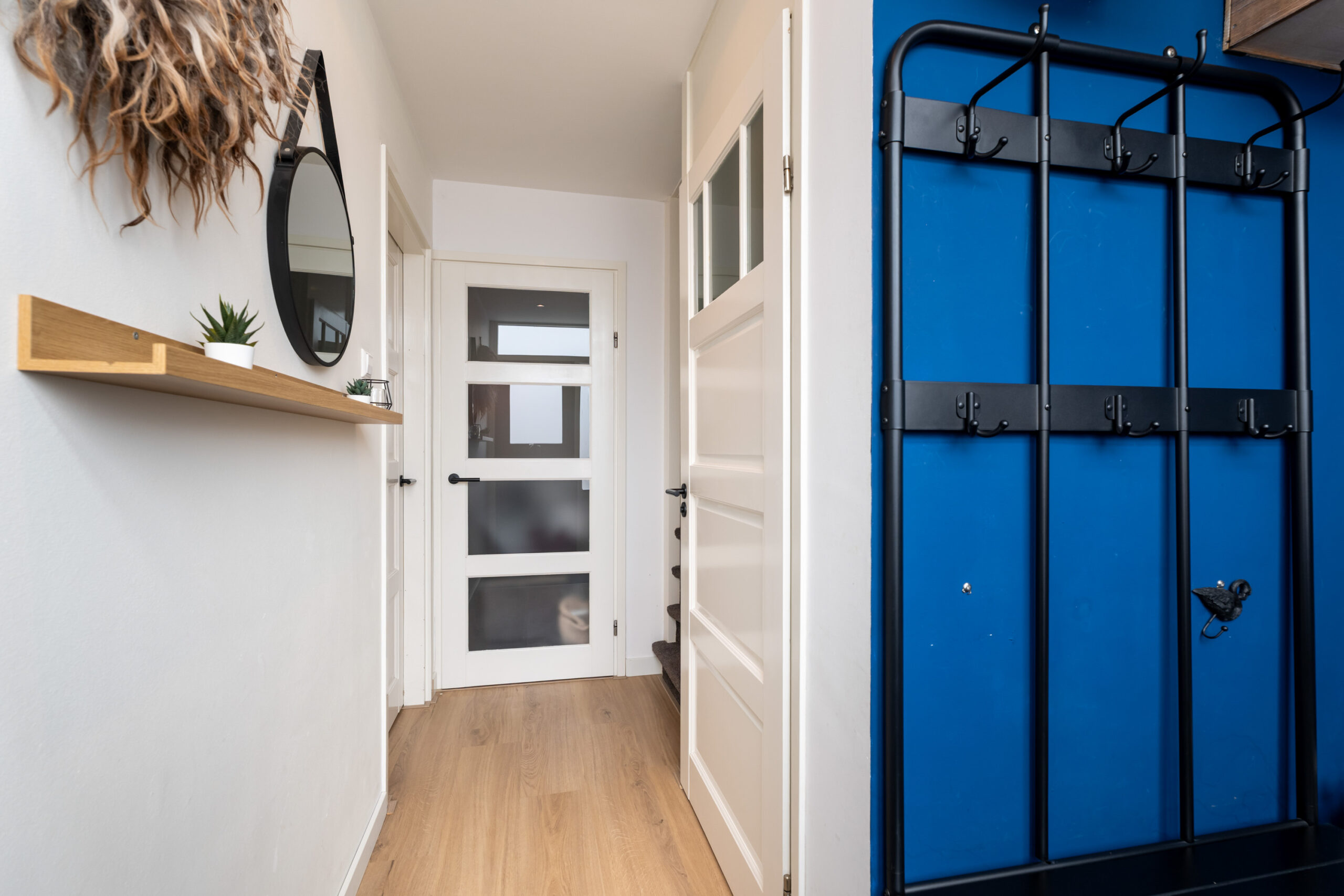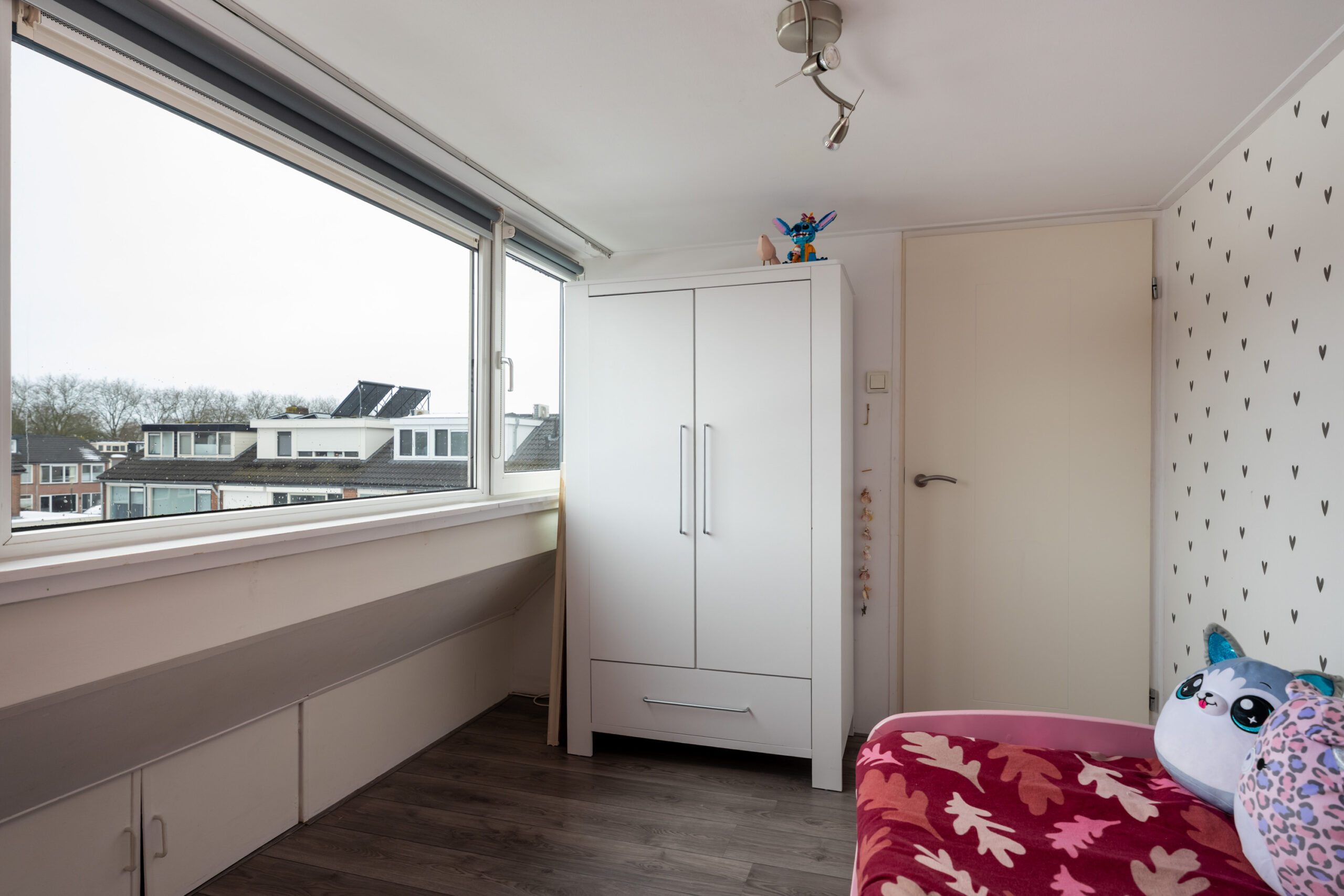 Via de trap in de hal kom je op de eerste verdieping, waar zich drie slaapkamers bevinden. De ruime hoofdslaapkamer is voorzien van een inloopkast. Alle slaapkamers hebben een laminaatvloer en gestuukte wanden en plafonds, deels afgewerkt met behang. De slaapkamers aan de achterzijde zijn bovendien voorzien van rolluiken. In 2017 zijn alle binnendeuren op deze en de tweede verdieping vernieuwd. De luxe badkamer, vernieuwd in 2019, is uitgerust met een royale douche, een dubbel wastafelmeubel en een vrijhangend toilet. De wanden zijn volledig betegeld tot aan het plafond en het gestuukte plafond is voorzien van inbouwspots.