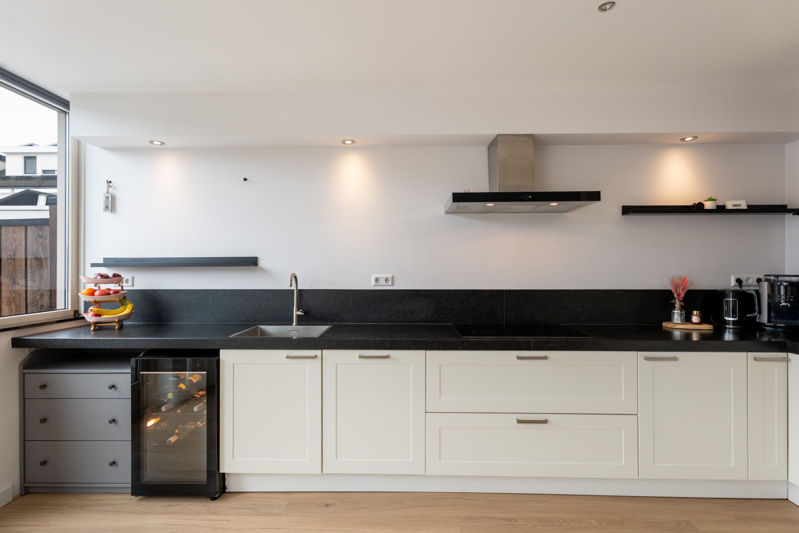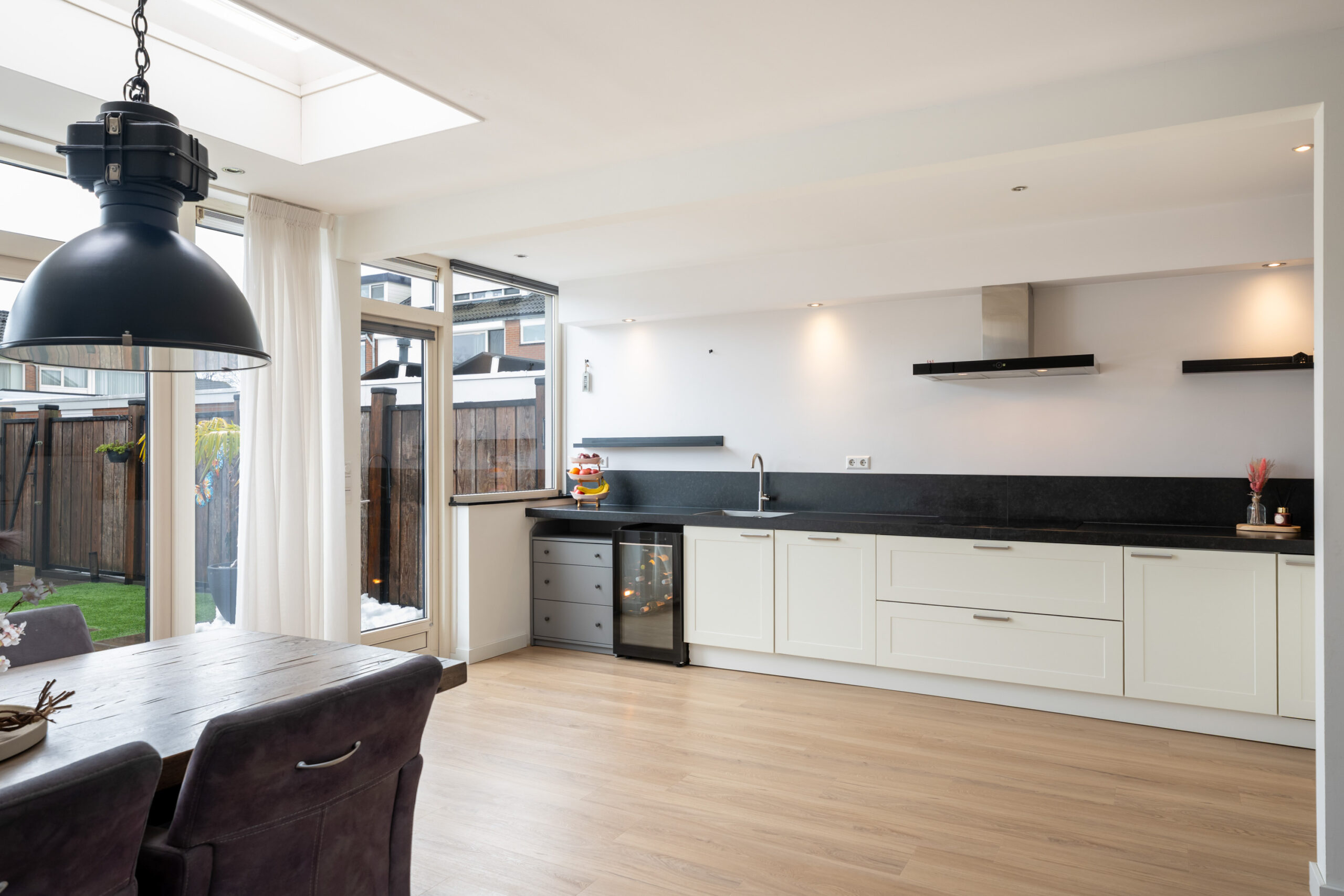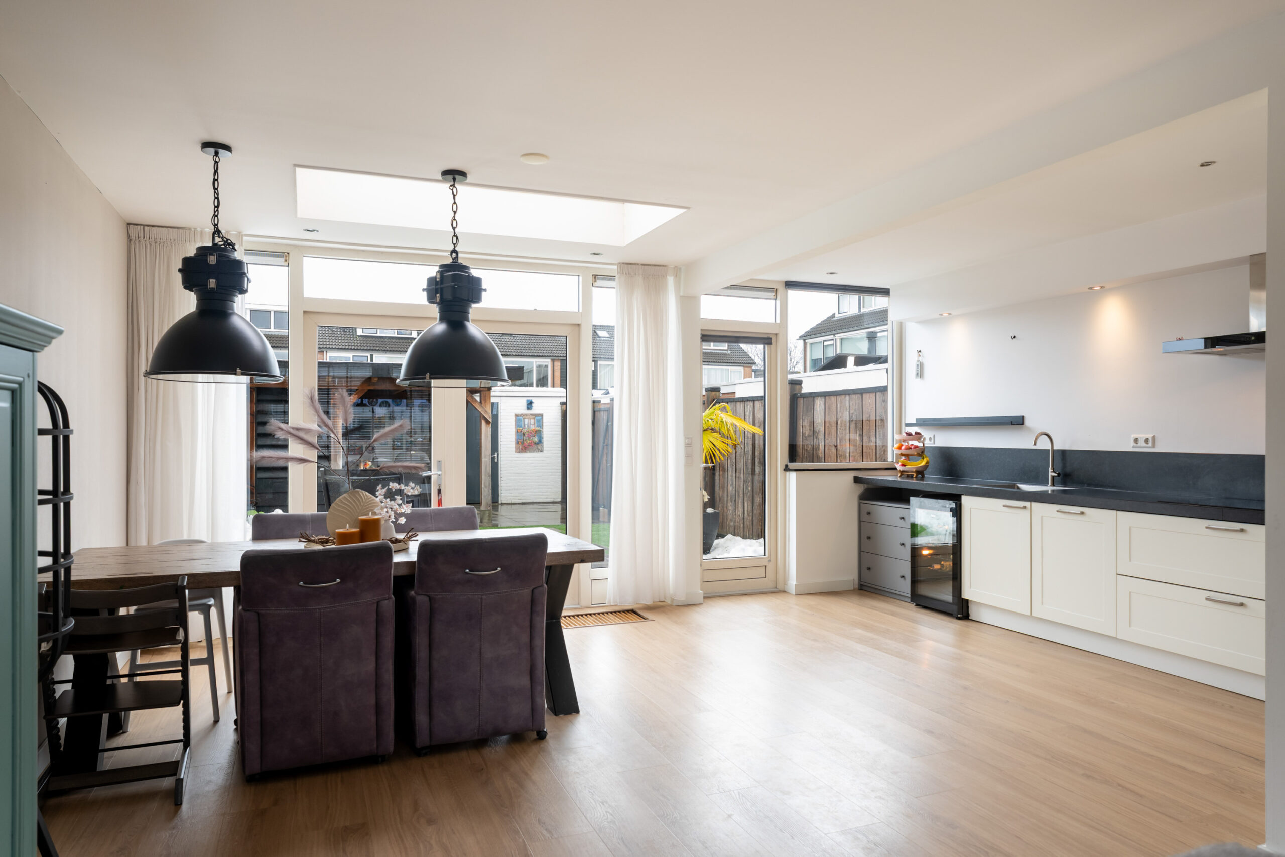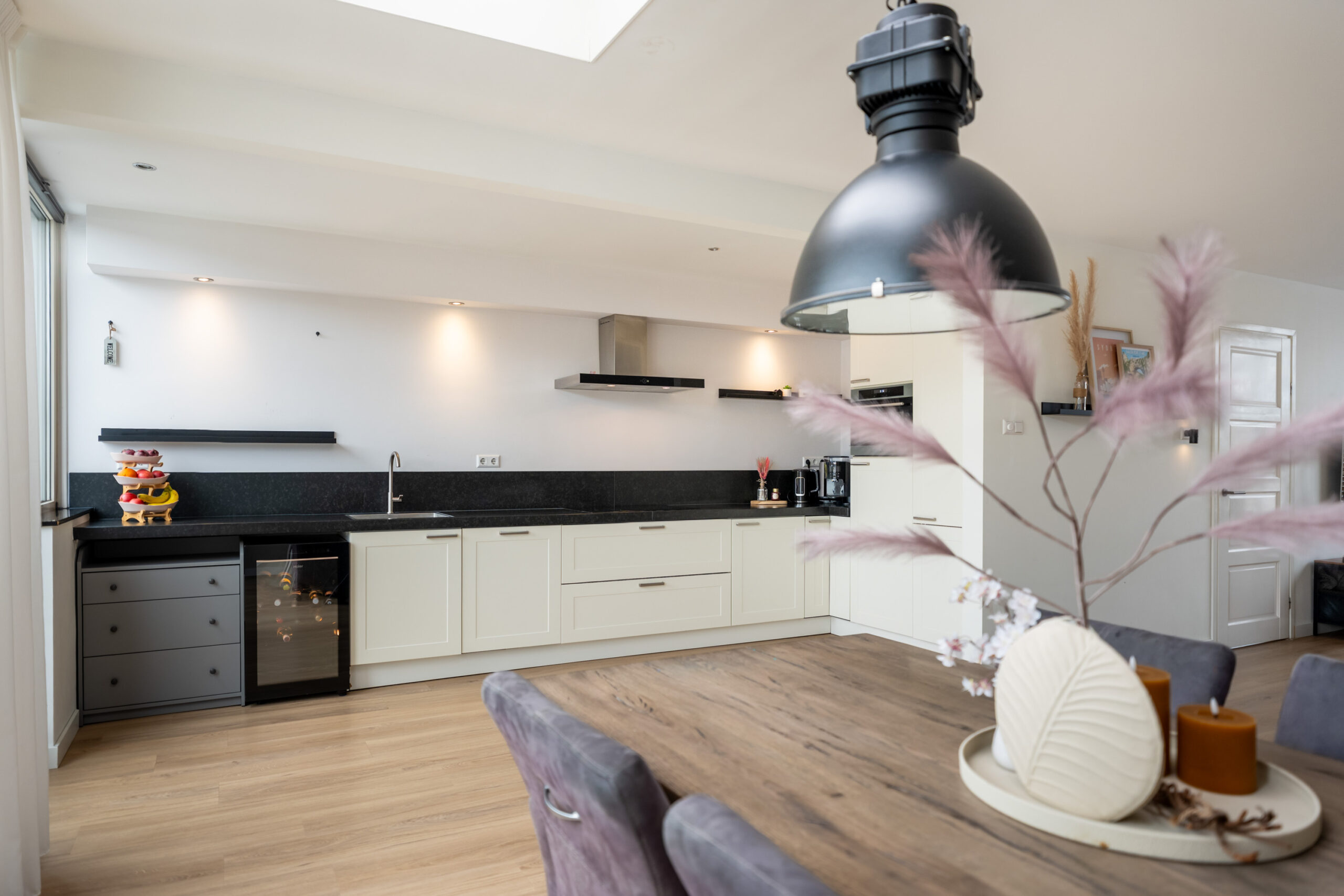 Bij binnenkomst kom je in een ruime hal met garderobe. Vanuit de hal heb je toegang tot het vrijhangende toilet, dat is voorzien van een fontein en is volledig betegeld tot aan het plafond. Vanuit de hal loop je de uitgebouwde woon-/eetkamer binnen, die circa 43 m² groot is (inclusief keuken) en is afgewerkt met een pvc-vloer, gestuukte wanden en een gestuukt plafond. De uitbouw beschikt over een lichtkoepel en een glazen pui met deuren, wat zorgt voor veel natuurlijk licht. Aan de achterzijde van de woonkamer is de ruime keuken in L-opstelling geplaatst. Deze is compleet uitgerust met een 4-pits inductiekookplaat, afzuigkap, vaatwasmachine, combi-magnetron en koel-vriescombinatie.