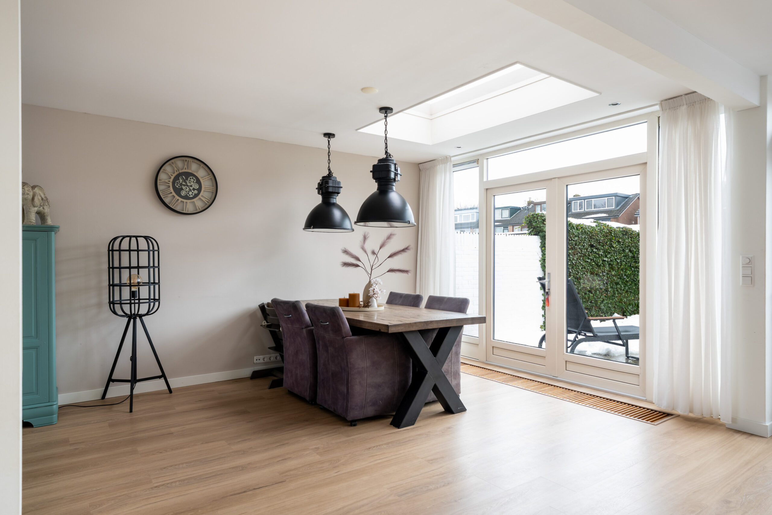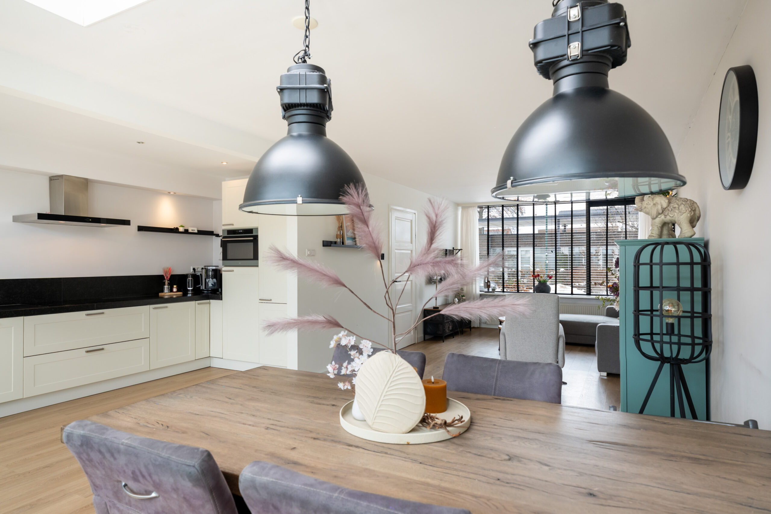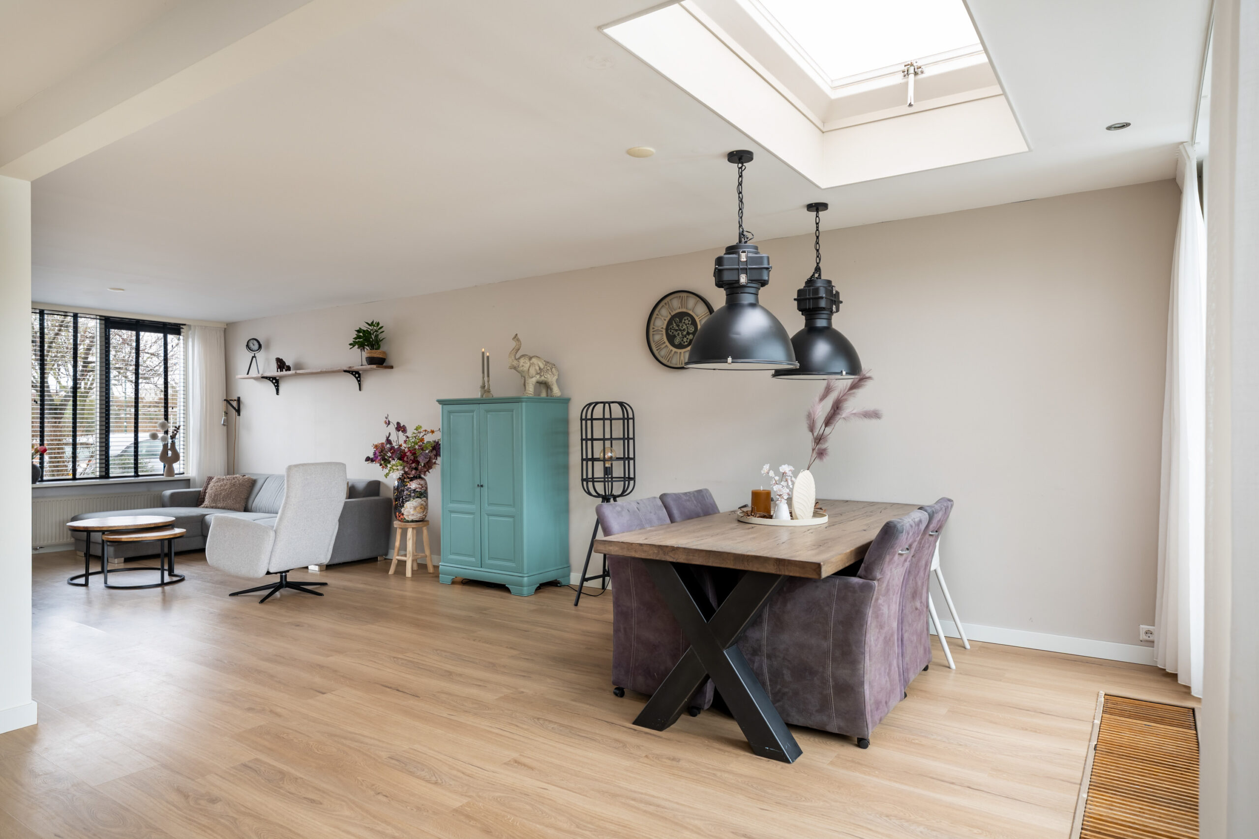 Bij binnenkomst kom je in een ruime hal met garderobe. Vanuit de hal heb je toegang tot het vrijhangende toilet, dat is voorzien van een fontein en is volledig betegeld tot aan het plafond. Vanuit de hal loop je de uitgebouwde woon-/eetkamer binnen, die circa 43 m² groot is (inclusief keuken) en is afgewerkt met een pvc-vloer, gestuukte wanden en een gestuukt plafond. De uitbouw beschikt over een lichtkoepel en een glazen pui met deuren, wat zorgt voor veel natuurlijk licht. Aan de achterzijde van de woonkamer is de ruime keuken in L-opstelling geplaatst. Deze is compleet uitgerust met een 4-pits inductiekookplaat, afzuigkap, vaatwasmachine, combi-magnetron en koel-vriescombinatie.