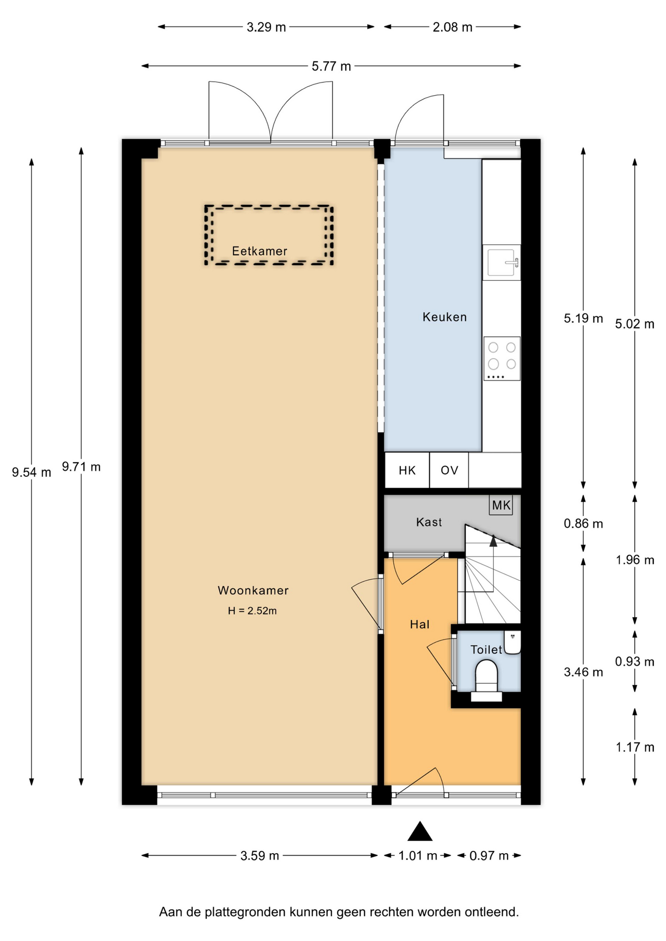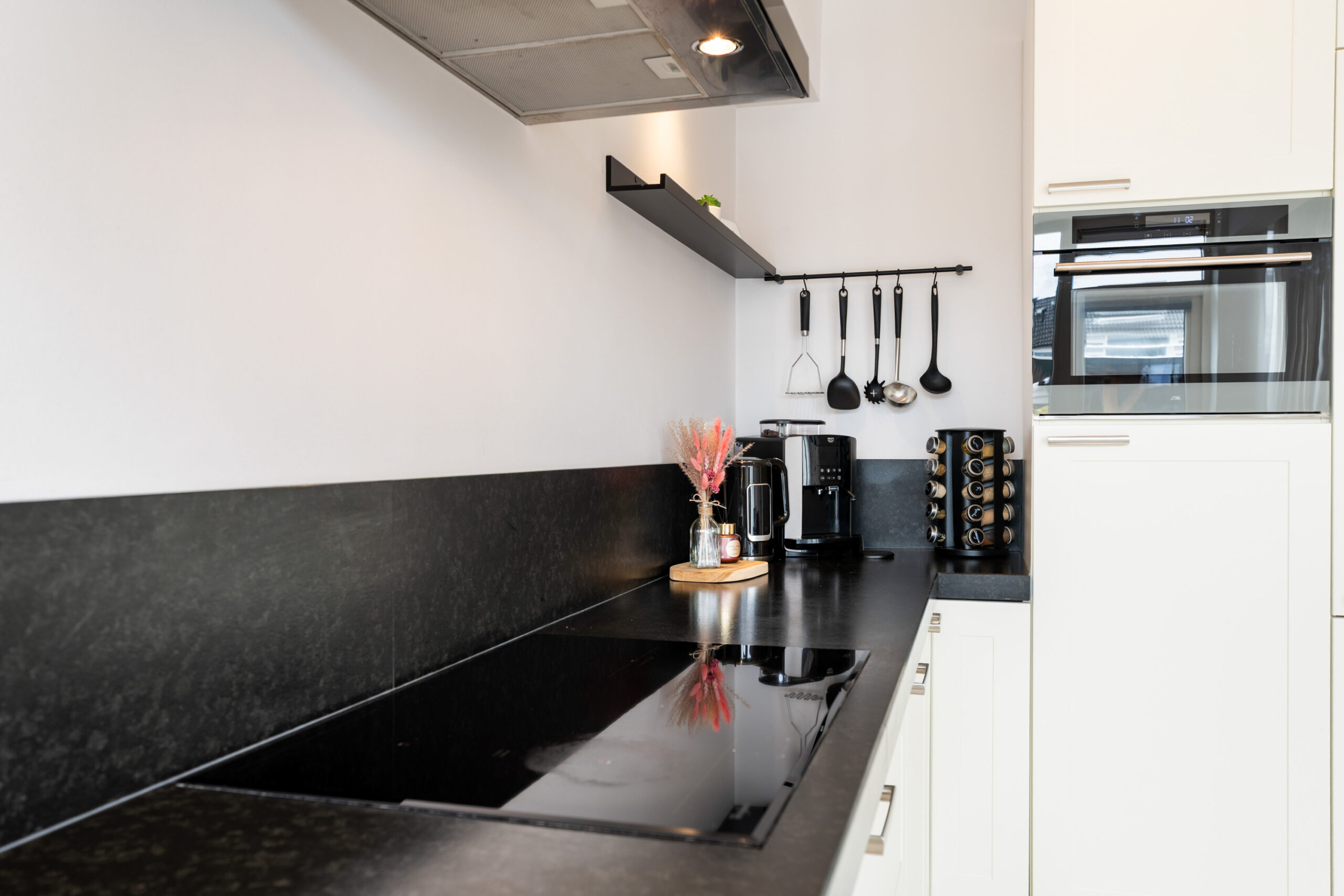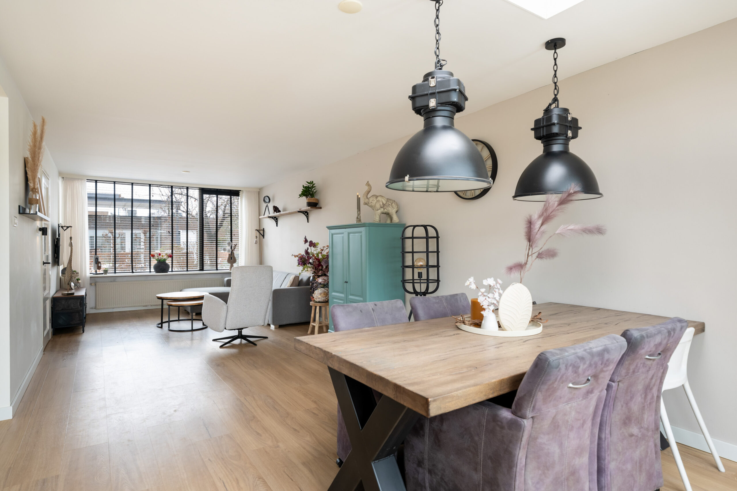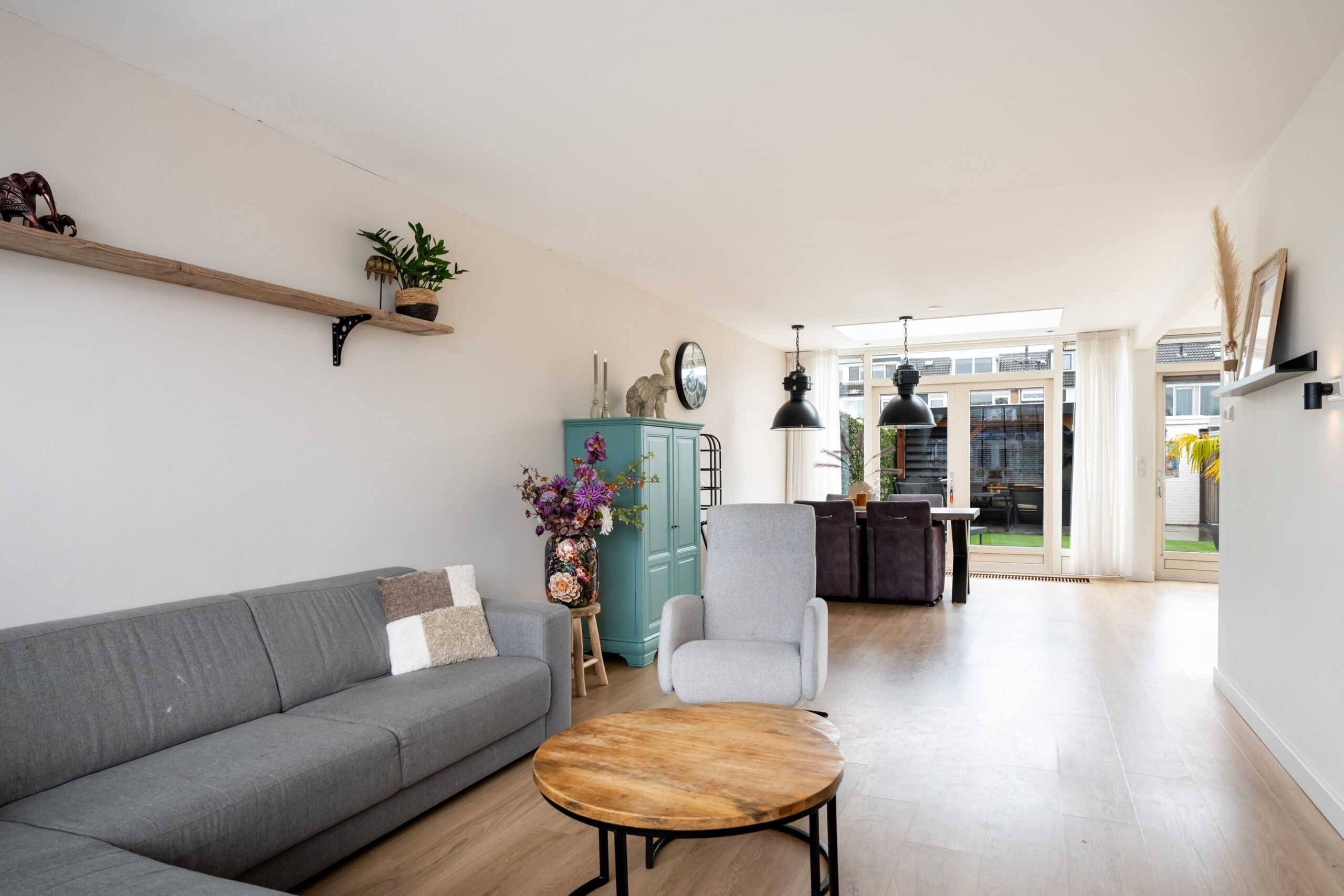 Bij binnenkomst kom je in een ruime hal met garderobe. Vanuit de hal heb je toegang tot het vrijhangende toilet, dat is voorzien van een fontein en is volledig betegeld tot aan het plafond. Vanuit de hal loop je de uitgebouwde woon-/eetkamer binnen, die circa 43 m² groot is (inclusief keuken) en is afgewerkt met een pvc-vloer, gestuukte wanden en een gestuukt plafond. De uitbouw beschikt over een lichtkoepel en een glazen pui met deuren, wat zorgt voor veel natuurlijk licht. Aan de achterzijde van de woonkamer is de ruime keuken in L-opstelling geplaatst. Deze is compleet uitgerust met een 4-pits inductiekookplaat, afzuigkap, vaatwasmachine, combi-magnetron en koel-vriescombinatie.