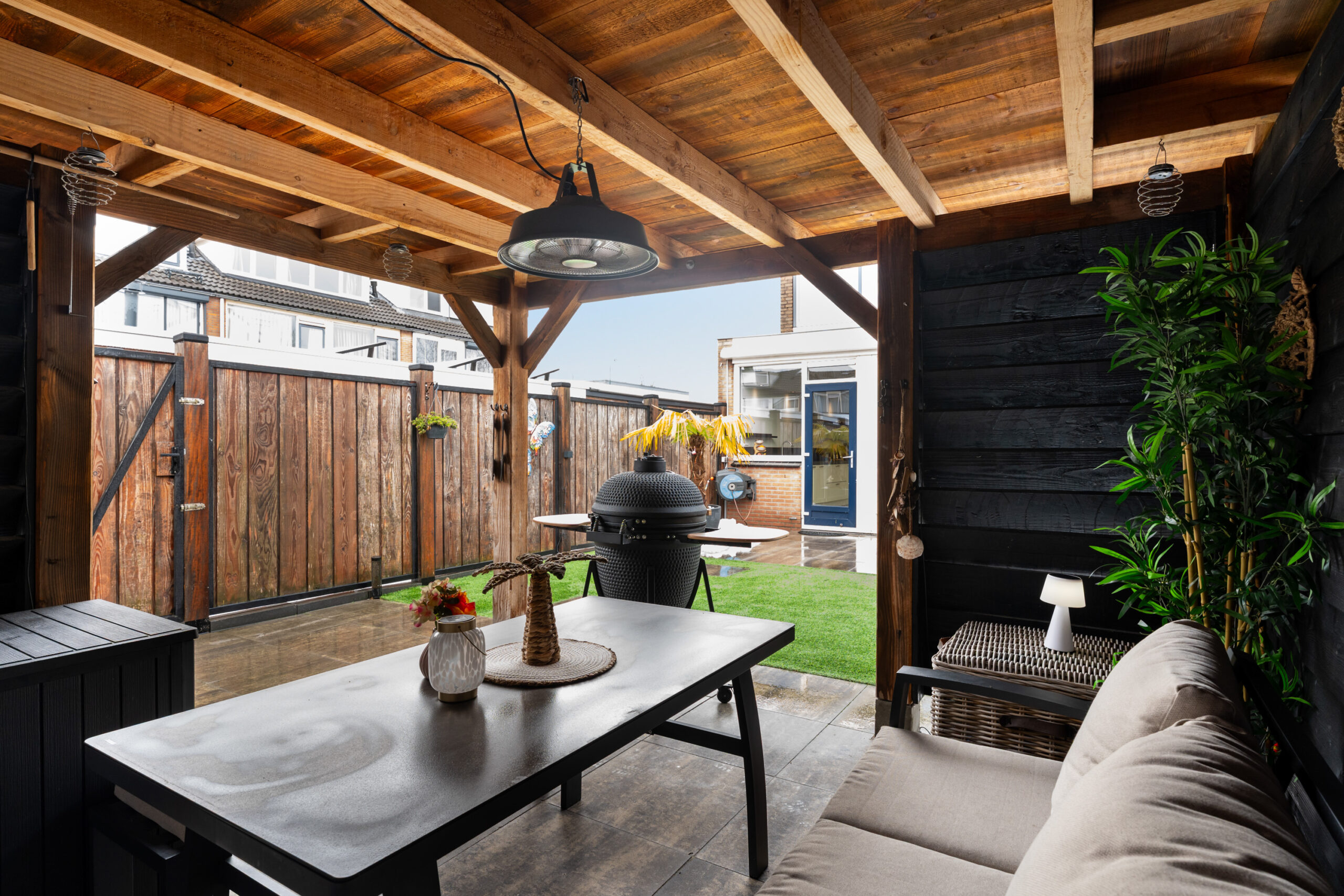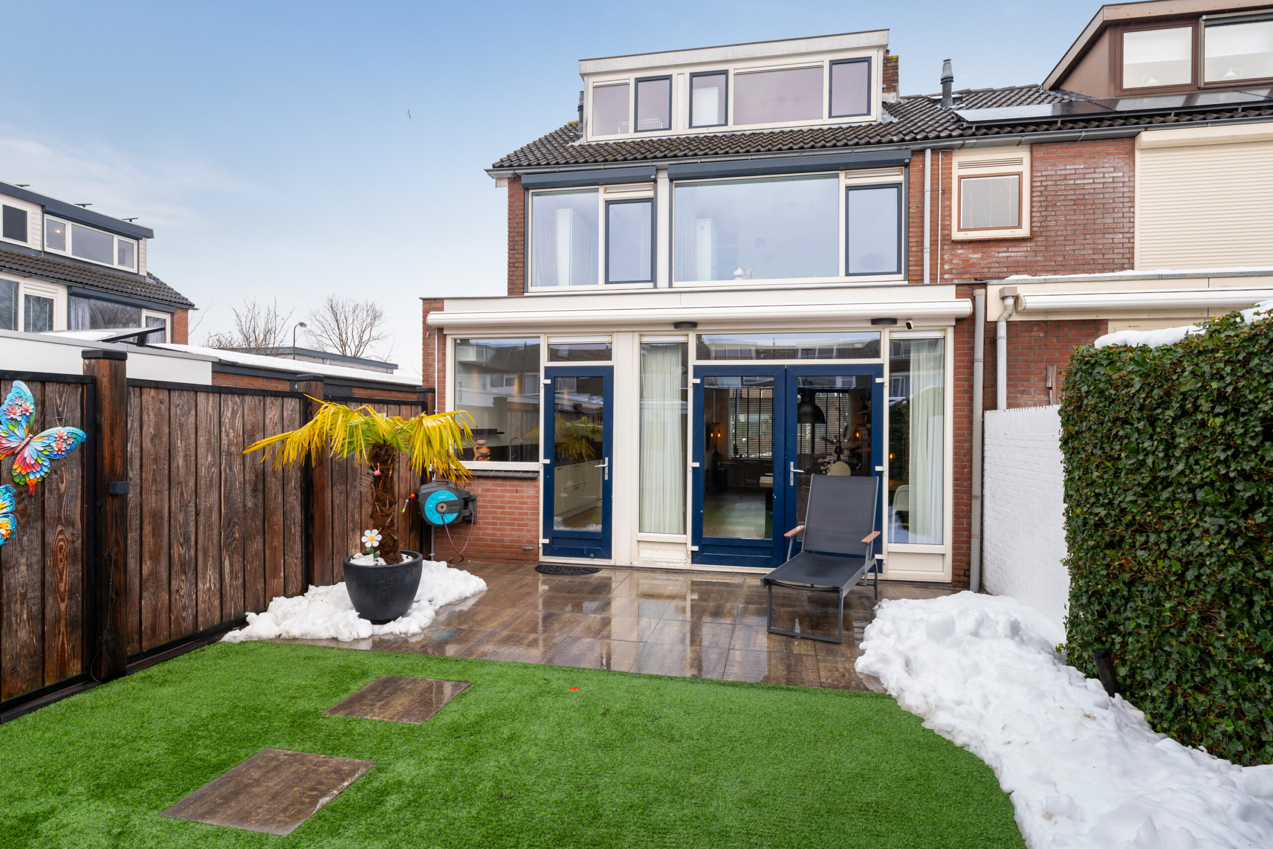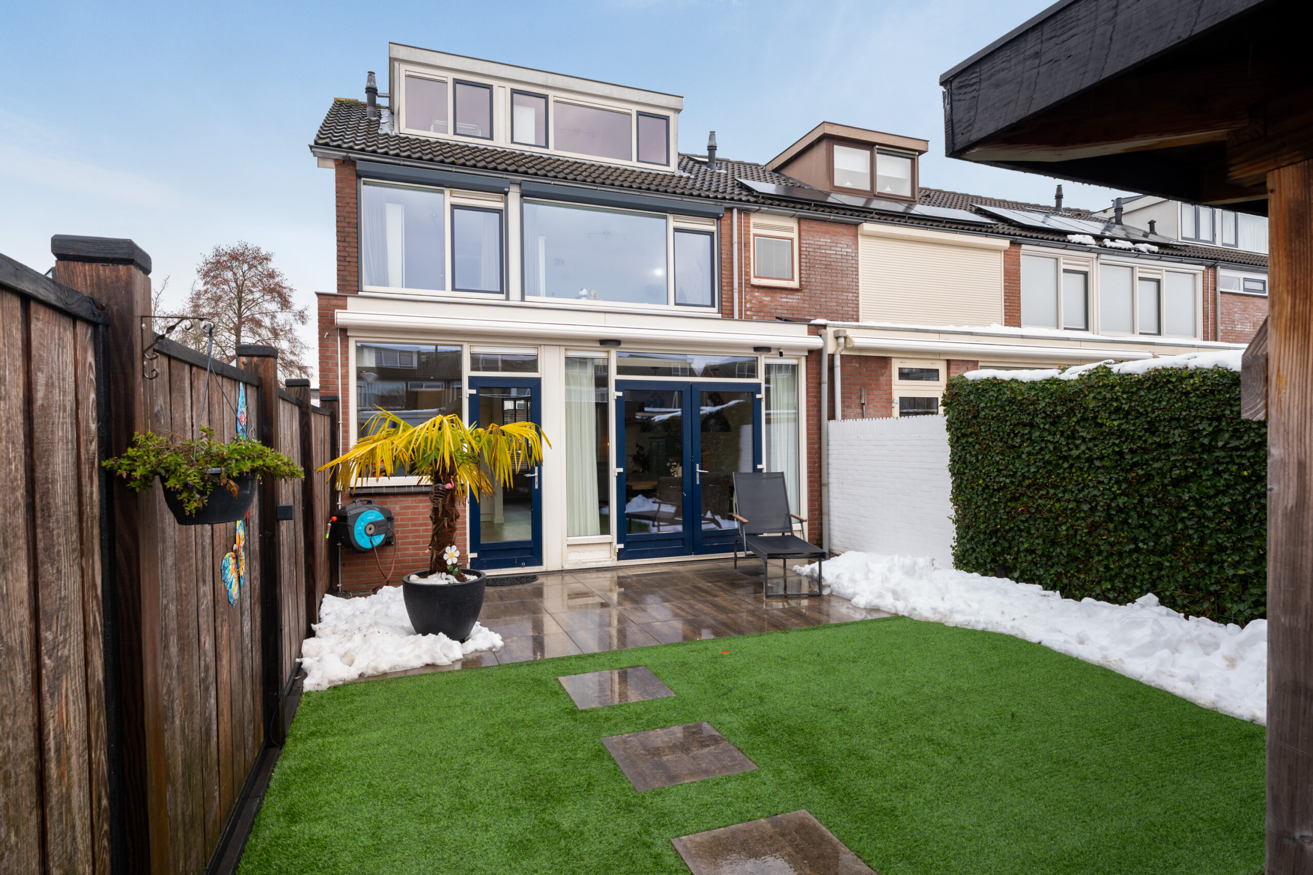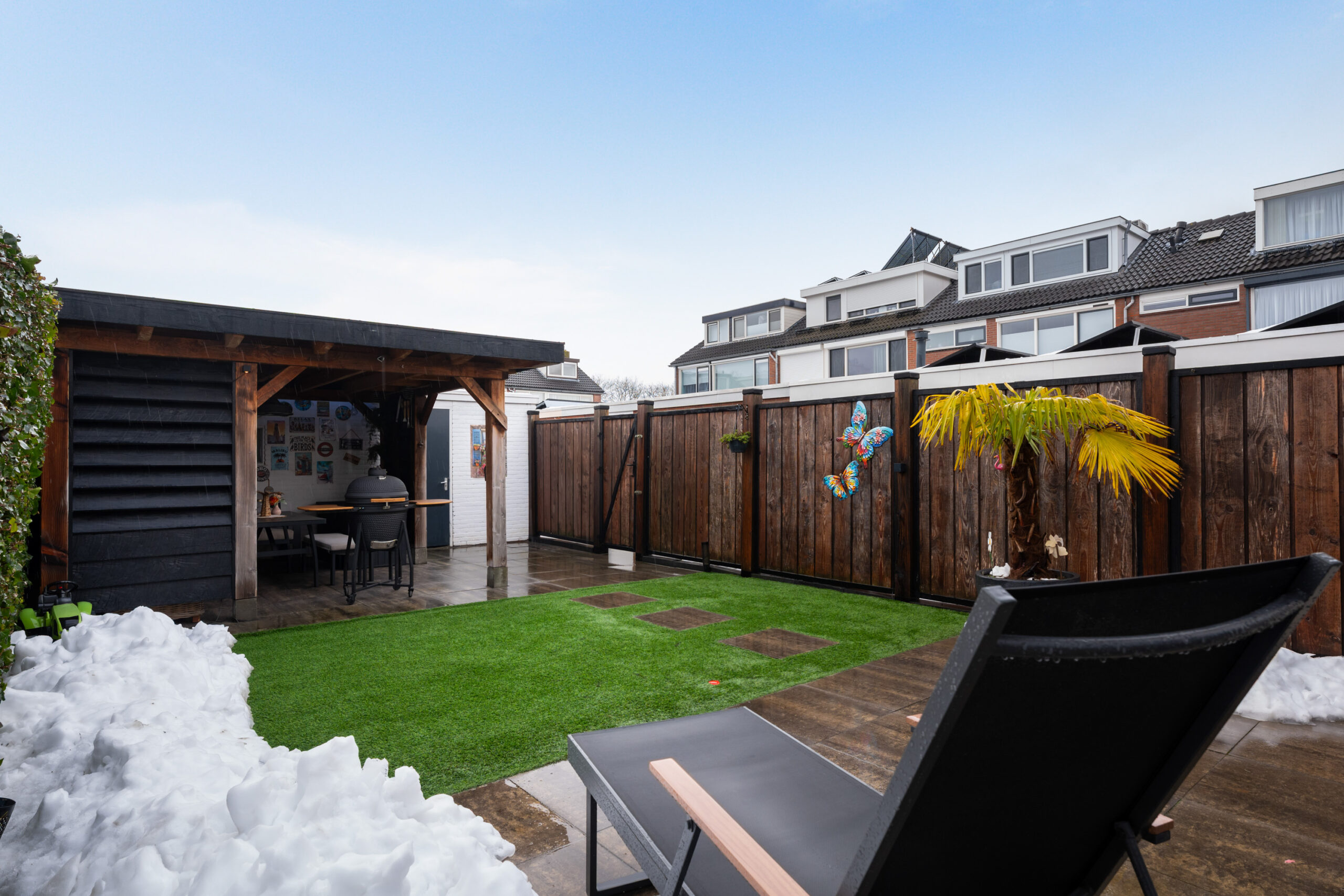 Via de openslaande deuren stap je de zonnige achtertuin op het zuiden in, die bovendien is voorzien van een achterom. De tuin heeft aan de achterzijde een stenen berging en er is een ruime veranda geplaatst.