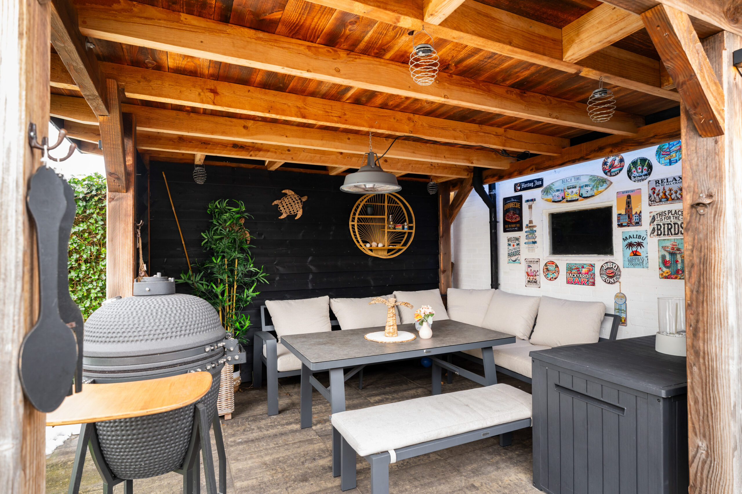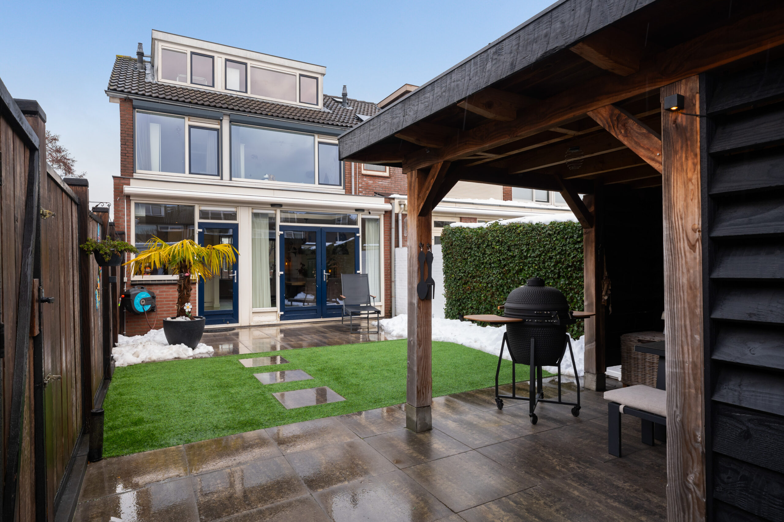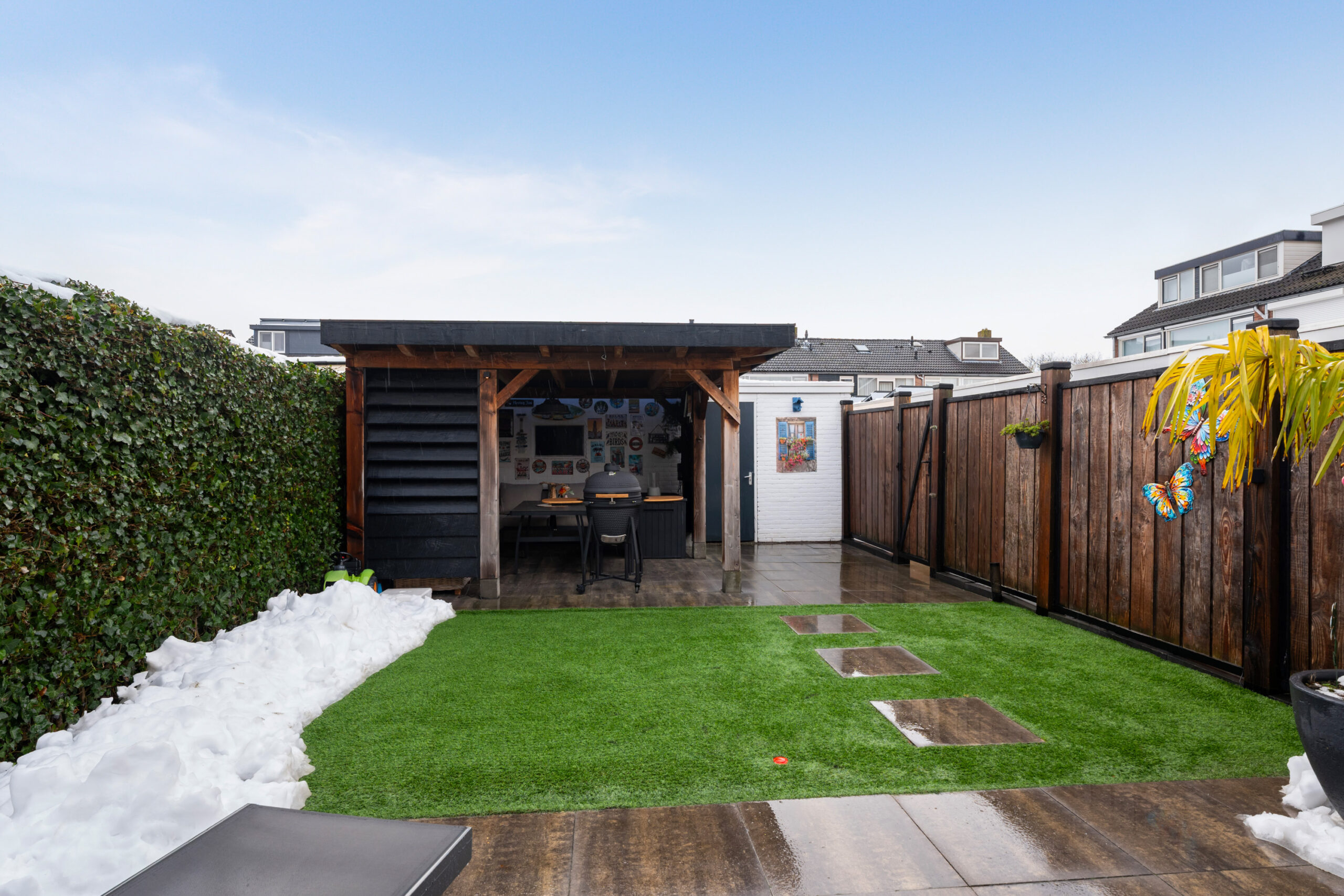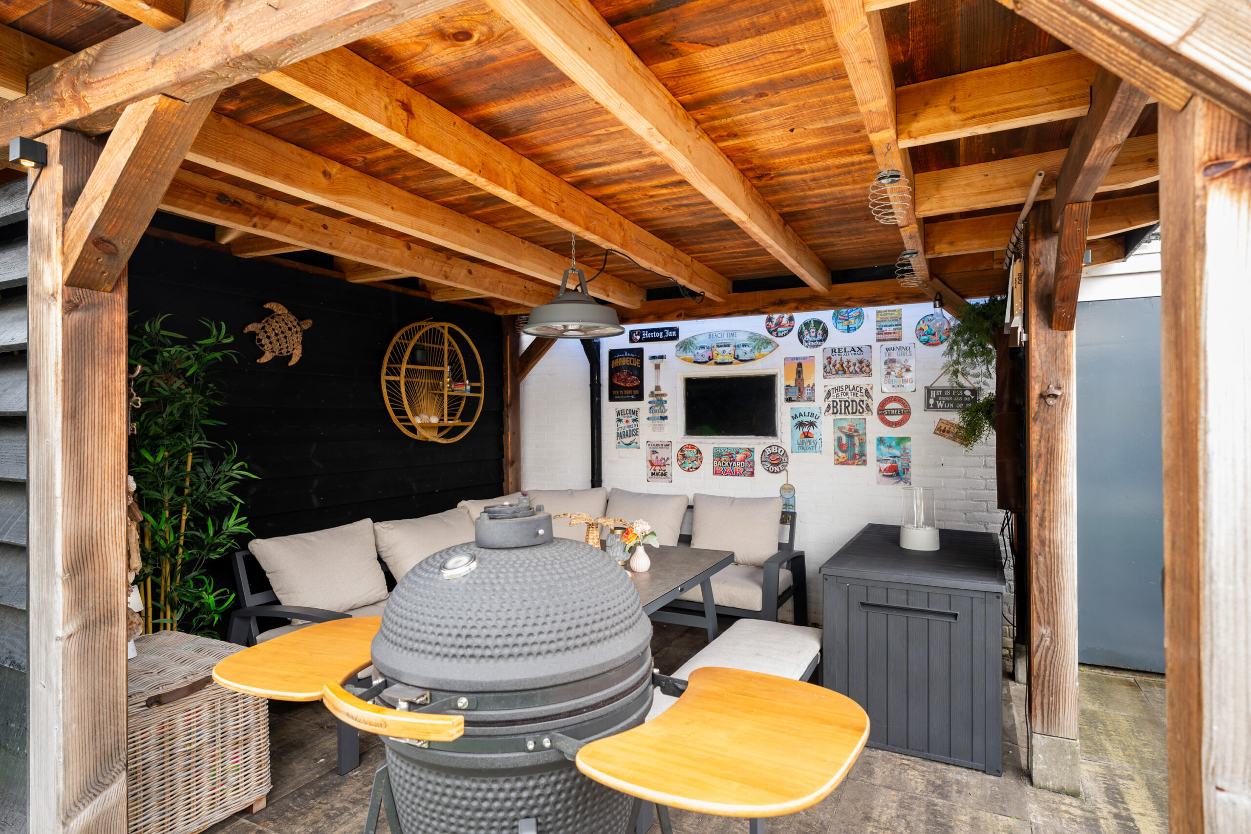 Via de openslaande deuren stap je de zonnige achtertuin op het zuiden in, die bovendien is voorzien van een achterom. De tuin heeft aan de achterzijde een stenen berging en er is een ruime veranda geplaatst.