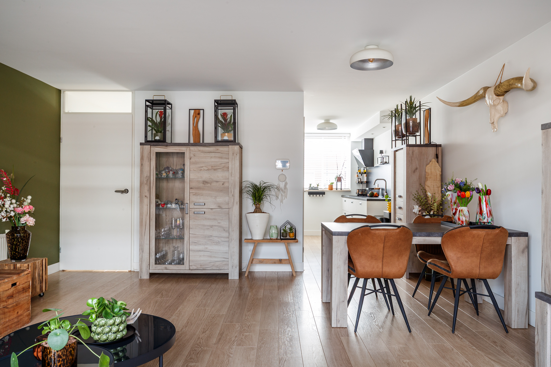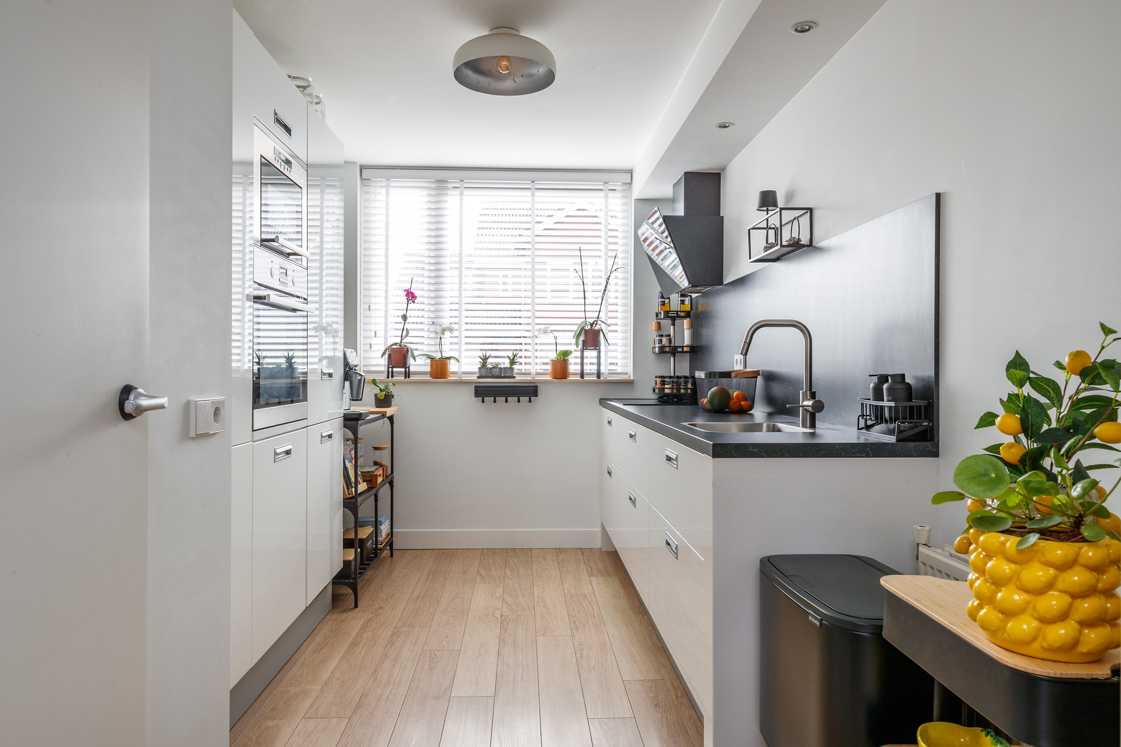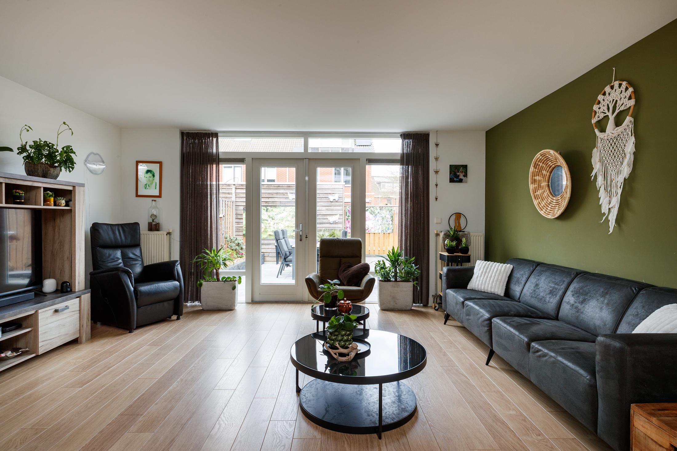 Entree met een ruime hal, die toegang geeft tot het toilet, de meterkast en de trap naar de eerste verdieping. Het toilet is in 2023 vernieuwd, uitgevoerd met een vrijhangend toilet, een fontein en is betegeld tot aan het plafond. De uitgebouwde woon- en eetkamer voelt heerlijk licht en ruim aan en staat via dubbele openslaande deuren in directe verbinding met de achtertuin. Aan de voorzijde van de woning ligt de keuken, praktisch ingericht en voorzien van een 4-pits inductiekookplaat, afzuigkap, oven, magnetron, koelkast en vaatwasmachine. Vrijwel alle apparatuur is in 2023 vernieuwd (alleen de magnetron niet) en ook de achterwand is recent aangepakt, wat zorgt voor een frisse, moderne uitstraling. De gehele begane grond is netjes afgewerkt met een laminaatvloer, strak gestuukte wanden en een glad gestuukt plafond, waardoor het geheel een verzorgde indruk maakt.