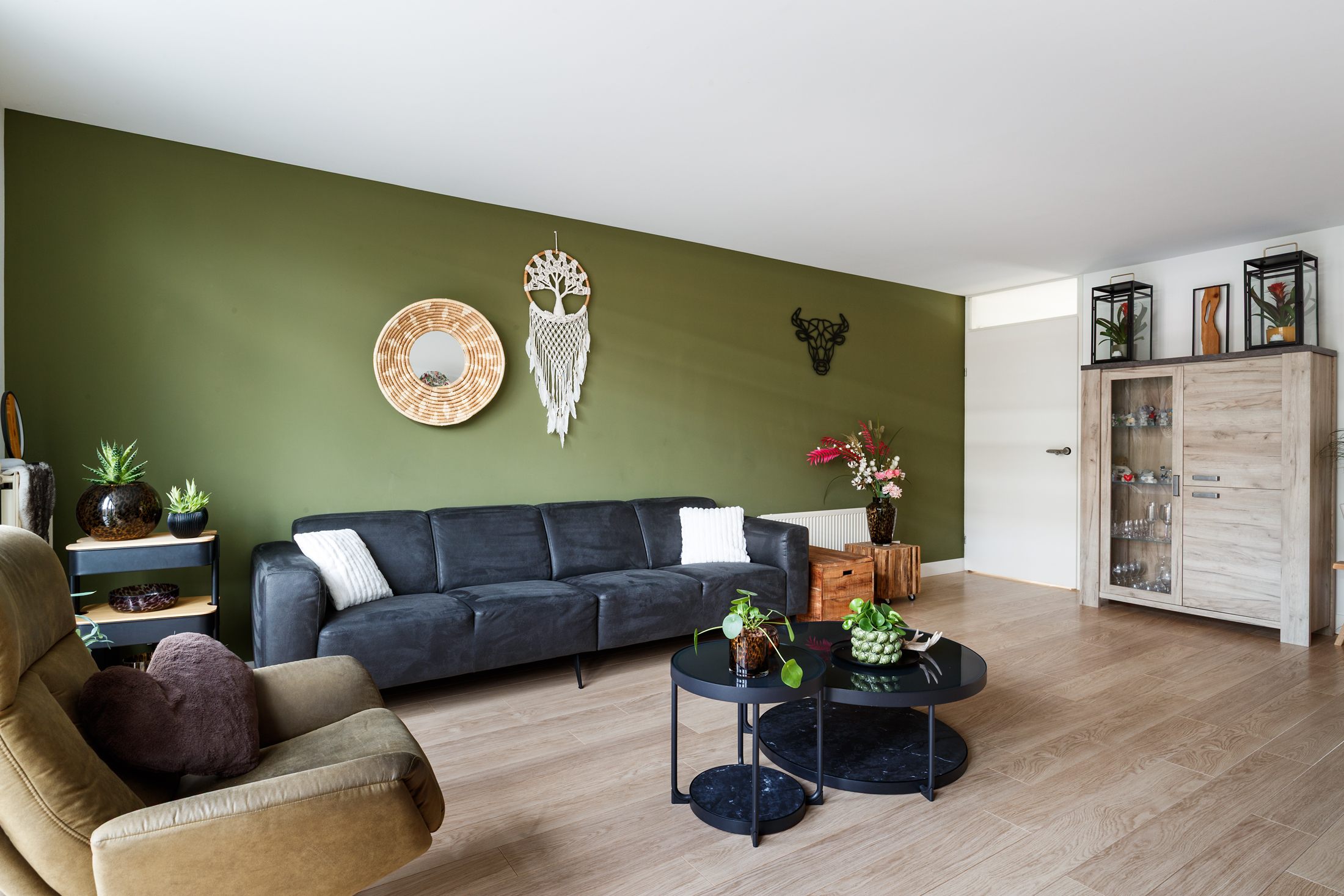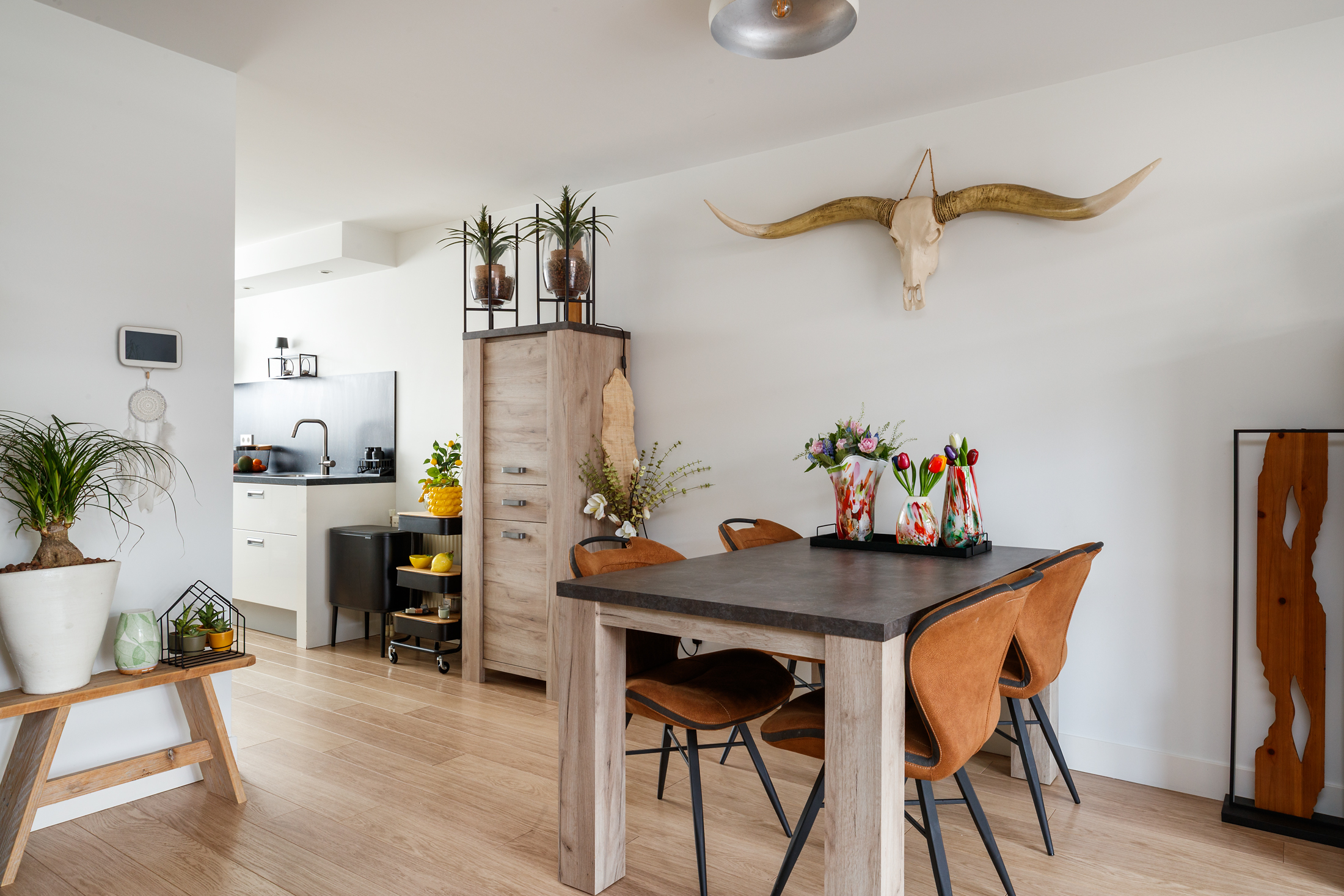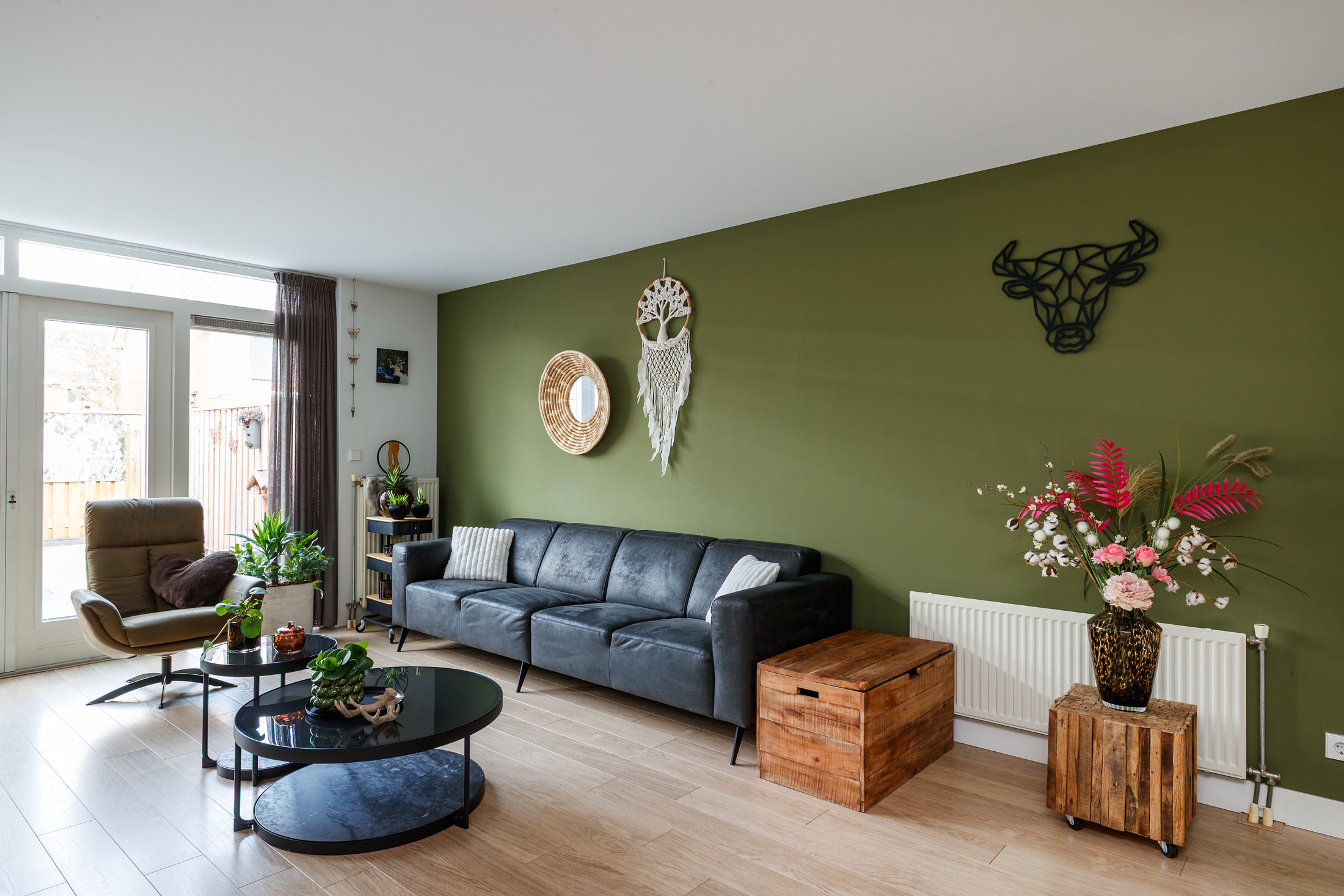Entree met een ruime hal, die toegang geeft tot het toilet, de meterkast en de trap naar de eerste verdieping. Het toilet is in 2023 vernieuwd, uitgevoerd met een vrijhangend toilet, een fontein en is betegeld tot aan het plafond. De uitgebouwde woon- en eetkamer voelt heerlijk licht en ruim aan en staat via dubbele openslaande deuren in directe verbinding met de achtertuin. Aan de voorzijde van de woning ligt de keuken, praktisch ingericht en voorzien van een 4-pits inductiekookplaat, afzuigkap, oven, magnetron, koelkast en vaatwasmachine. Vrijwel alle apparatuur is in 2023 vernieuwd (alleen de magnetron niet) en ook de achterwand is recent aangepakt, wat zorgt voor een frisse, moderne uitstraling. De gehele begane grond is netjes afgewerkt met een laminaatvloer, strak gestuukte wanden en een glad gestuukt plafond, waardoor het geheel een verzorgde indruk maakt.