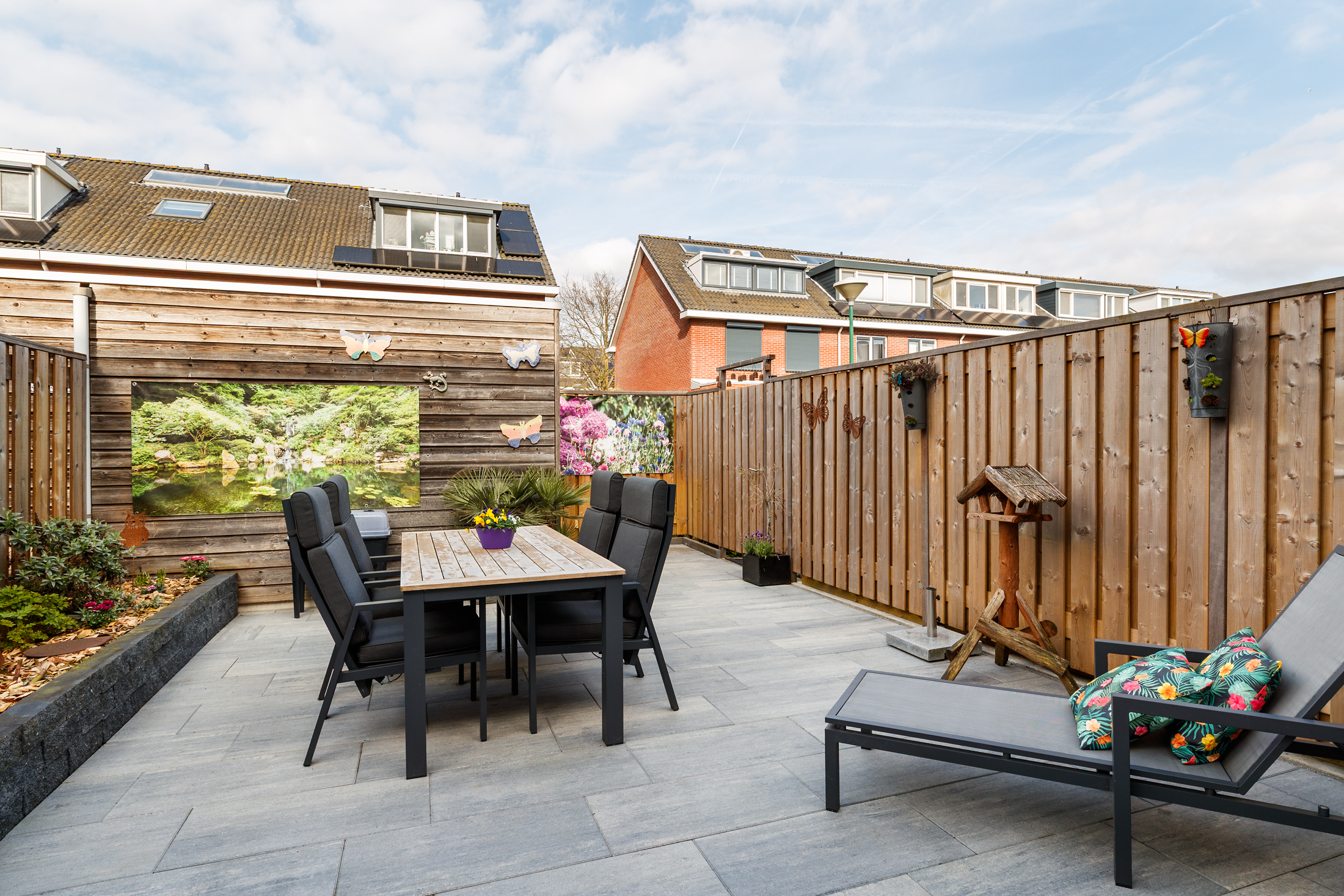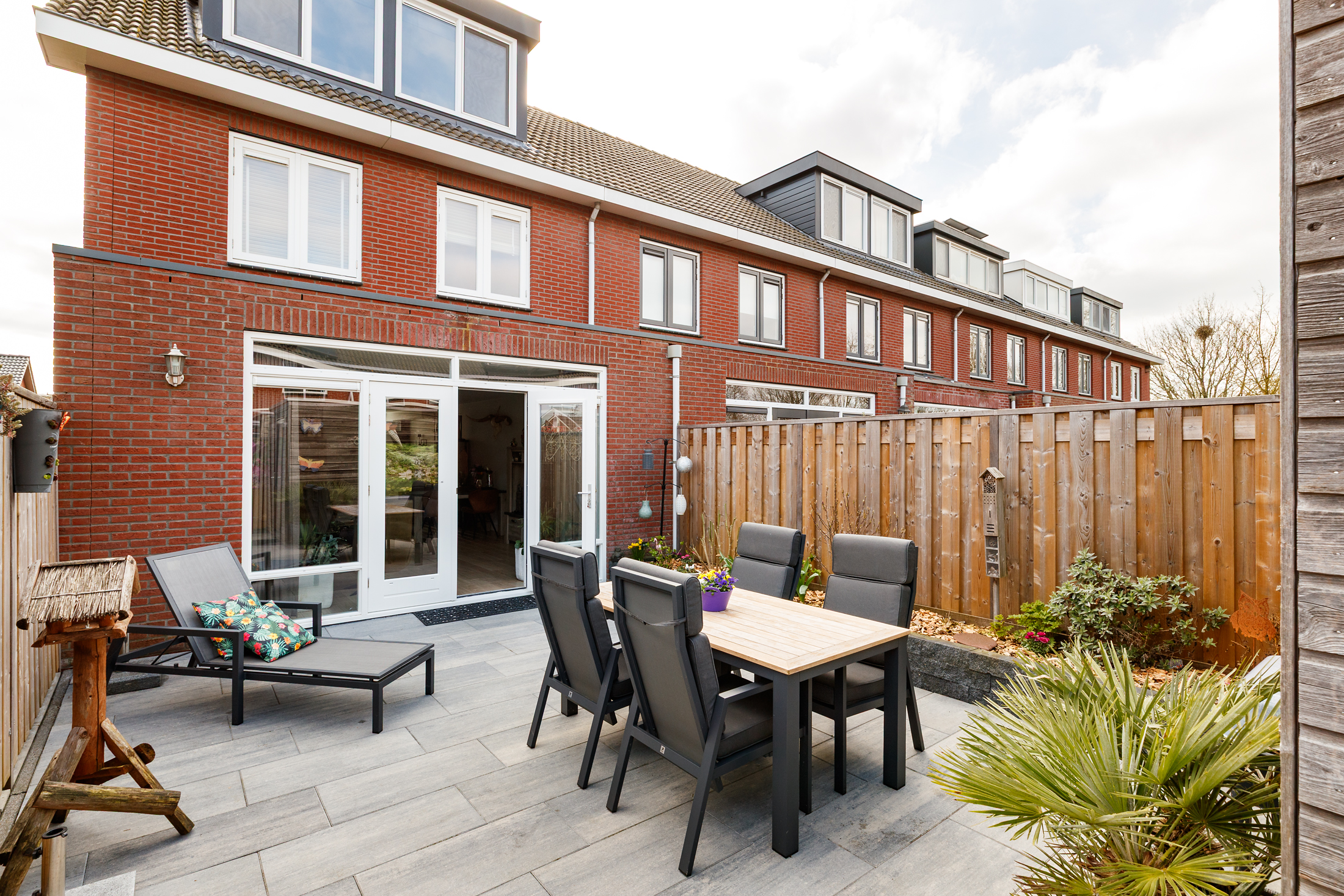 De achtertuin is in 2023 volledig vernieuwd en voorzien van een nieuwe schutting. De tuin ligt op het noorden en biedt een ruim terras en groene borders. Daarnaast is er een houten berging aanwezig en een handige achterom. De voortuin is in 2024 vernieuwd en dankzij de nieuwe inrichting is er nu voldoende ruimte om twee auto’s op eigen terrein te parkeren. Voor het opladen van een elektrische auto is er tevens een laadpaal aanwezig.