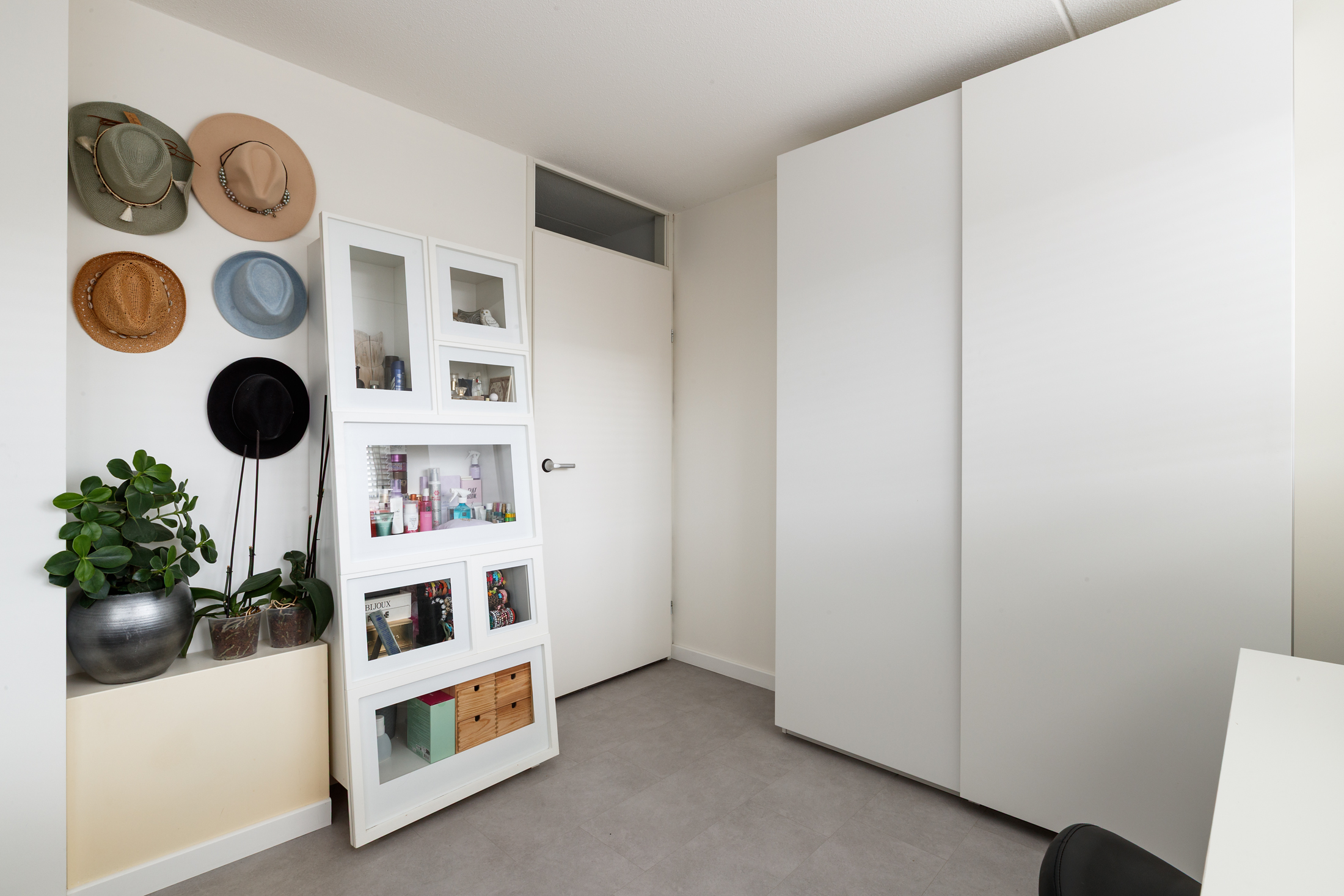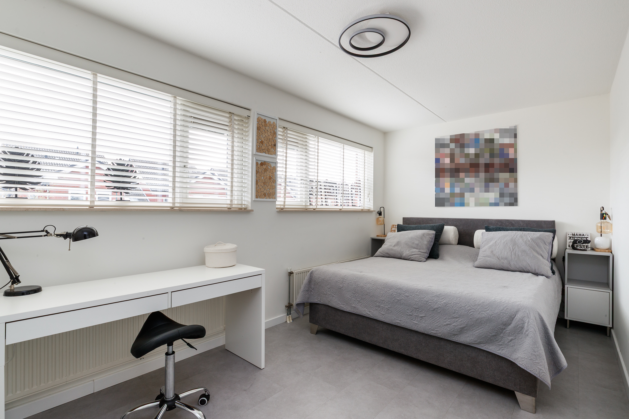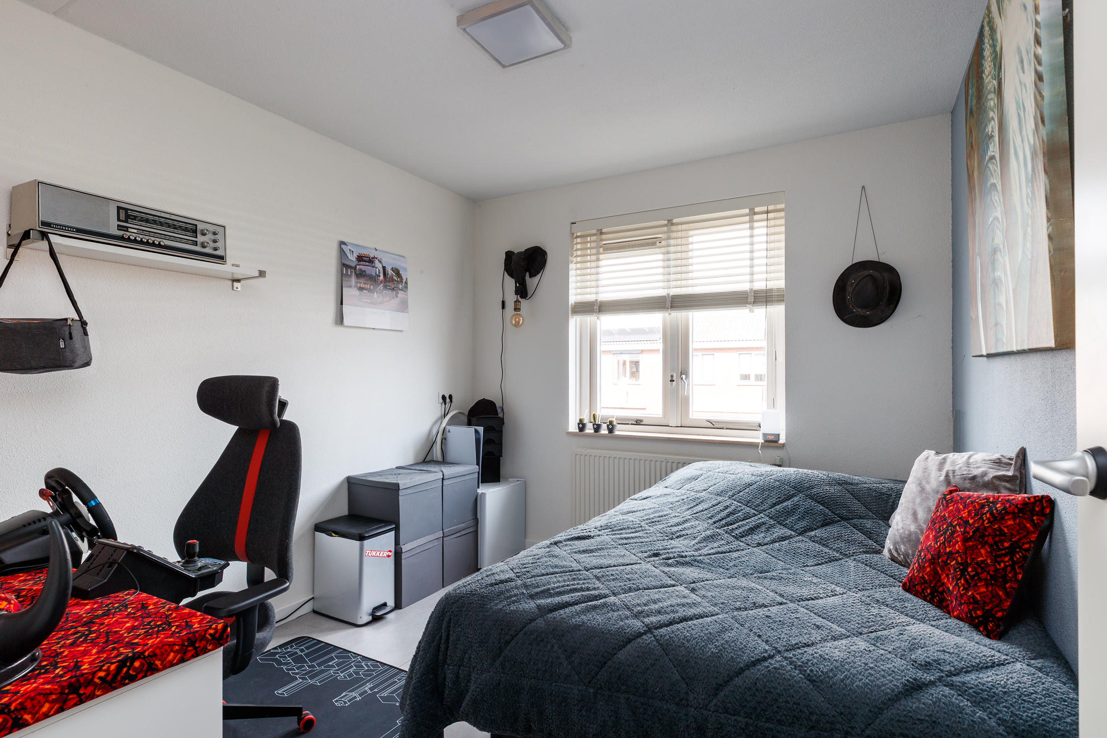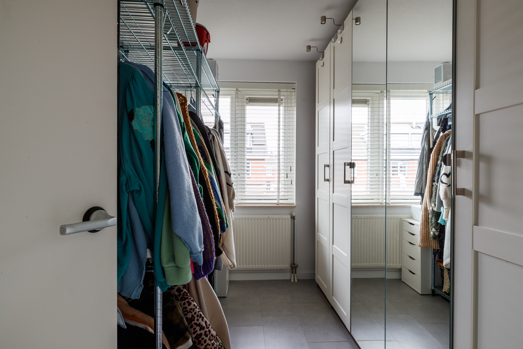 De tweede verdieping biedt aan de achterzijde een ruime slaapkamer met dakkapel, waardoor er veel licht en extra ruimte ontstaat. De kamer is afgewerkt met een PVC-vloer en gestuukte wanden, en beschikt over een eigen wastafelmeubel, dat in 2023 is vernieuwd. Aan de voorzijde van deze verdieping bevindt zich een ruime berging, waarin de opstelplaats voor de wasmachine en droger is geïntegreerd. Daarnaast zijn hier de cv-combiketel en zonneboiler geplaatst, keurig weggewerkt en goed bereikbaar. Tevens is op deze verdieping een airco aanwezig die zowel koelt als verwarmt.