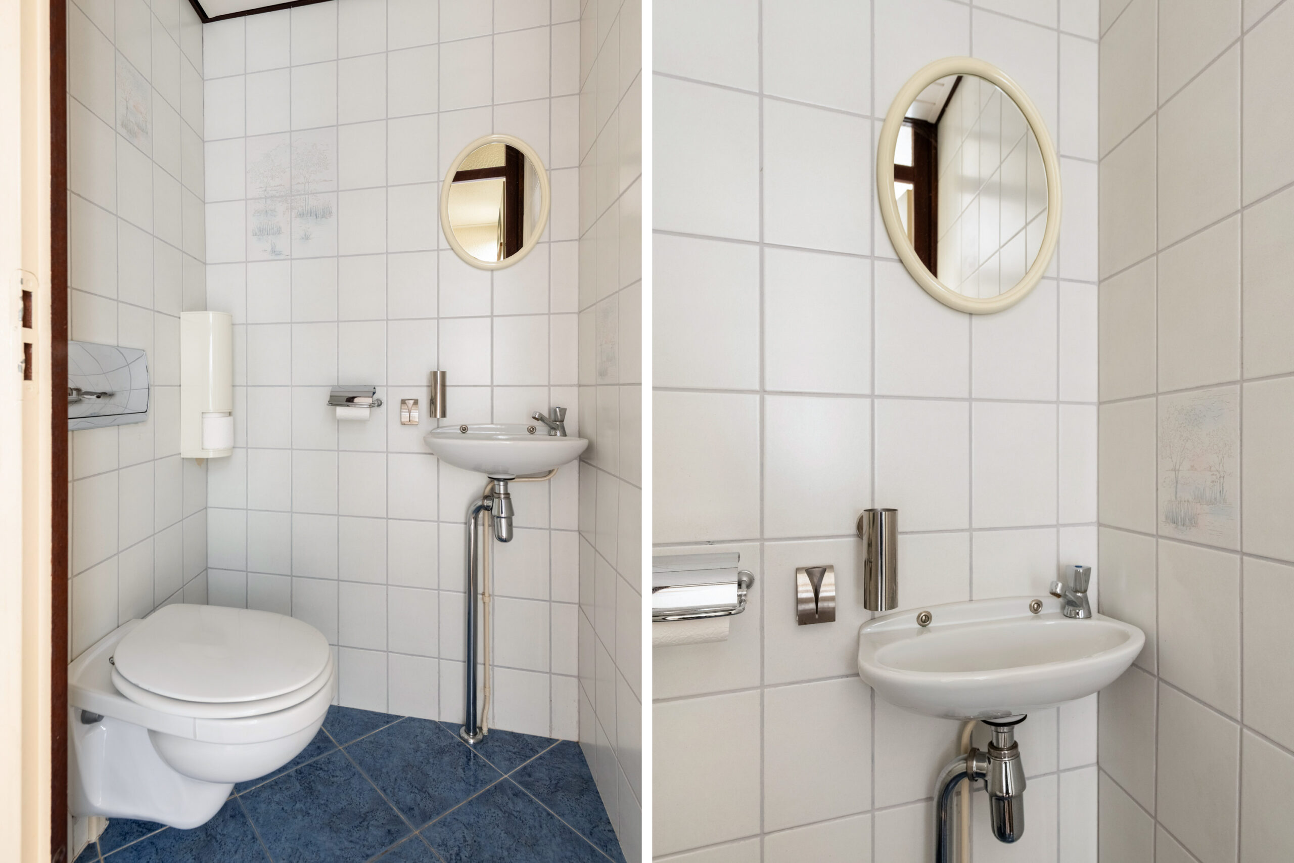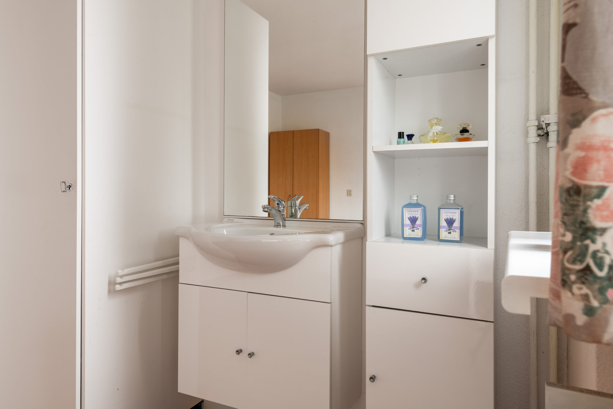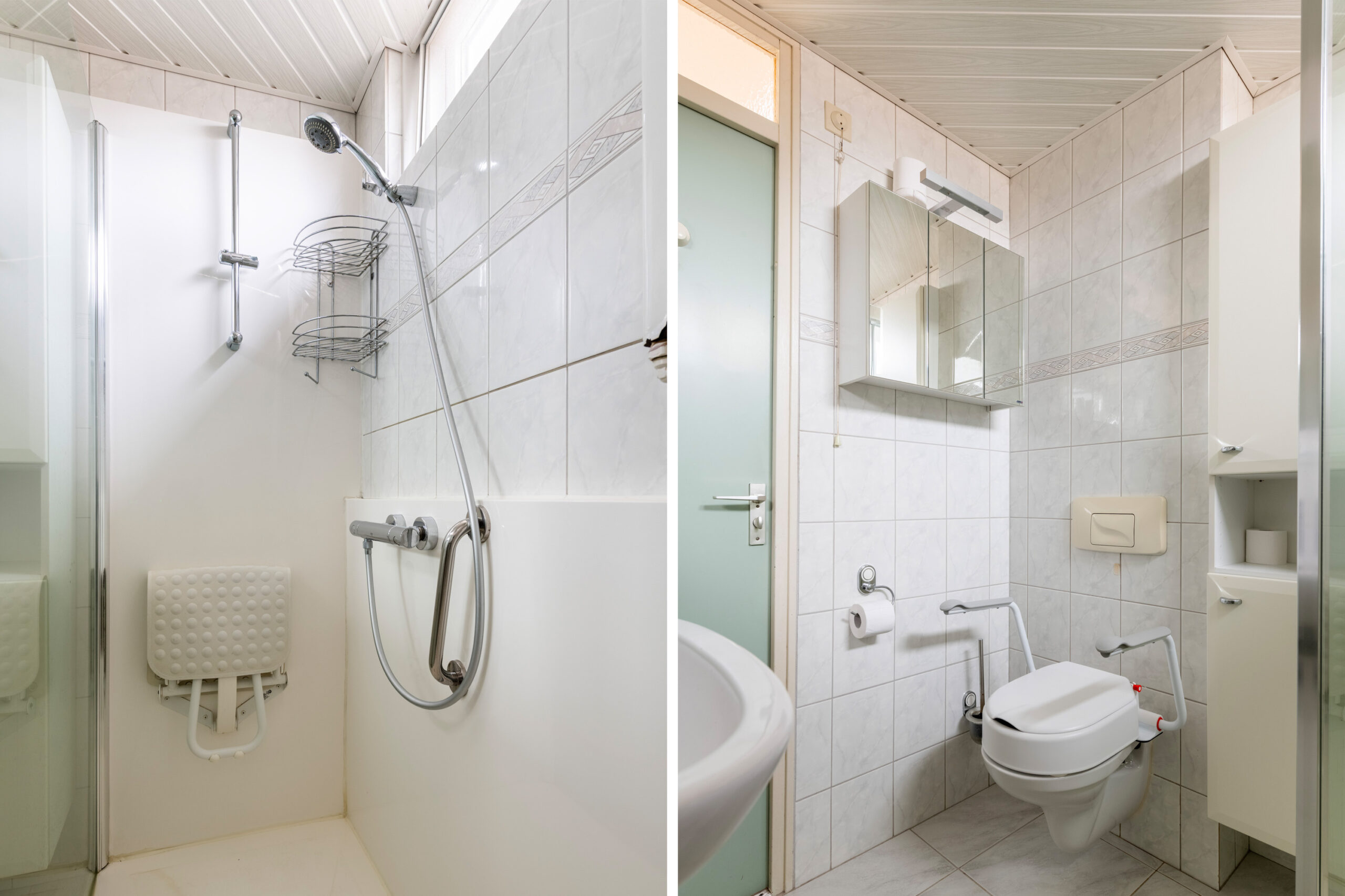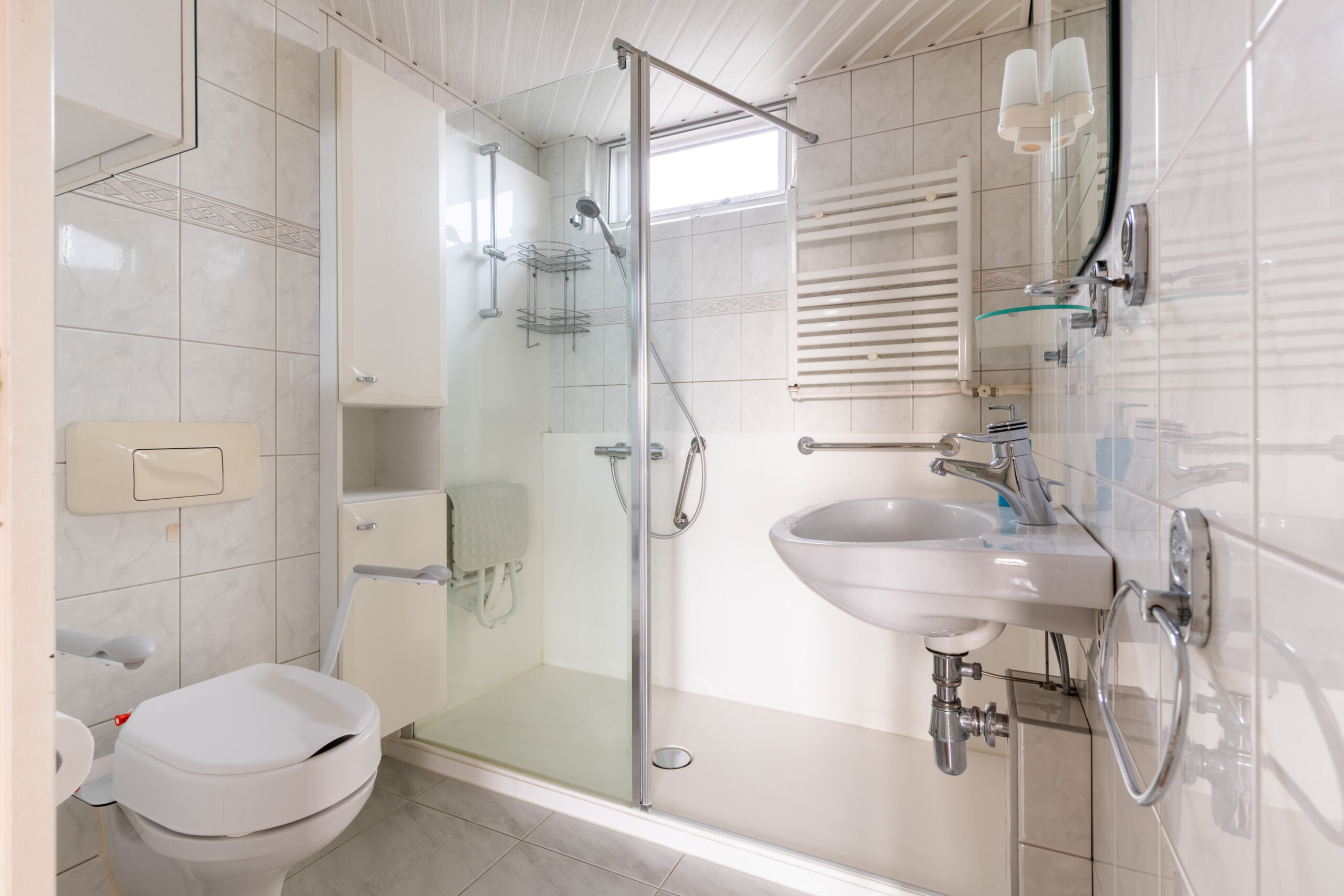 De badkamer is volledig betegeld tot aan het plafond.
