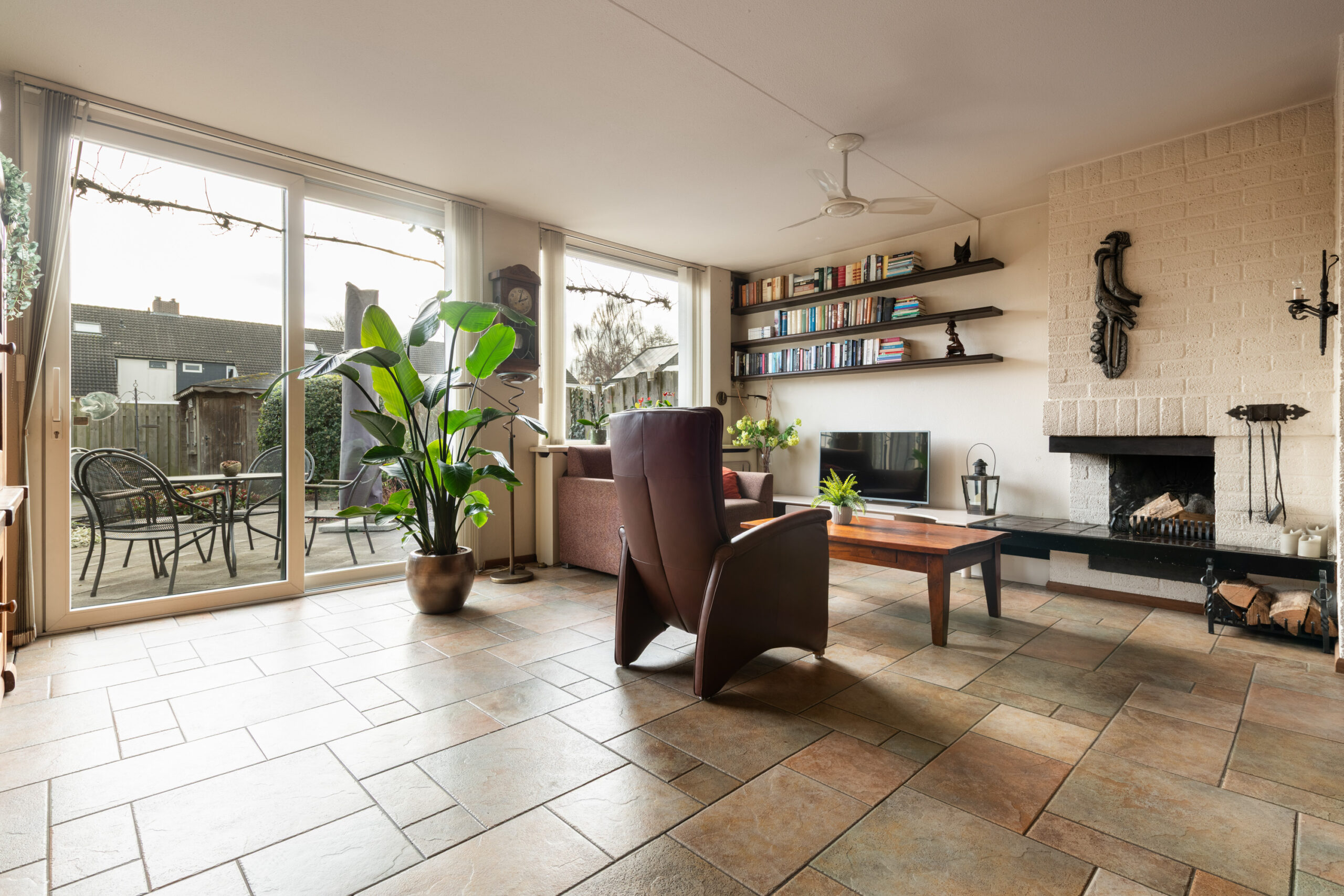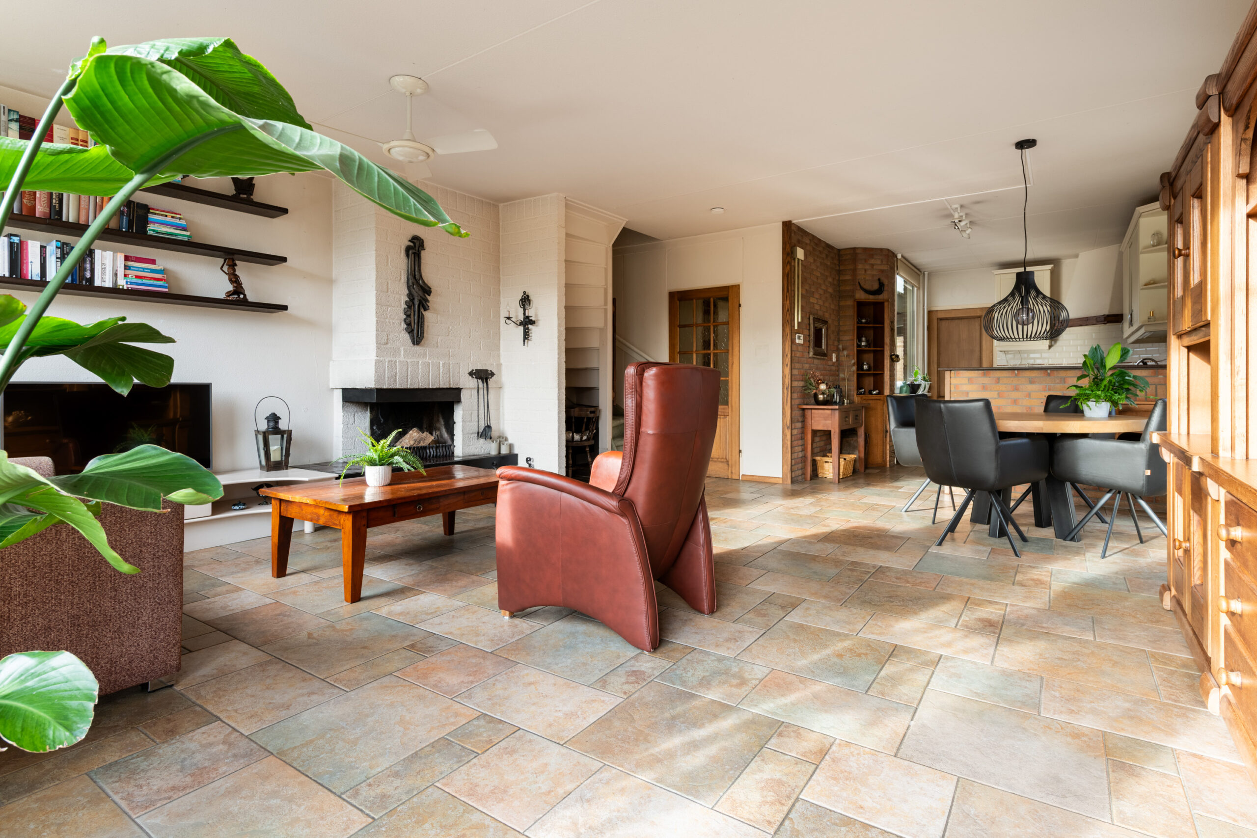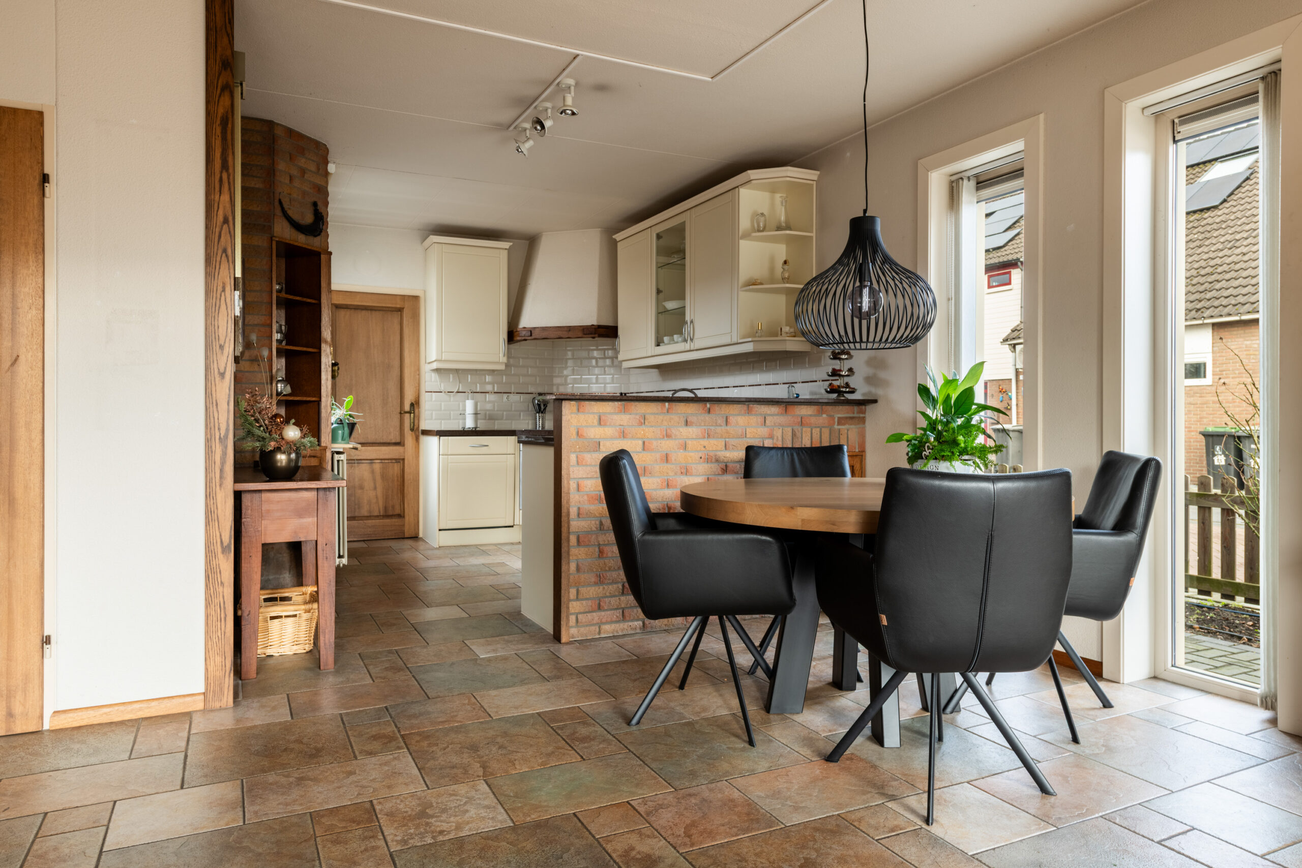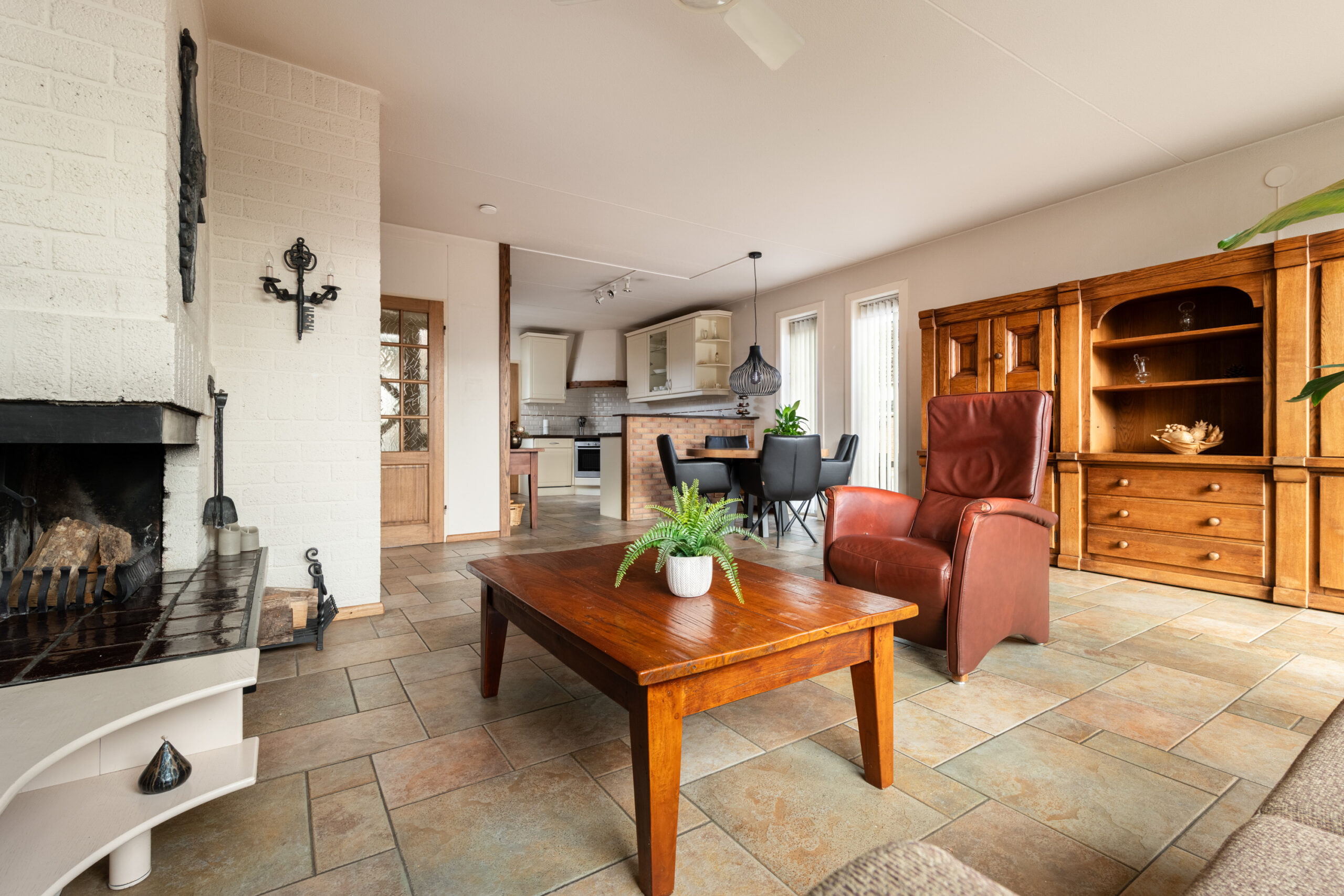 Entree met hal, meterkast en het toilet. Het toilet is vrijhangend en voorzien van een fontein, het geheel is tot het plafond betegeld. Vanuit de hal loop je door naar de ruime woon-/eetkamer, een prettige leefruimte die dankzij de grote raampartijen en het extra zijraam heerlijk licht is. De woonkamer is gericht op de achtertuin en straalt sfeer uit door de open haard. De stenen vloer met vloerverwarming zorgt voor extra comfort en maakt het geheel helemaal af. Aan de voorzijde van de woning bevindt zich de keuken, deze is uitgerust met een 4-pits keramische kookplaat, afzuigkap, koelkast en een vaatwasmachine. De aanbouw aan de voorzijde, die in 2005 is vergroot, biedt extra ruimte en mogelijkheden. Deze is volledig geïsoleerd, beschikt over een extra zijraam, een dakraam en vloerverwarming. Tevens is er een wateraansluiting (koudwater) met afvoer aanwezig zodat hier ook een wasmachine en droger aangesloten kunnen worden. Een fijne multifunctionele ruimte die je naar eigen wens kunt gebruiken.