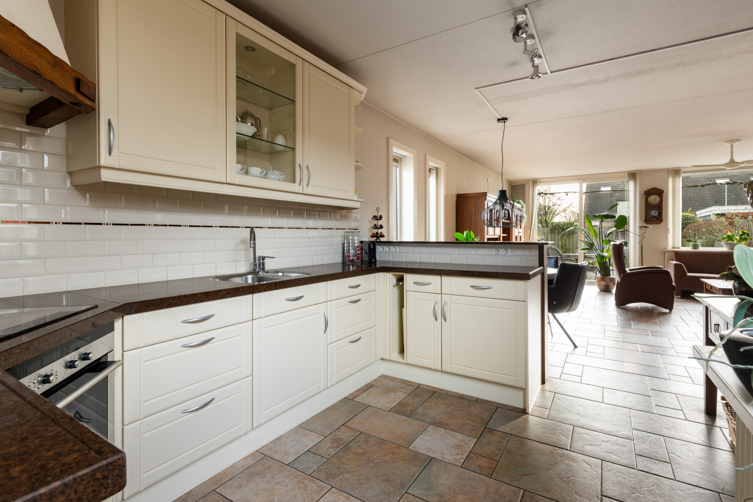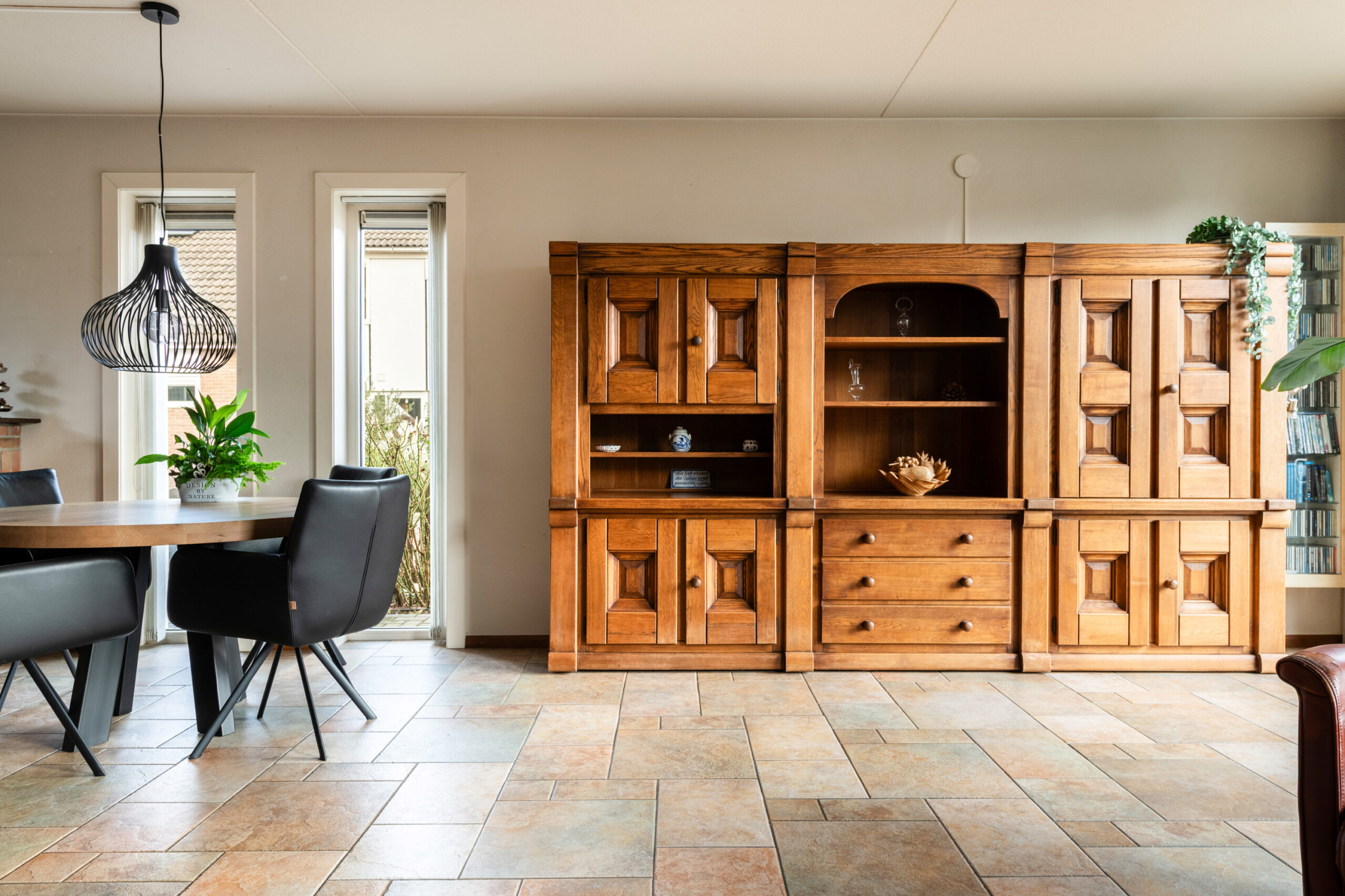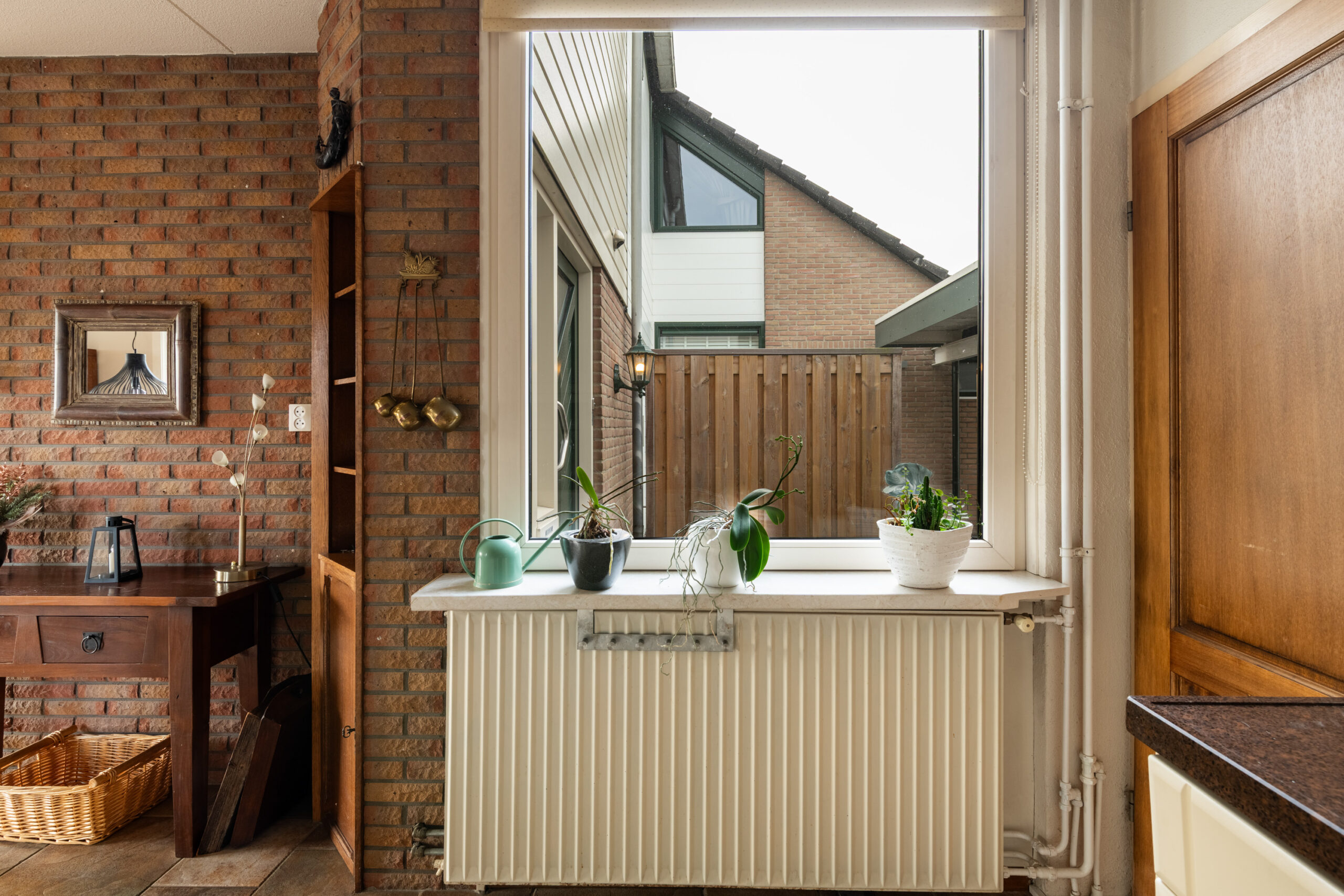 Entree met hal, meterkast en het toilet. Het toilet is vrijhangend en voorzien van een fontein, het geheel is tot het plafond betegeld. Vanuit de hal loop je door naar de ruime woon-/eetkamer, een prettige leefruimte die dankzij de grote raampartijen en het extra zijraam heerlijk licht is. De woonkamer is gericht op de achtertuin en straalt sfeer uit door de open haard. De stenen vloer met vloerverwarming zorgt voor extra comfort en maakt het geheel helemaal af. Aan de voorzijde van de woning bevindt zich de keuken, deze is uitgerust met een 4-pits keramische kookplaat, afzuigkap, koelkast en een vaatwasmachine. De aanbouw aan de voorzijde, die in 2005 is vergroot, biedt extra ruimte en mogelijkheden. Deze is volledig geïsoleerd, beschikt over een extra zijraam, een dakraam en vloerverwarming. Tevens is er een wateraansluiting (koudwater) met afvoer aanwezig zodat hier ook een wasmachine en droger aangesloten kunnen worden. Een fijne multifunctionele ruimte die je naar eigen wens kunt gebruiken.