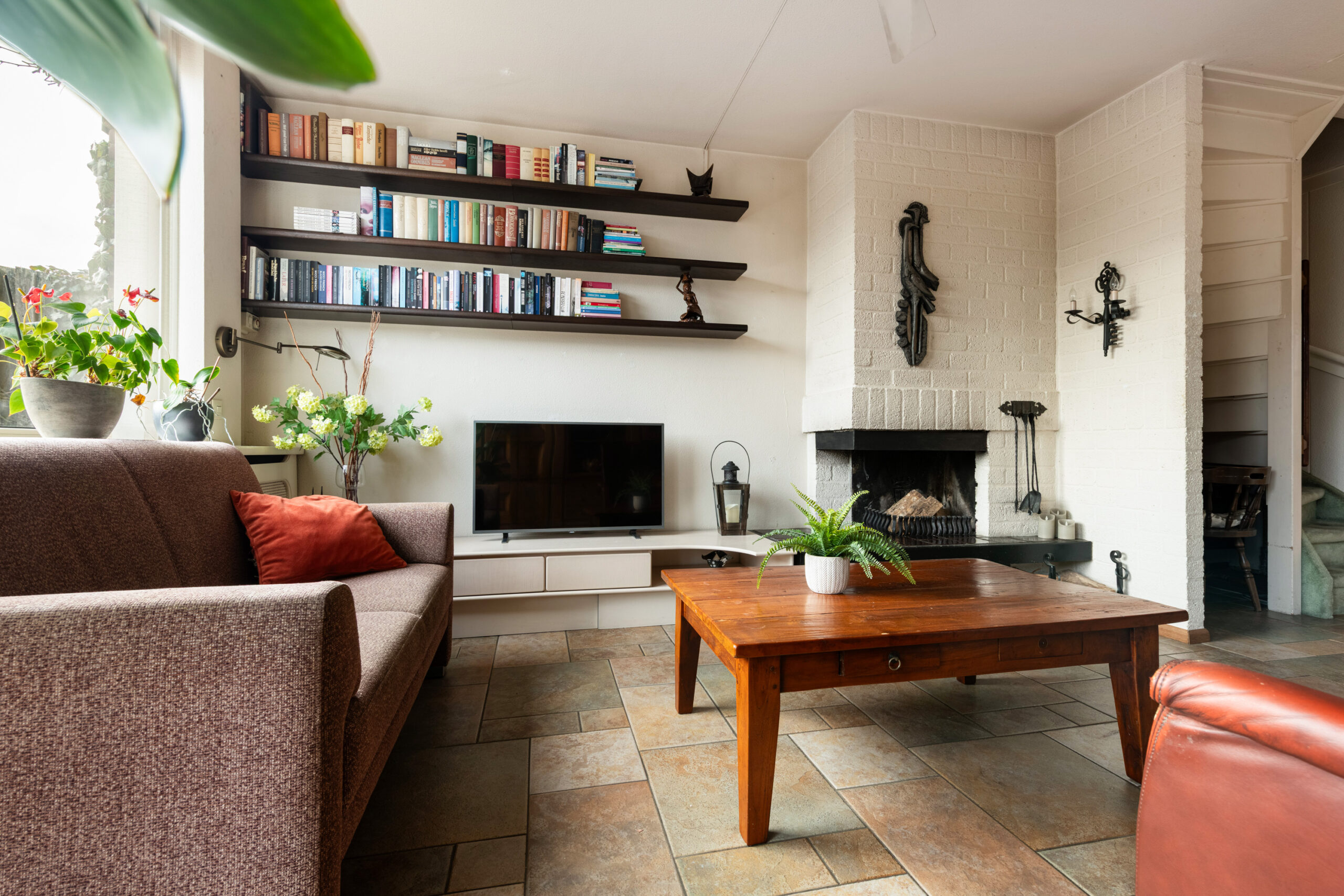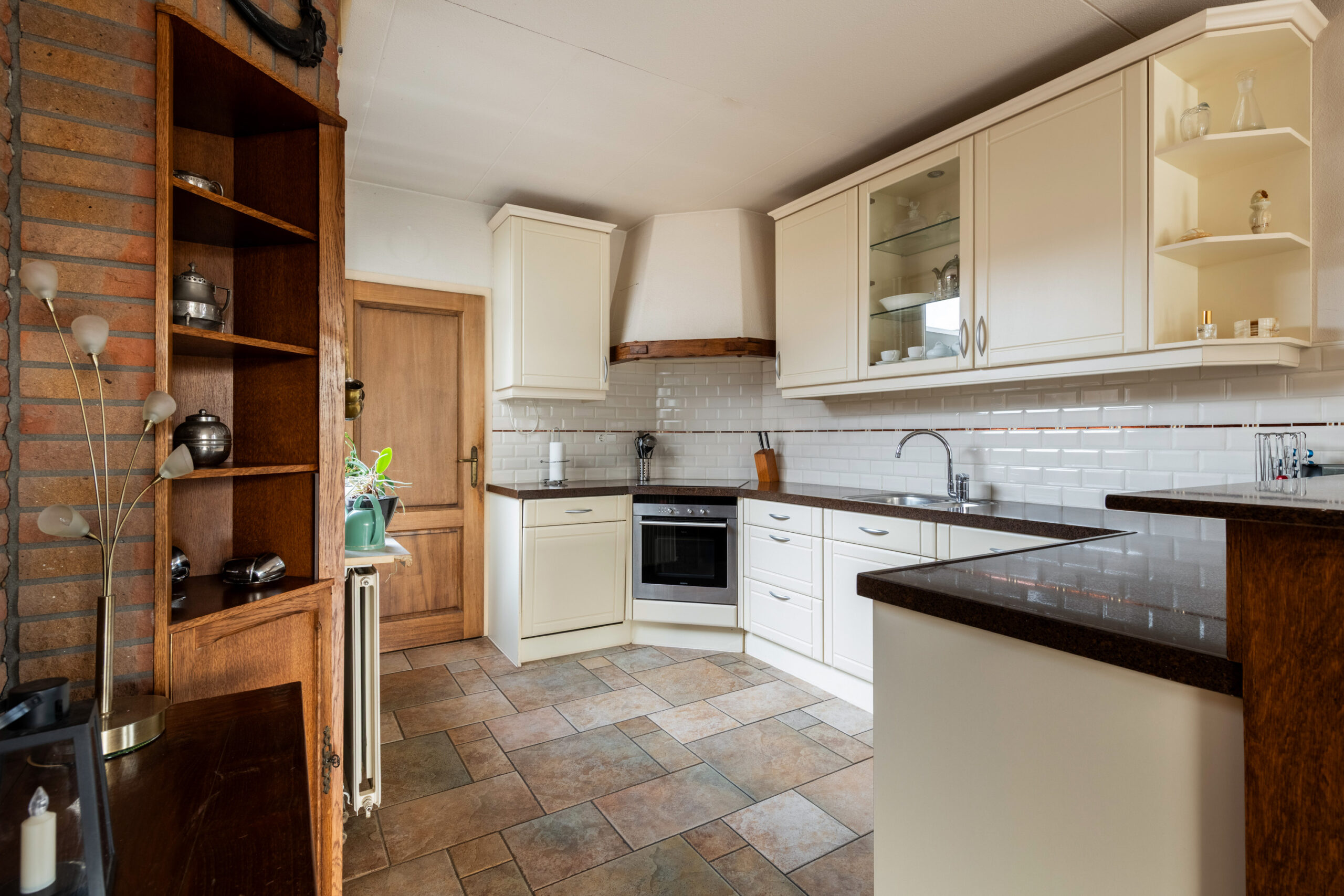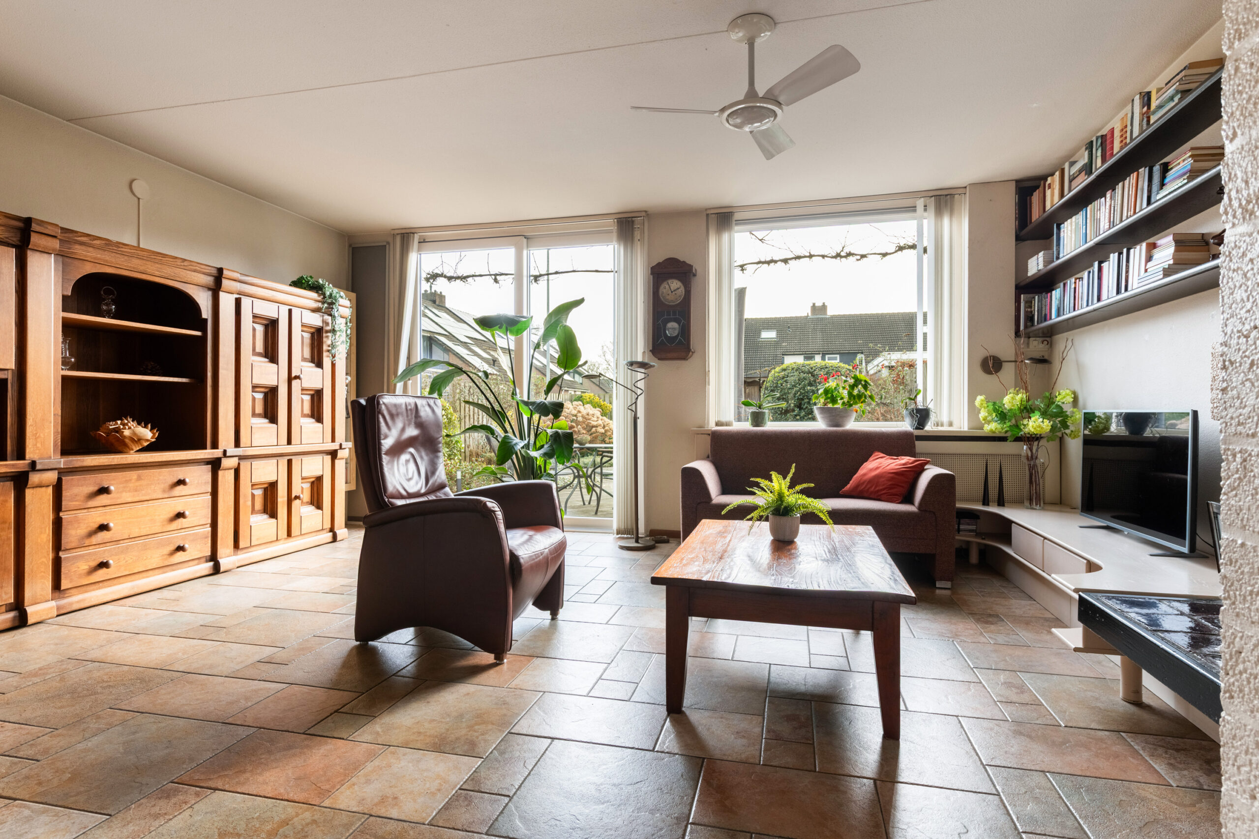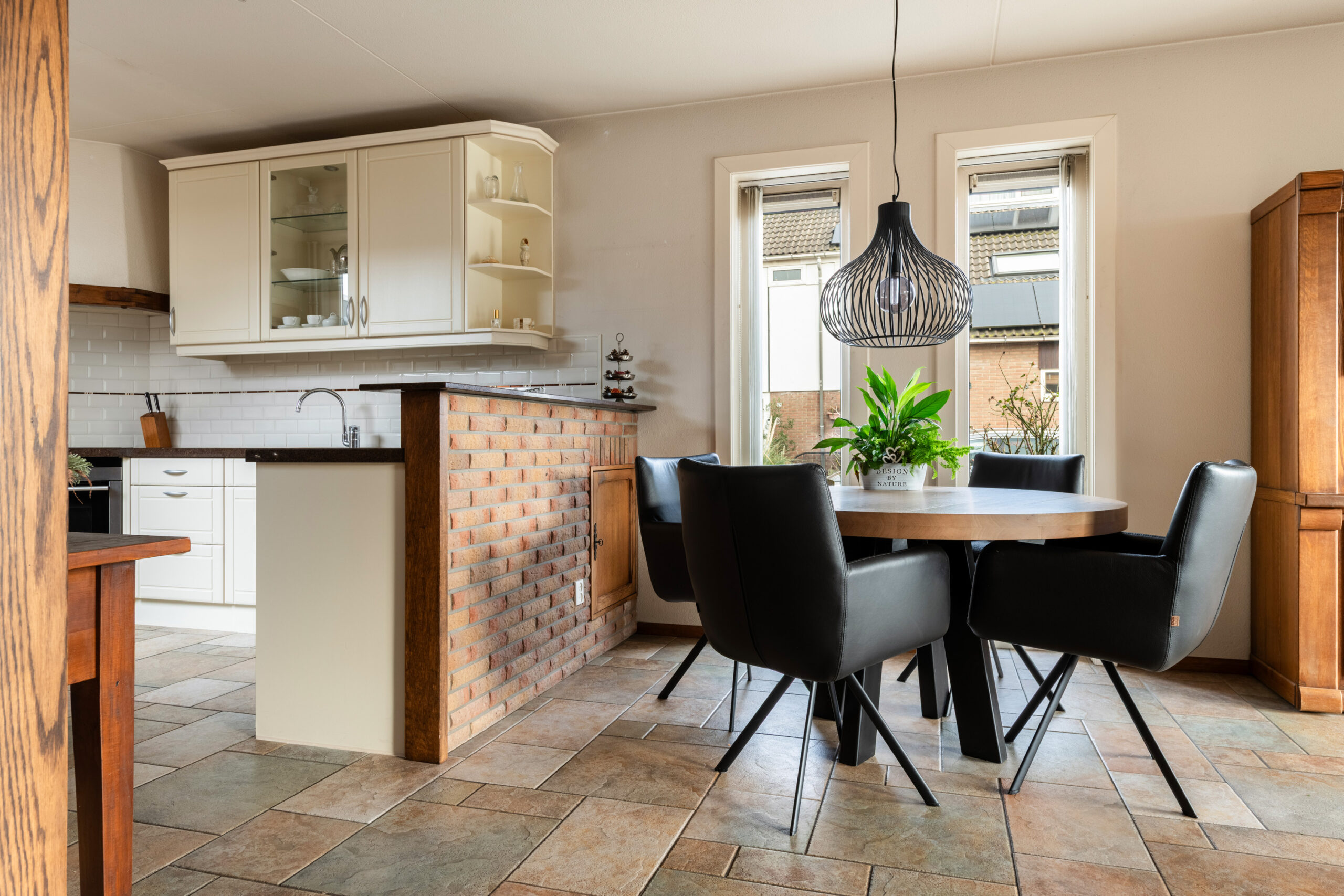 Entree met hal, meterkast en het toilet. Het toilet is vrijhangend en voorzien van een fontein, het geheel is tot het plafond betegeld. Vanuit de hal loop je door naar de ruime woon-/eetkamer, een prettige leefruimte die dankzij de grote raampartijen en het extra zijraam heerlijk licht is. De woonkamer is gericht op de achtertuin en straalt sfeer uit door de open haard. De stenen vloer met vloerverwarming zorgt voor extra comfort en maakt het geheel helemaal af. Aan de voorzijde van de woning bevindt zich de keuken, deze is uitgerust met een 4-pits keramische kookplaat, afzuigkap, koelkast en een vaatwasmachine. De aanbouw aan de voorzijde, die in 2005 is vergroot, biedt extra ruimte en mogelijkheden. Deze is volledig geïsoleerd, beschikt over een extra zijraam, een dakraam en vloerverwarming. Tevens is er een wateraansluiting (koudwater) met afvoer aanwezig zodat hier ook een wasmachine en droger aangesloten kunnen worden. Een fijne multifunctionele ruimte die je naar eigen wens kunt gebruiken.