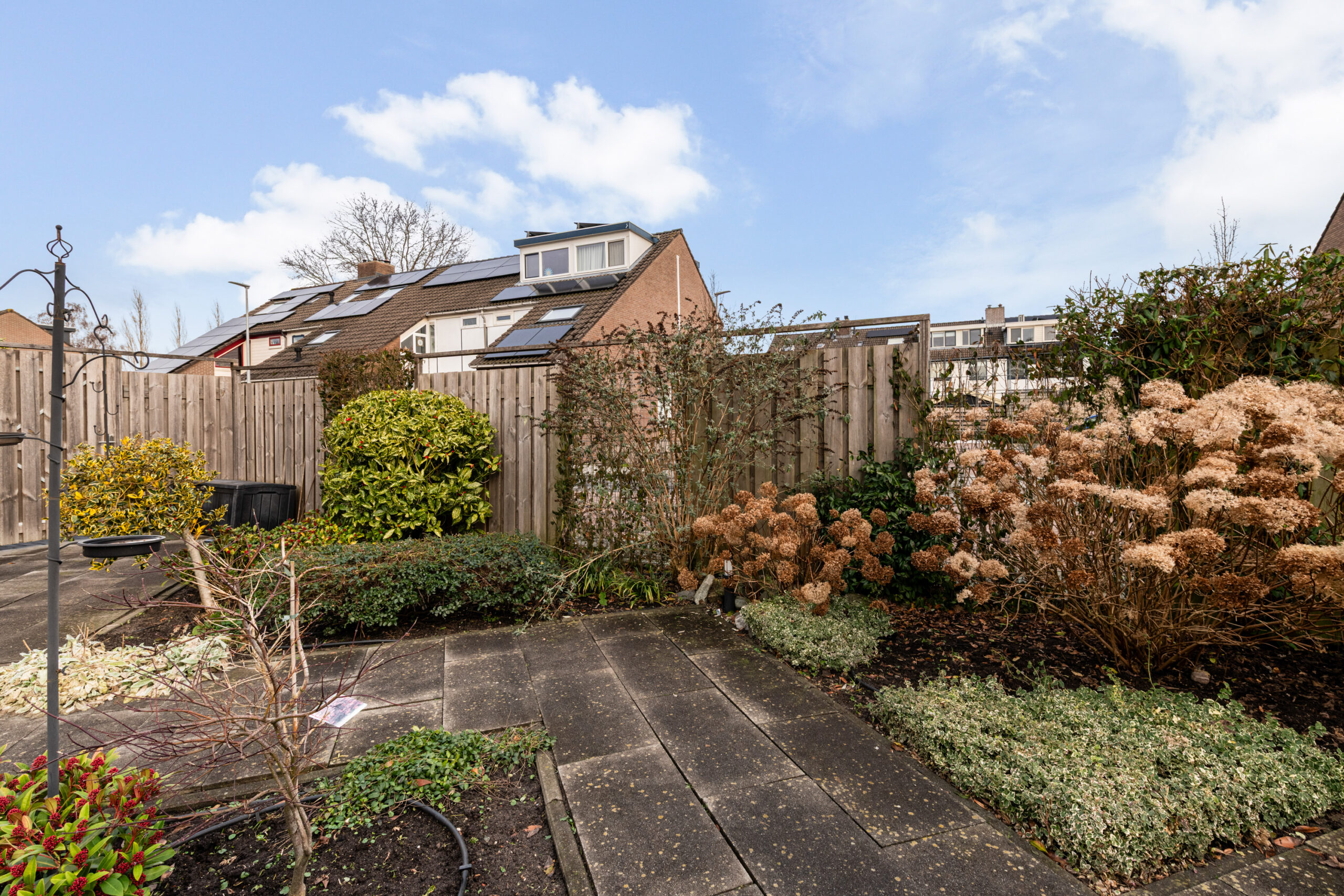 De tuin is in 2018 volledig opnieuw aangelegd. Er is een nieuwe schutting geplaatst en de tuin is speels ingedeeld met meerdere zitjes en veel groen, Daarnaast is de tuin voorzien van een drainagesysteem, een sproeisysteem en tuinverlichting.