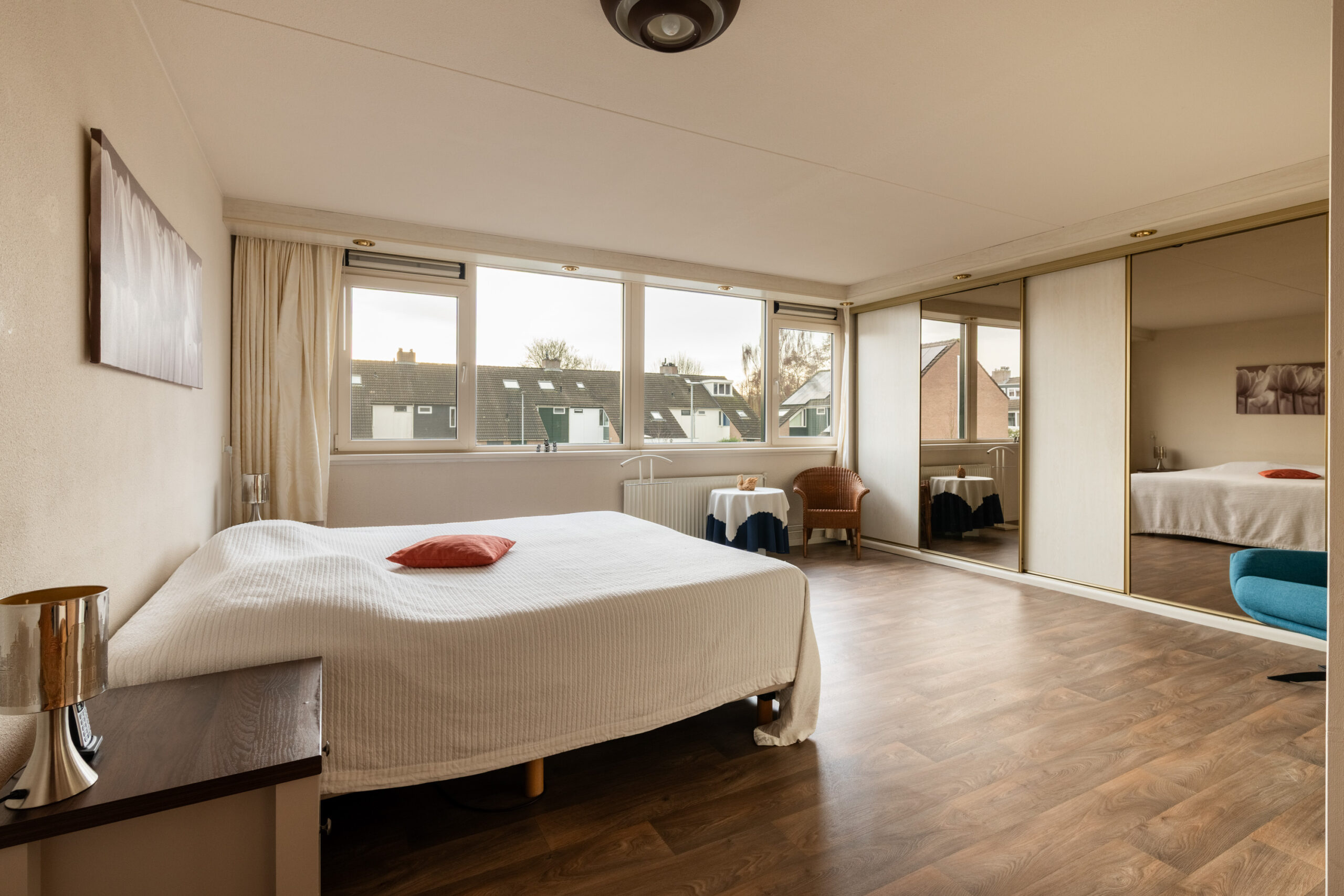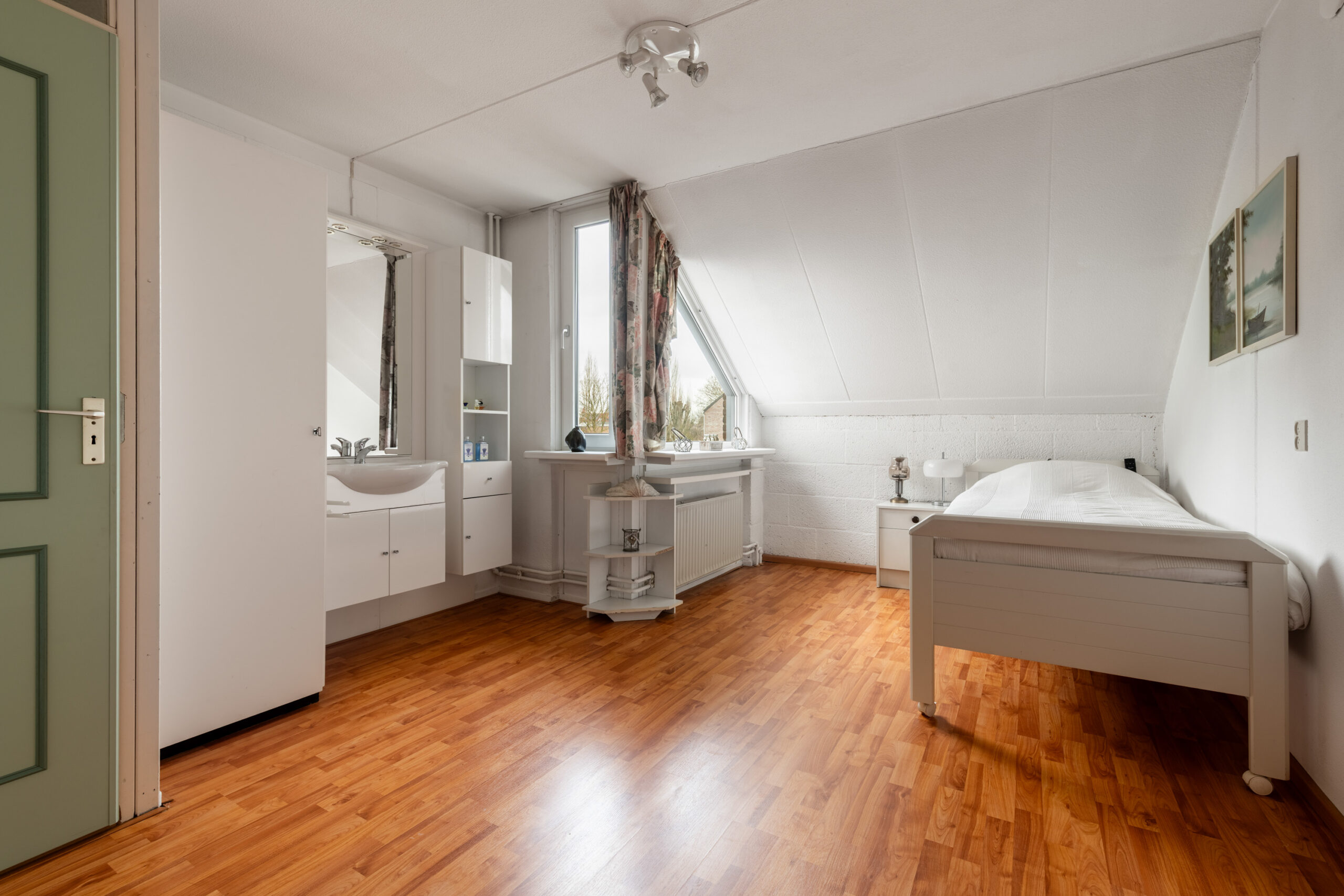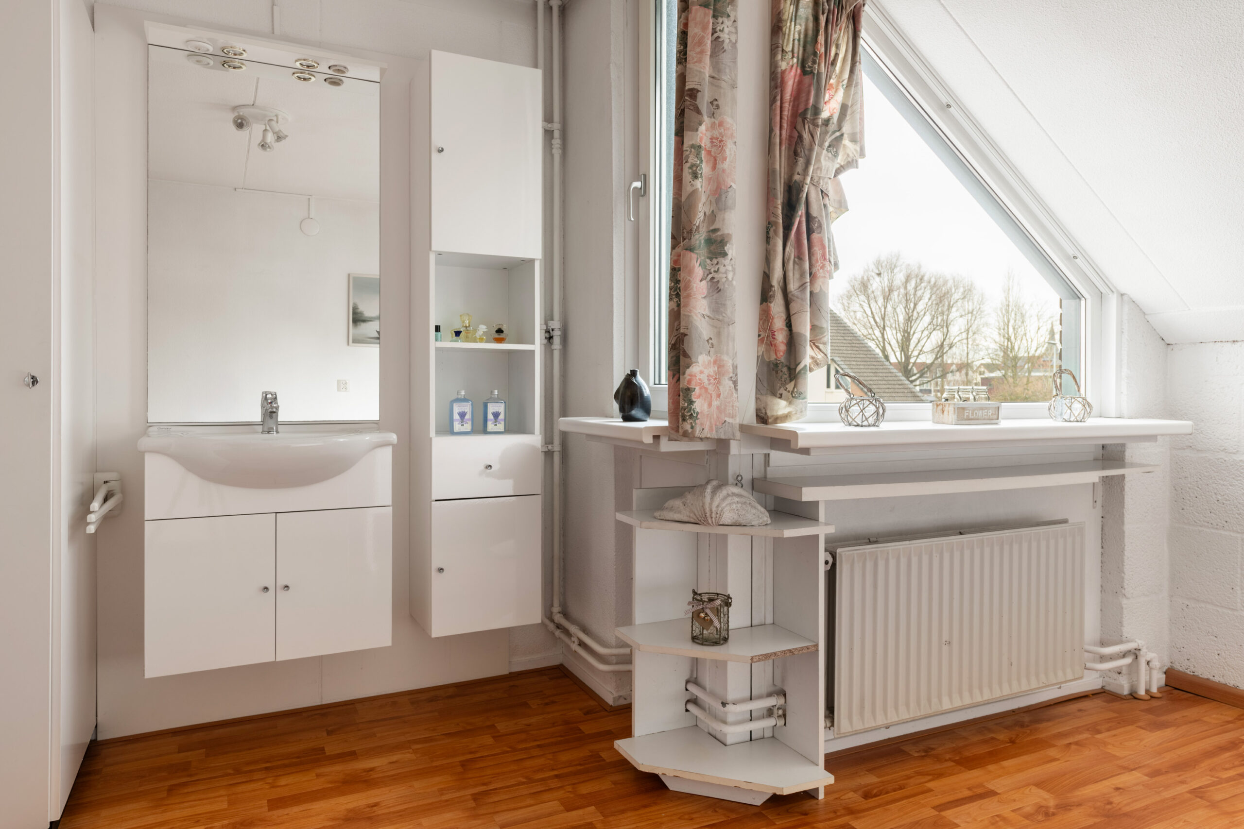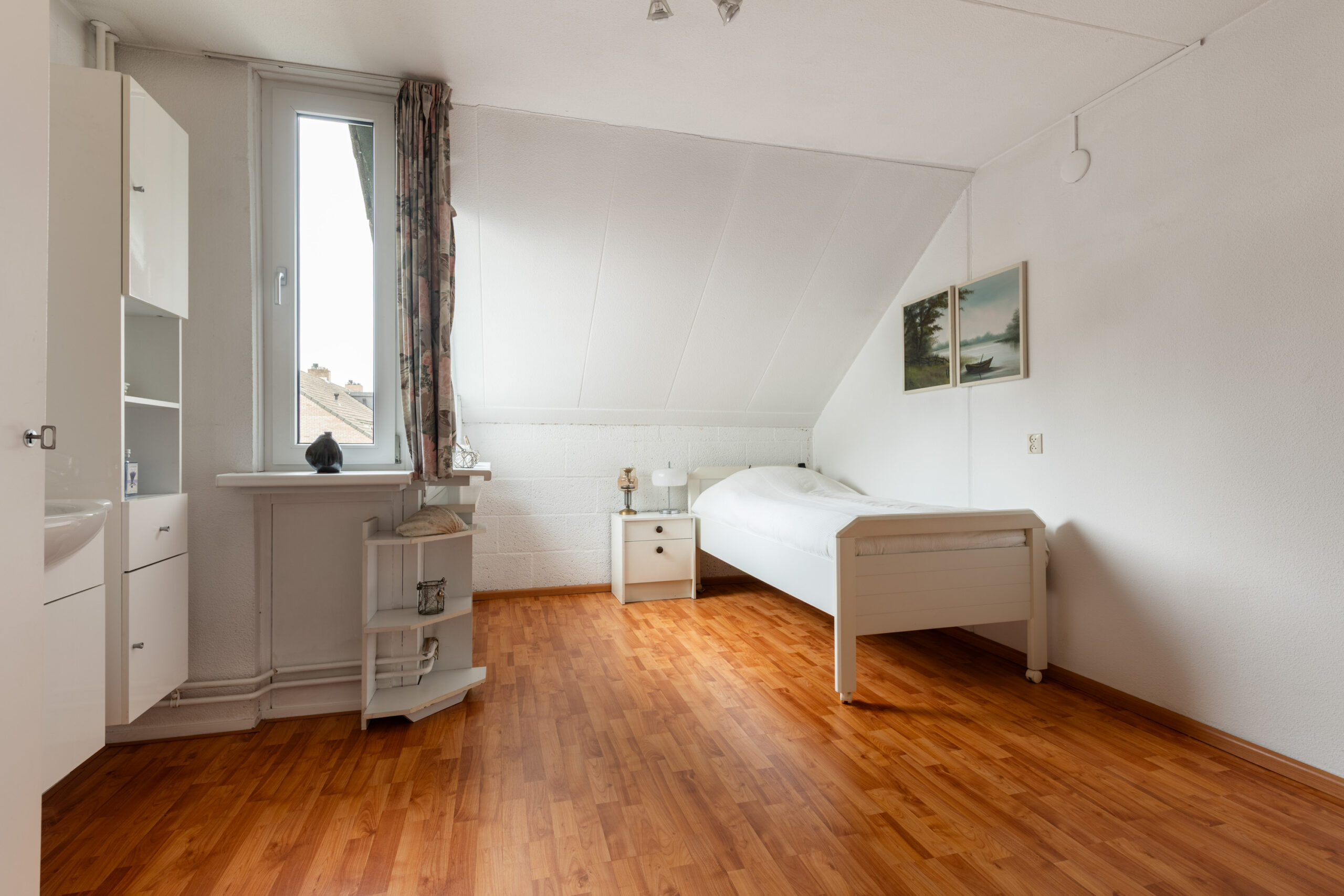 Op de eerste verdieping vind je 2 slaapkamers, een praktische berging en de badkamer. De kamers zijn afgewerkt met een laminaatvloer en schilderwerk wanden. De hoofdslaapkamer aan de achterzijde voelt extra ruim aan doordat hier oorspronkelijk 2 kamers samen zijn gevoegd. Dit is zonder veel moeite terug te brengen naar de oorspronkelijke indeling met 3 slaapkamers op de verdieping. Beide kamers zijn voorzien van kunststof draai-/kiepramen met horren. De slaapkamer aan de achterzijde heeft een inbouw kastenwand en de slaapkamer aan de voorzijde heeft een wastafelmeubel op de kamer.