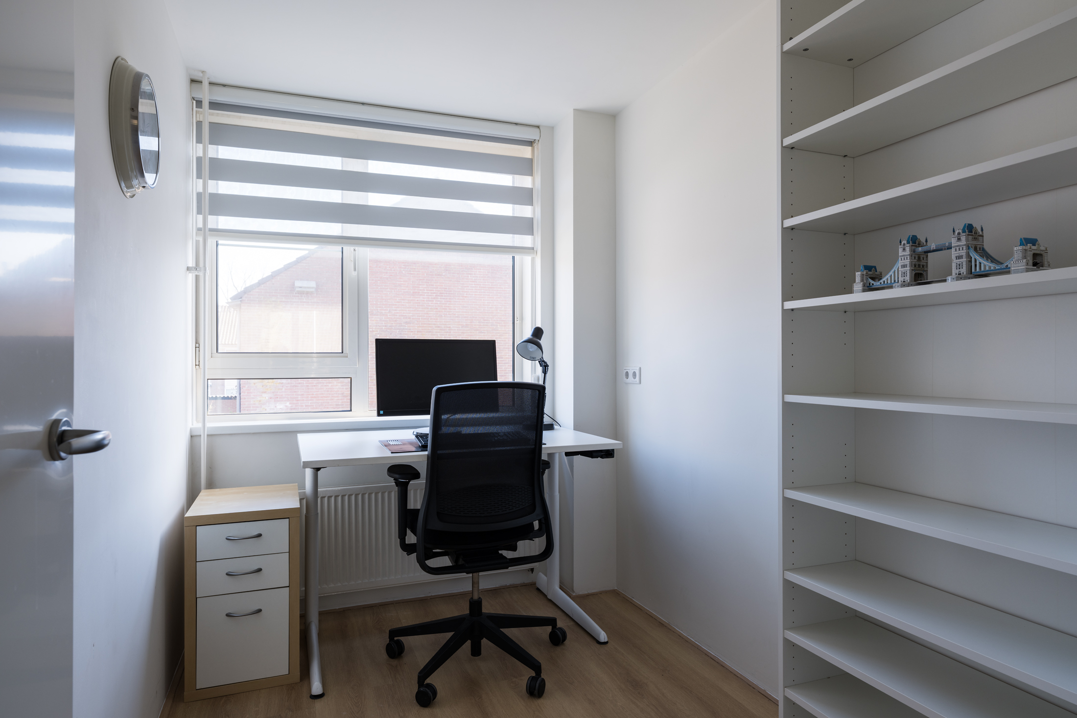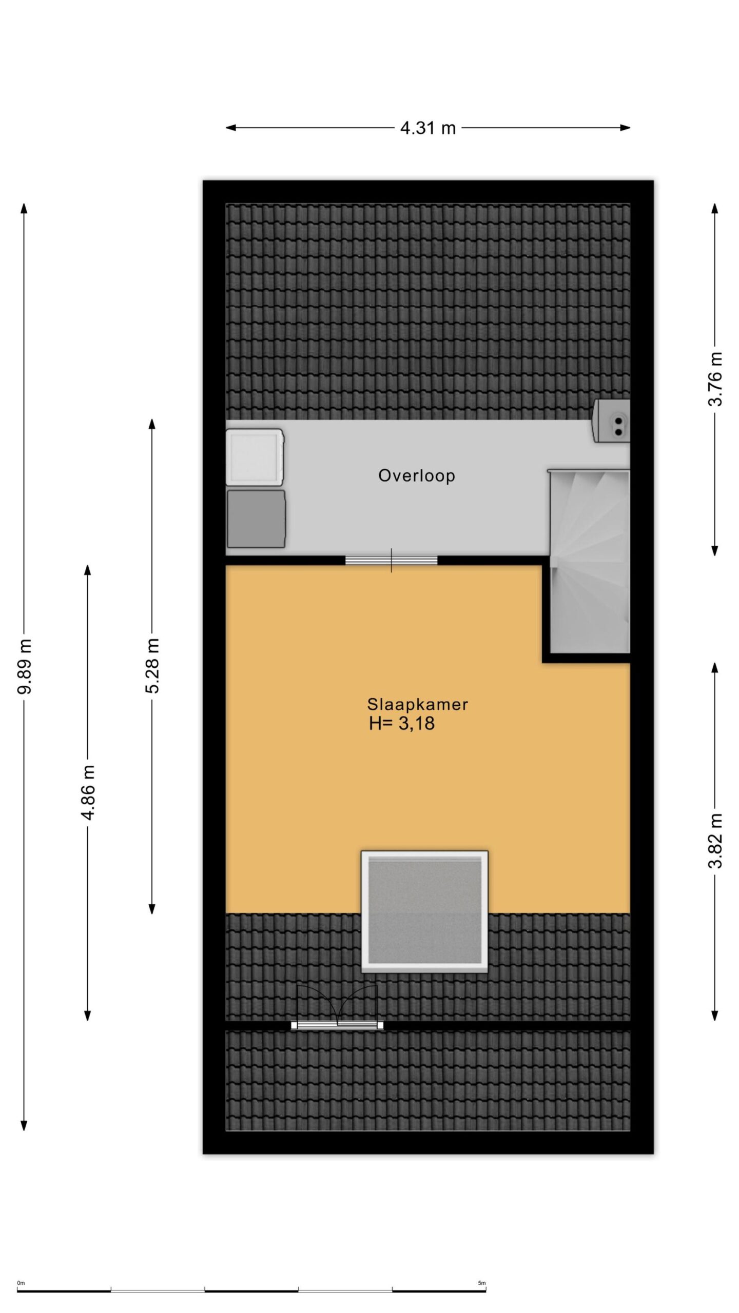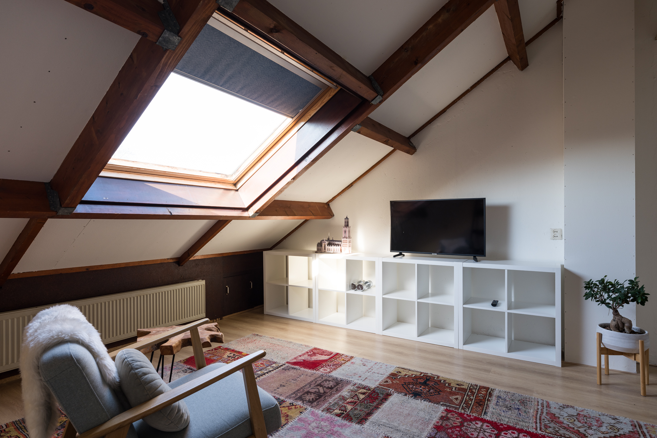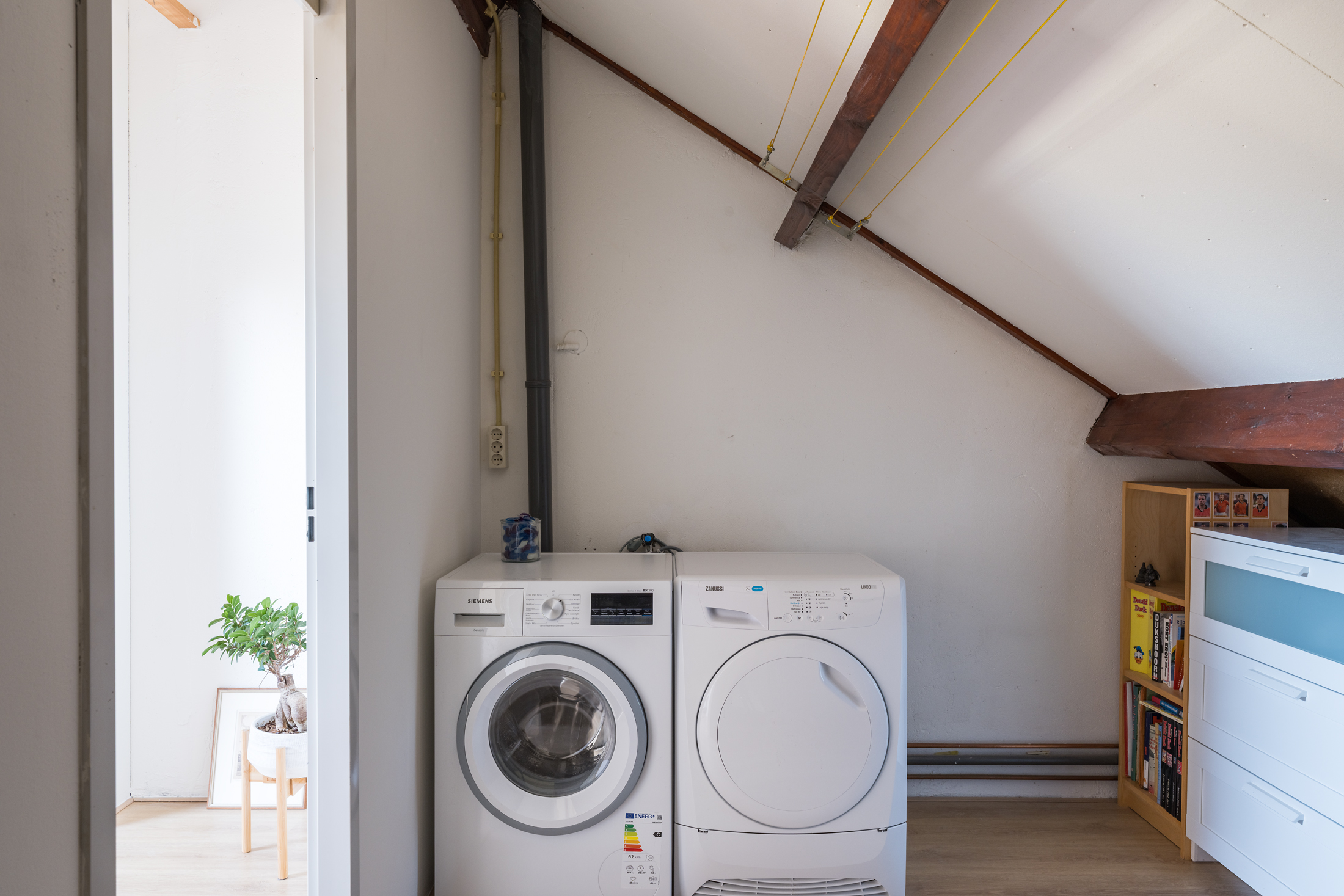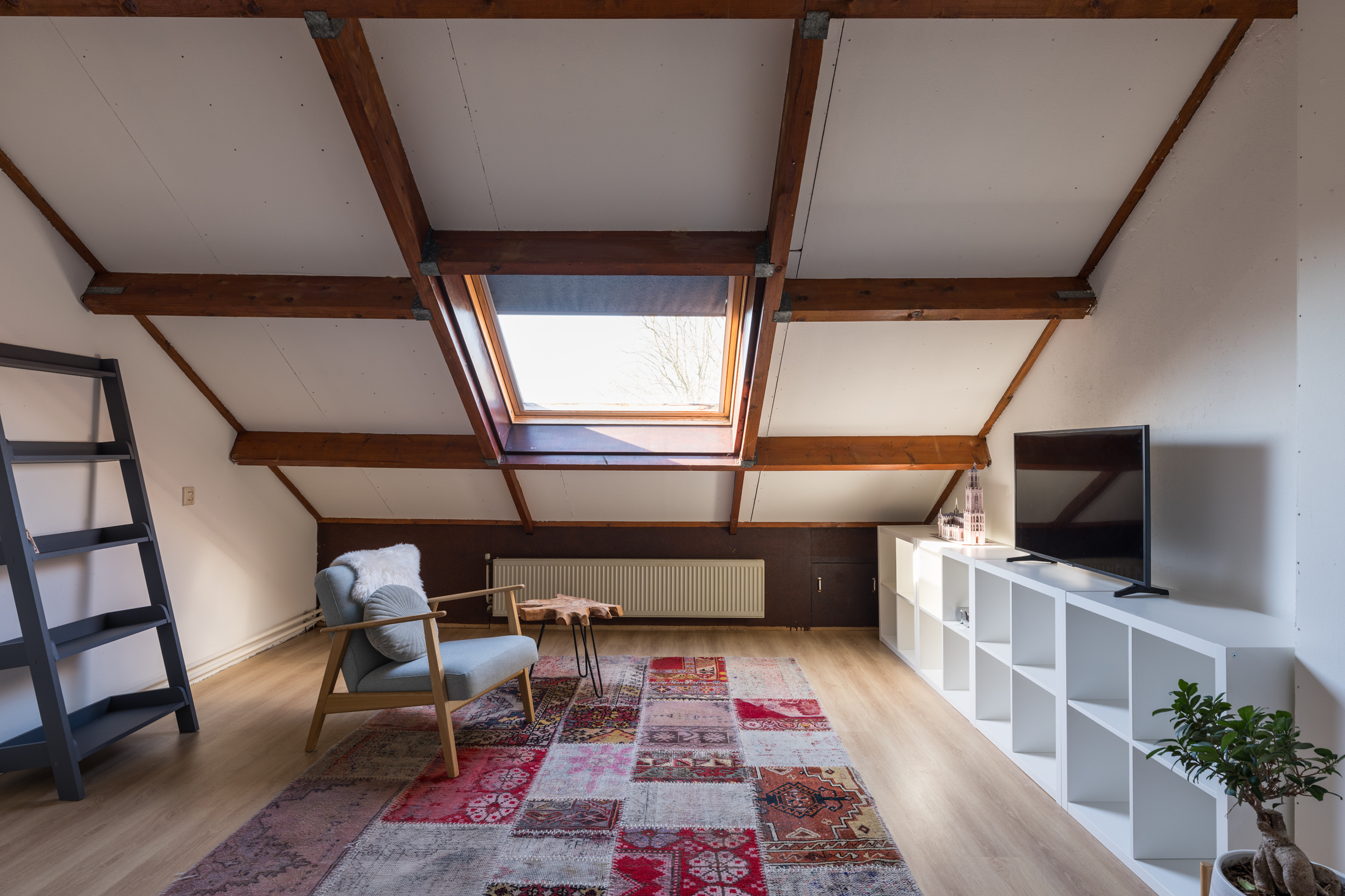 De tweede verdieping heeft aan de achterzijde een bergruimte, terwijl op de overloop de wasmachine, droger en de cv-combiketel zijn geplaatst. Aan de voorzijde is een ruime slaapkamer met dakraam, waarin de fraaie nokhoogte van circa 3,18 meter een extra ruimtelijk effect geeft. De gehele verdieping is afgewerkt met een laminaatvloer en de wanden zijn geschilderd.