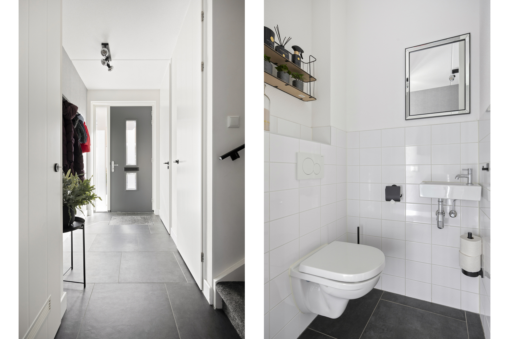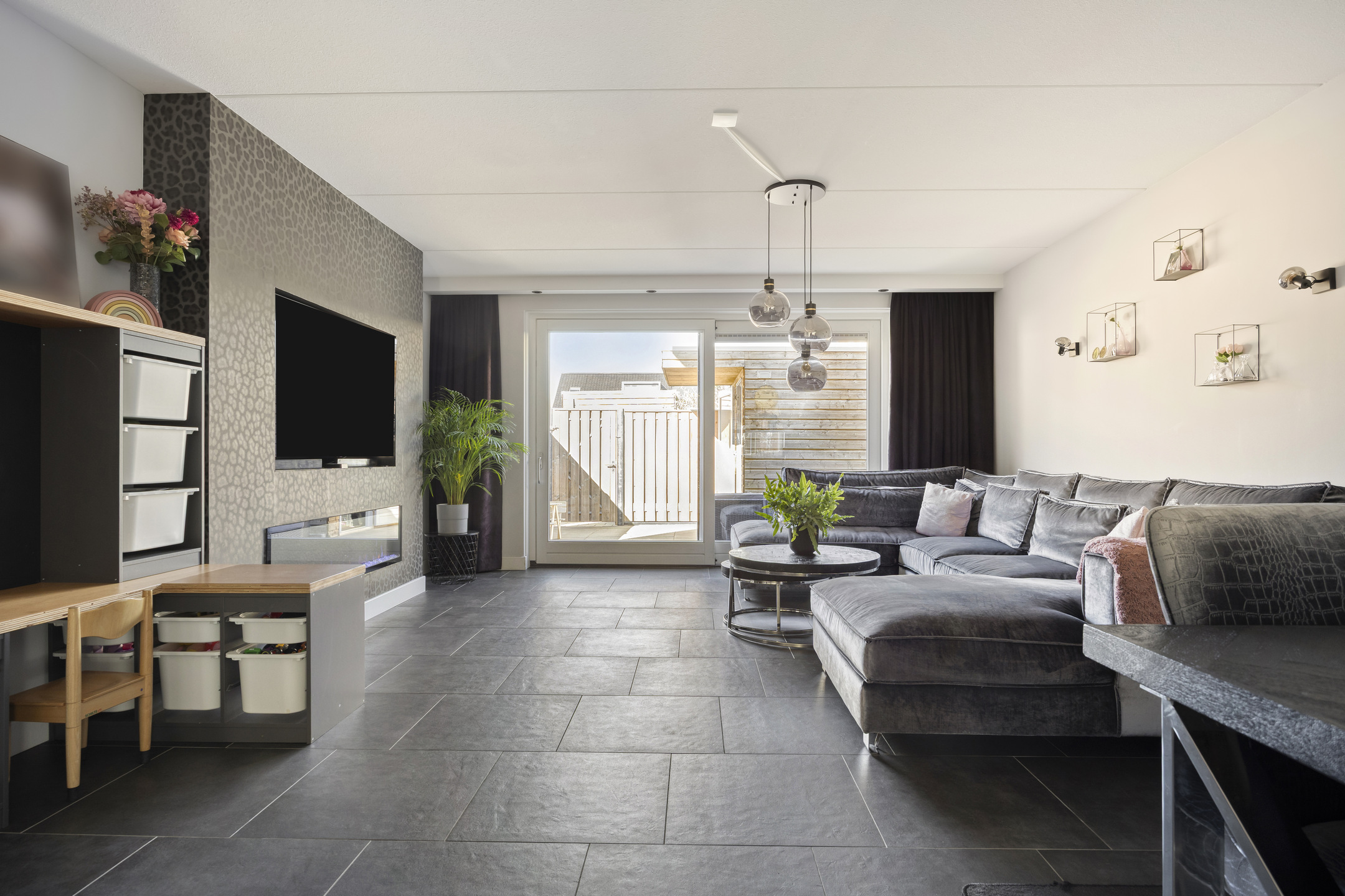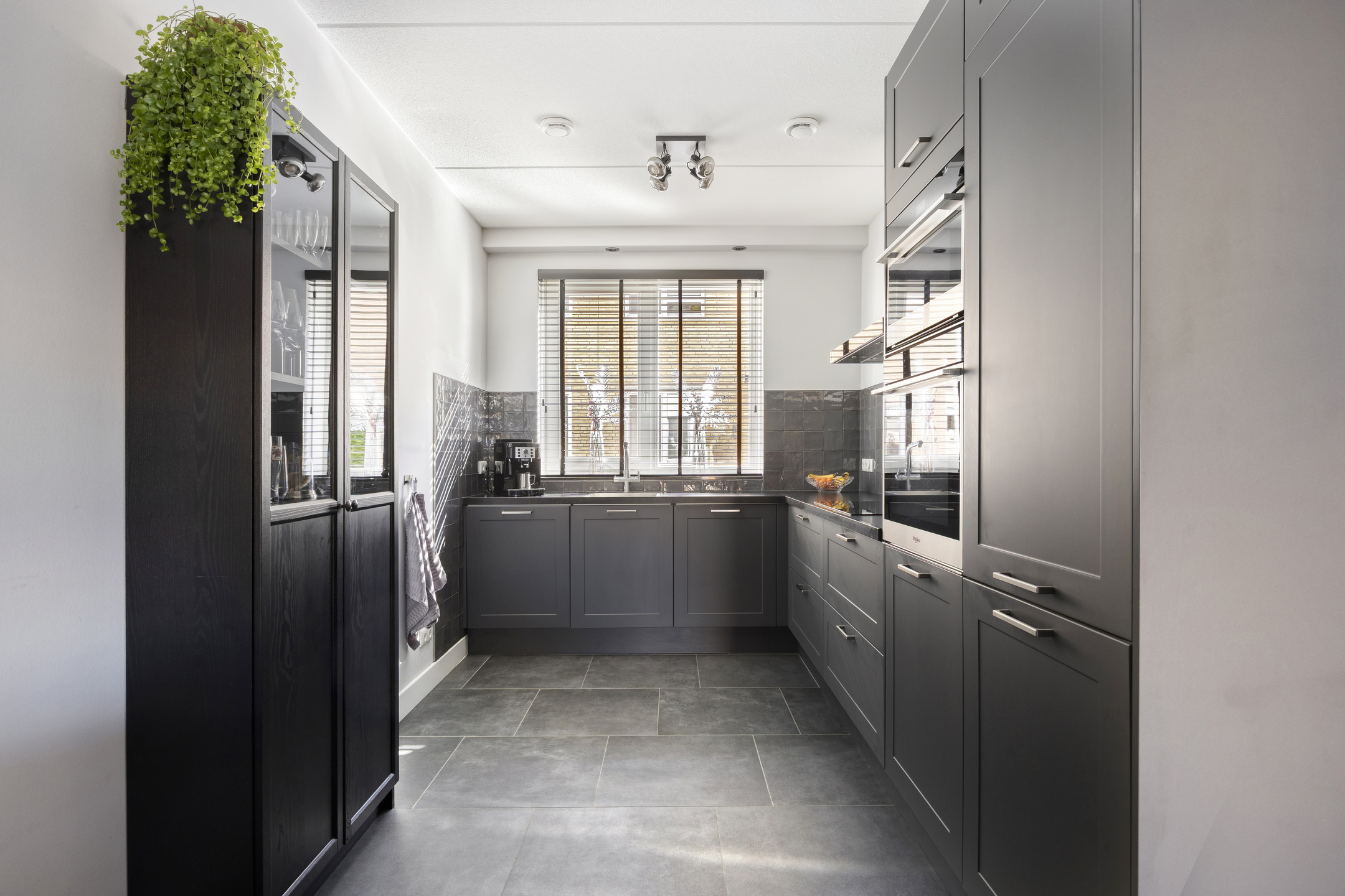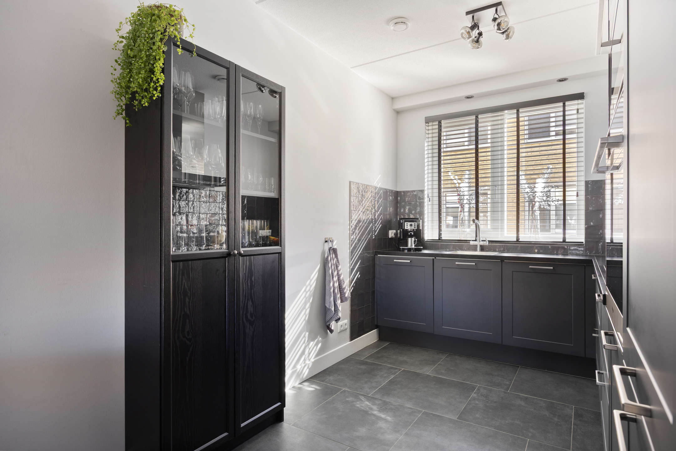 Entree met hal welke toegang geeft tot het toilet, de garderobe, de meterkast en een kastruimte. Het vrijhangende toilet is verzorgd afgewerkt en voorzien van een fontein, met tegelwerk tot circa 1 meter hoogte. De uitgebouwde woonkamer bevindt zich aan de achterzijde en is met circa 2,4 meter verlengd, wat zorgt voor een opvallend fijne en lichte leefruimte. Dankzij de schuifpui sta je in directe verbinding met de achtertuin. De wanden zijn voorzien van renovlies behang en op de vloer ligt een stenen vloer met vloerverwarming. Aan de voorzijde van de woning ligt de keuken, opgesteld in een L-opstelling en voorzien van diverse inbouwapparatuur, waaronder een 4-pits inductiekookplaat, RVS afzuigkap, vaatwasmachine, combi-magnetron, oven, kokend water kraan, koelkast en vriezer.