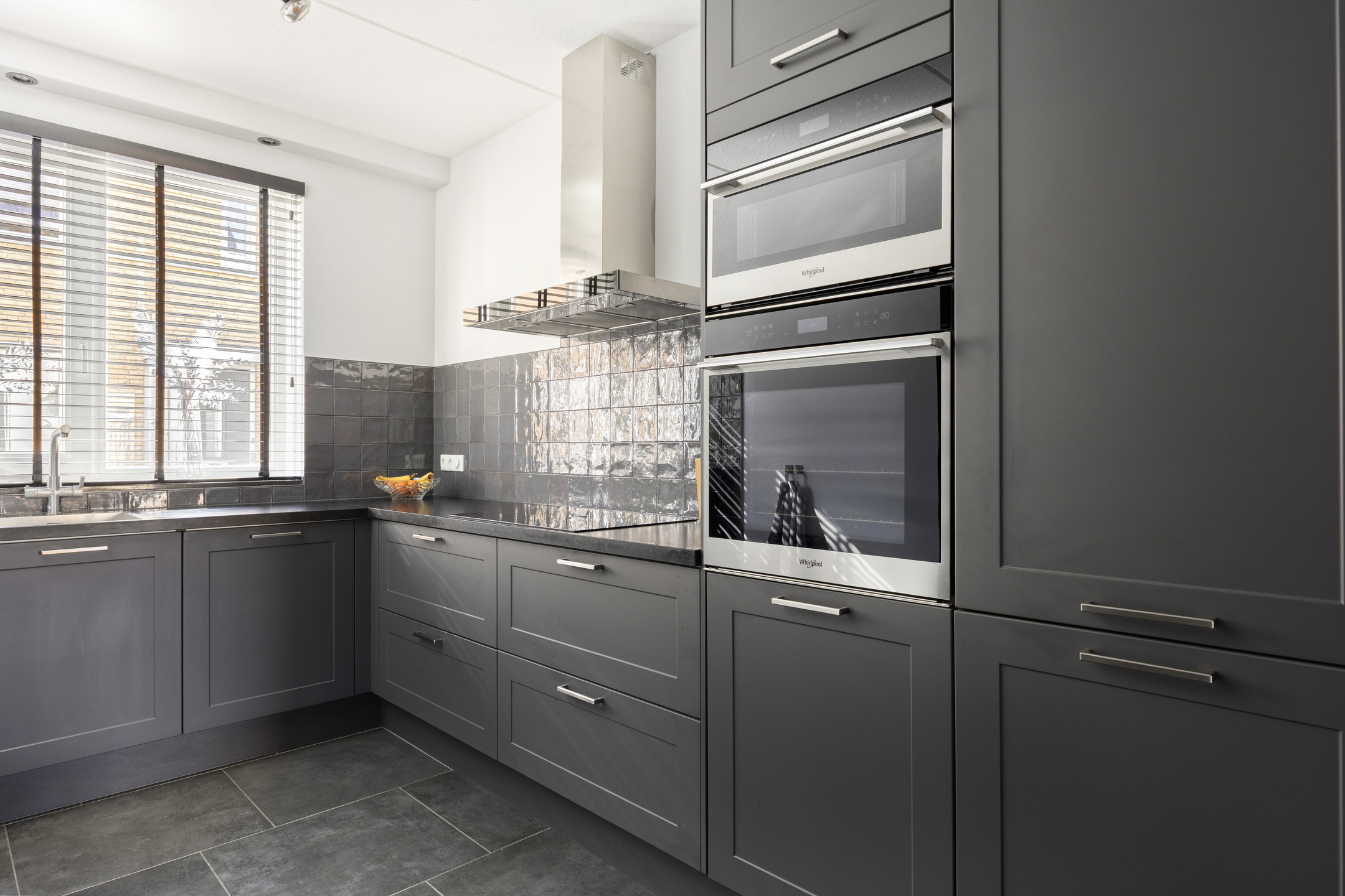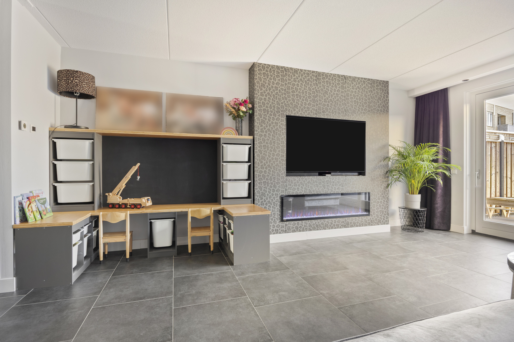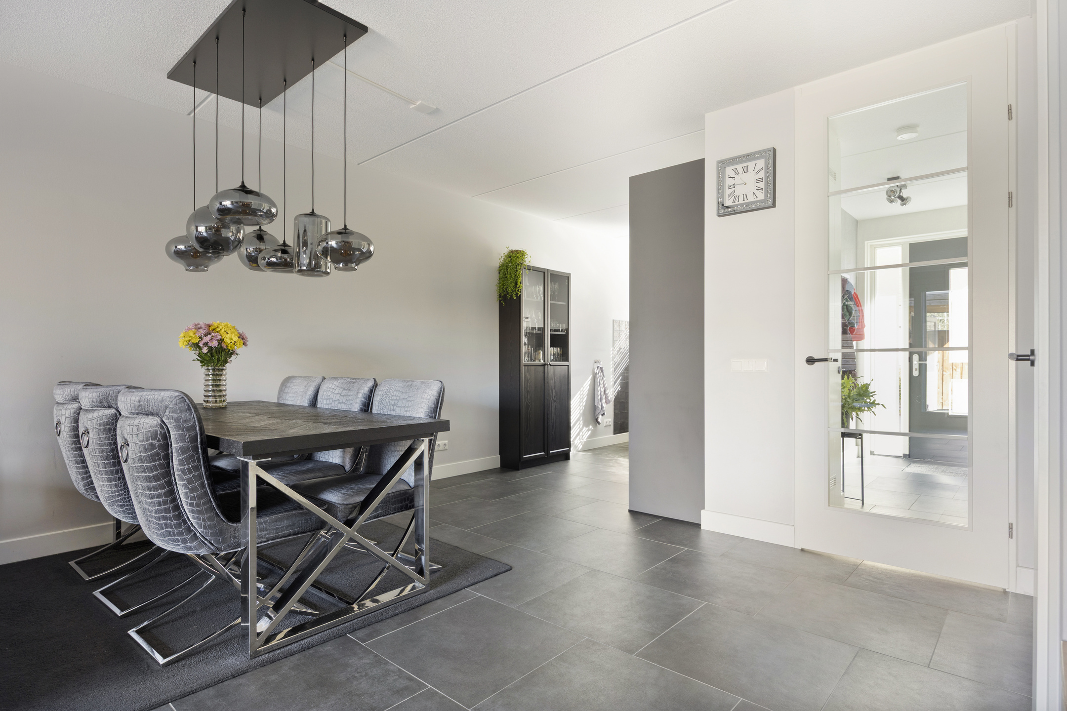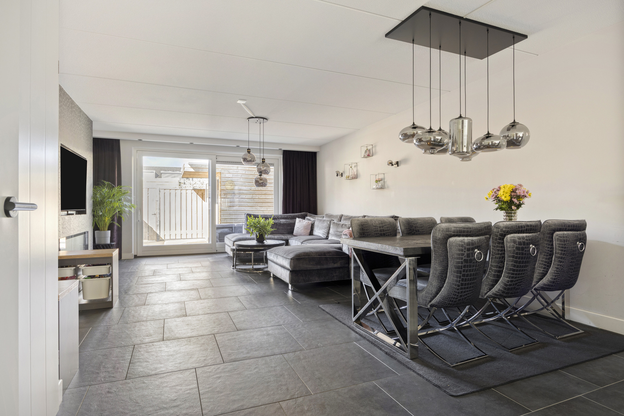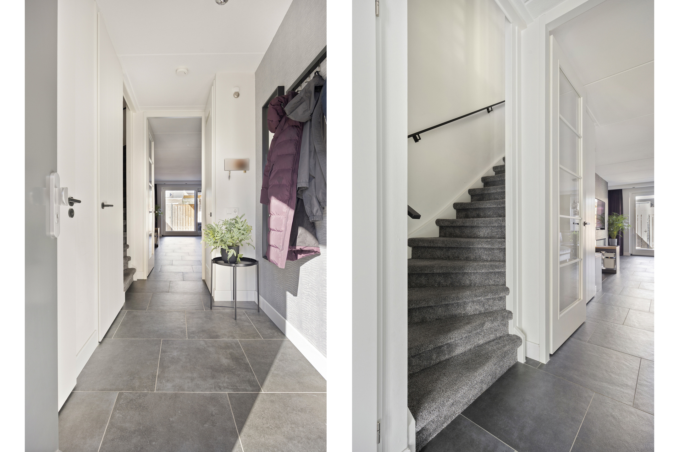 Entree met hal welke toegang geeft tot het toilet, de garderobe, de meterkast en een kastruimte. Het vrijhangende toilet is verzorgd afgewerkt en voorzien van een fontein, met tegelwerk tot circa 1 meter hoogte. De uitgebouwde woonkamer bevindt zich aan de achterzijde en is met circa 2,4 meter verlengd, wat zorgt voor een opvallend fijne en lichte leefruimte. Dankzij de schuifpui sta je in directe verbinding met de achtertuin. De wanden zijn voorzien van renovlies behang en op de vloer ligt een stenen vloer met vloerverwarming. Aan de voorzijde van de woning ligt de keuken, opgesteld in een L-opstelling en voorzien van diverse inbouwapparatuur, waaronder een 4-pits inductiekookplaat, RVS afzuigkap, vaatwasmachine, combi-magnetron, oven, kokend water kraan, koelkast en vriezer.