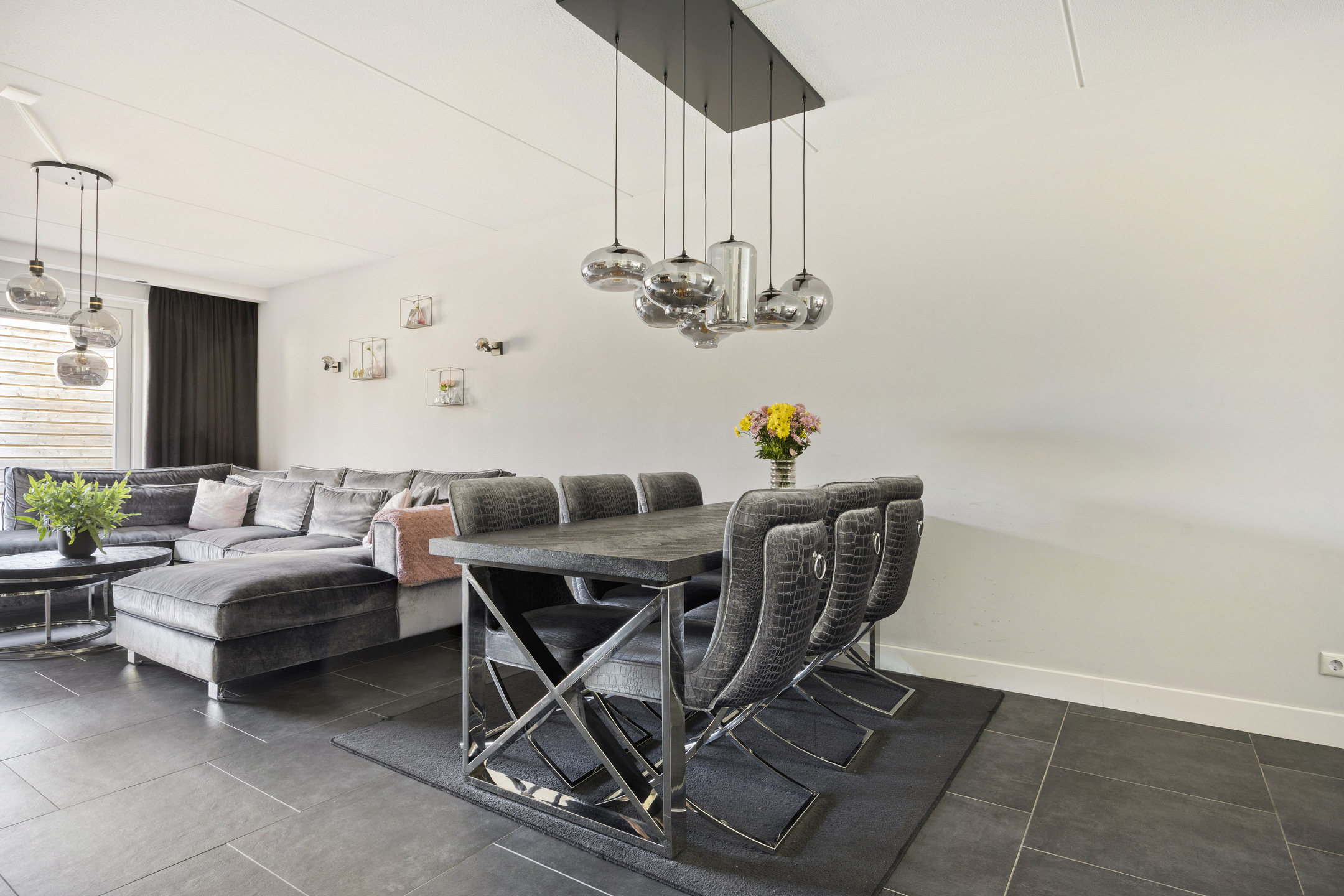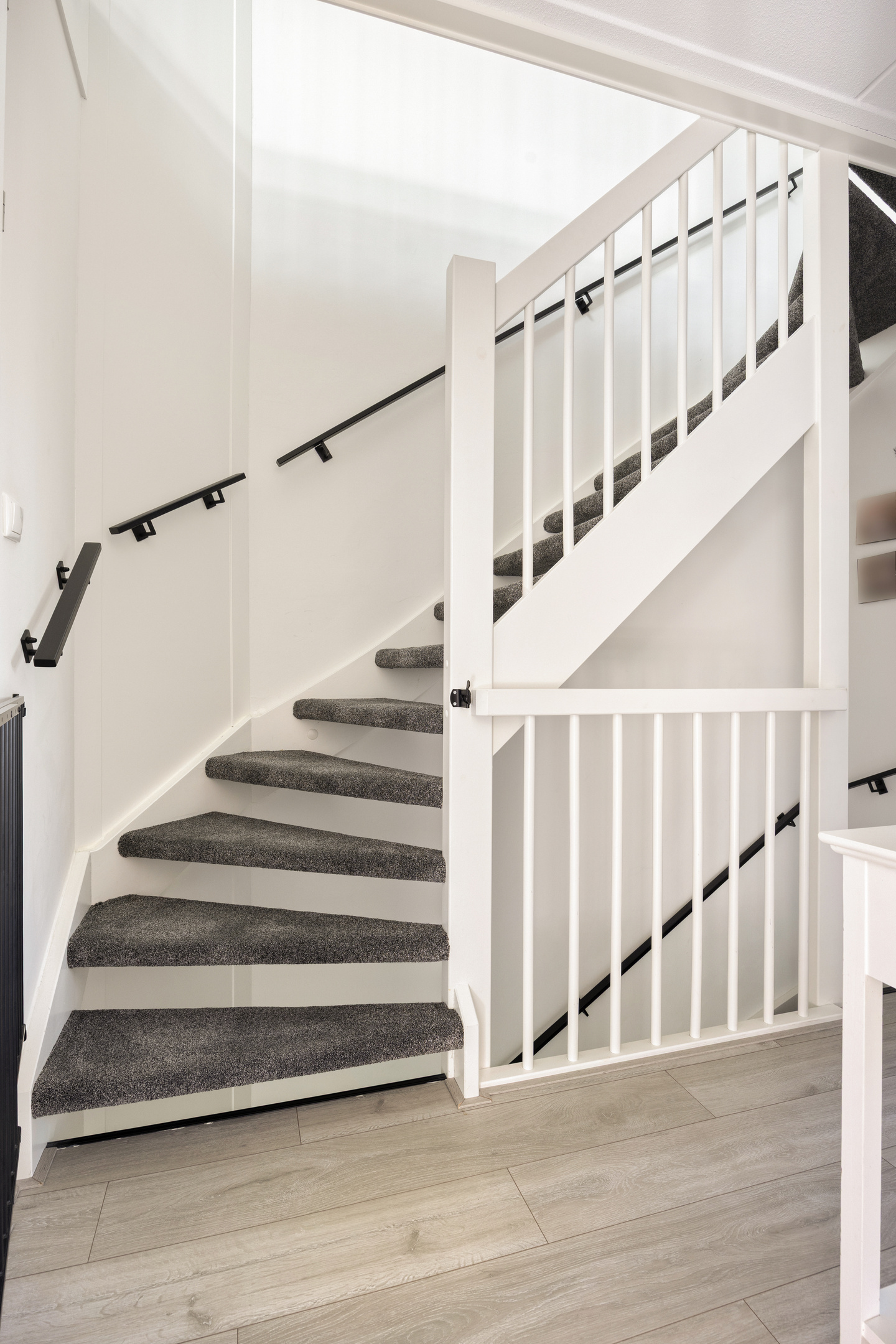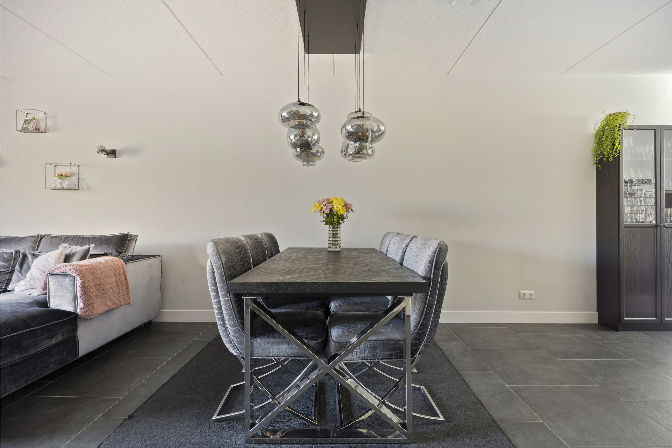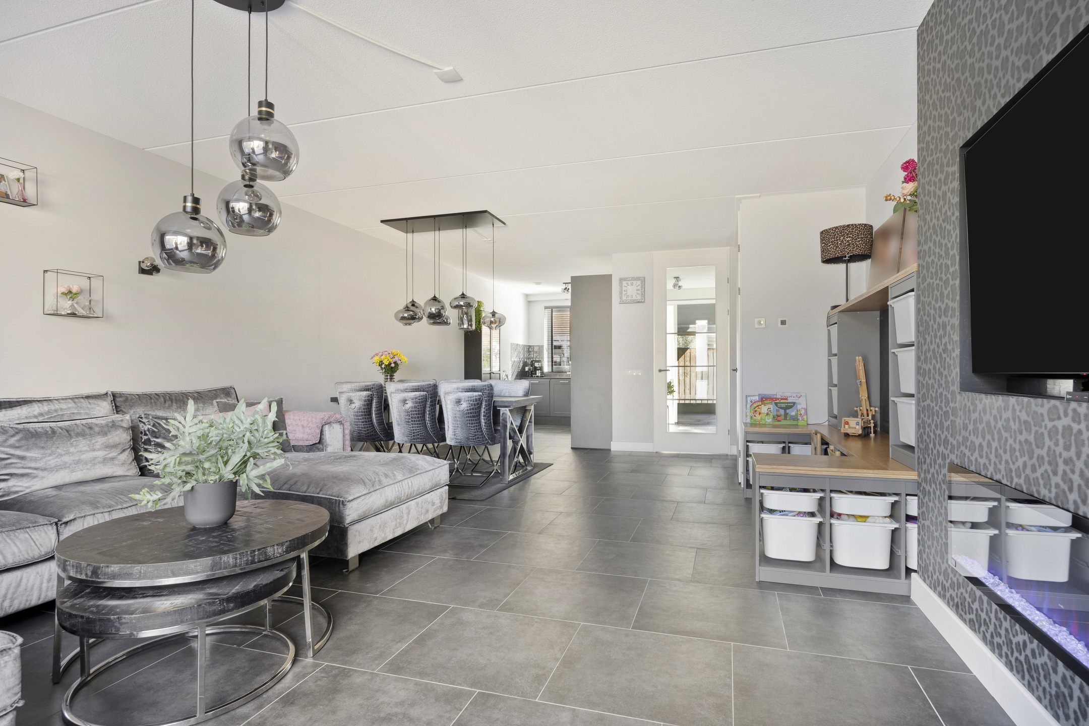Entree met hal welke toegang geeft tot het toilet, de garderobe, de meterkast en een kastruimte. Het vrijhangende toilet is verzorgd afgewerkt en voorzien van een fontein, met tegelwerk tot circa 1 meter hoogte. De uitgebouwde woonkamer bevindt zich aan de achterzijde en is met circa 2,4 meter verlengd, wat zorgt voor een opvallend fijne en lichte leefruimte. Dankzij de schuifpui sta je in directe verbinding met de achtertuin. De wanden zijn voorzien van renovlies behang en op de vloer ligt een stenen vloer met vloerverwarming. Aan de voorzijde van de woning ligt de keuken, opgesteld in een L-opstelling en voorzien van diverse inbouwapparatuur, waaronder een 4-pits inductiekookplaat, RVS afzuigkap, vaatwasmachine, combi-magnetron, oven, kokend water kraan, koelkast en vriezer.