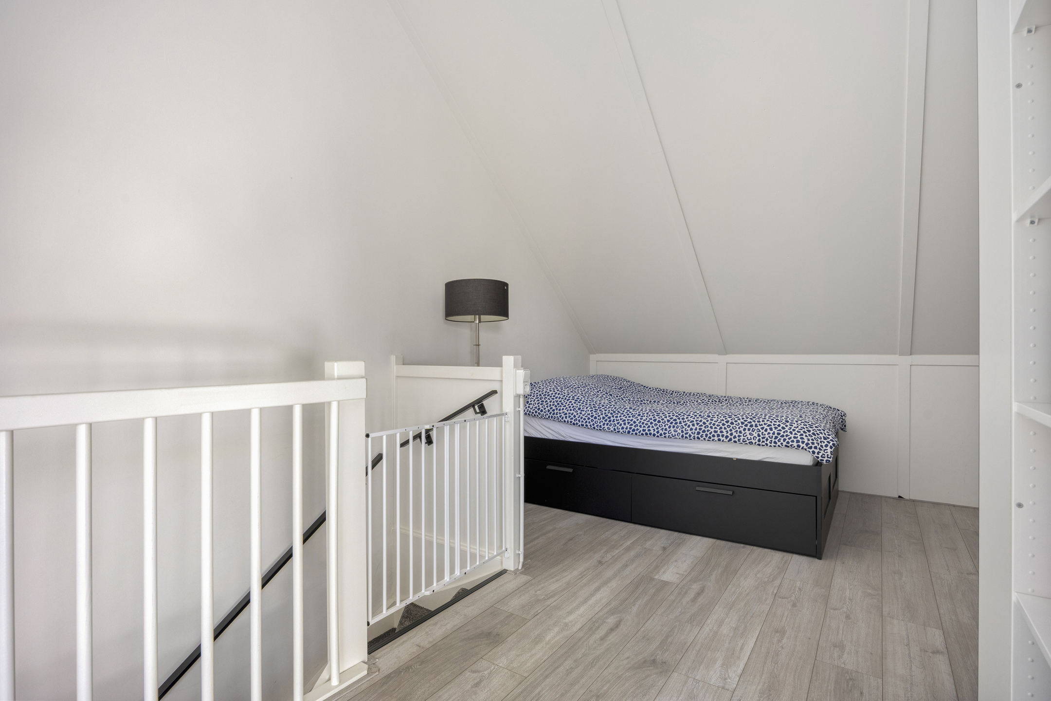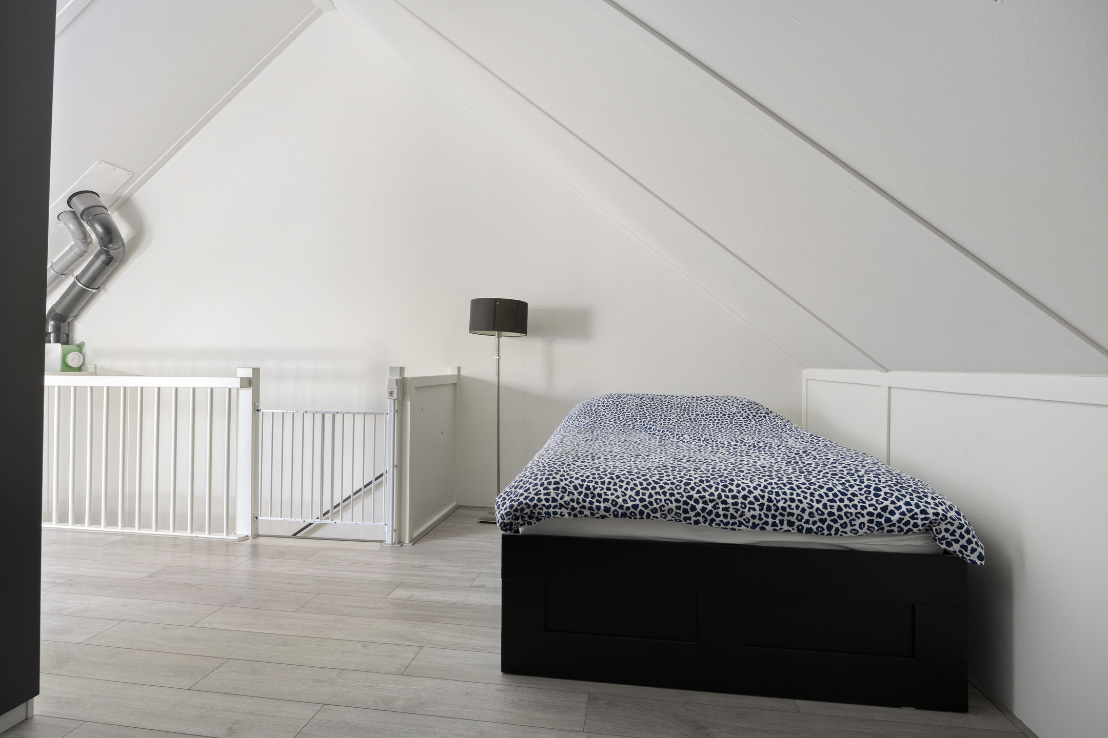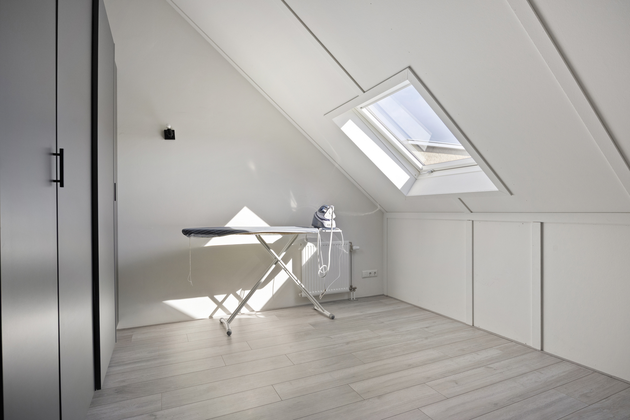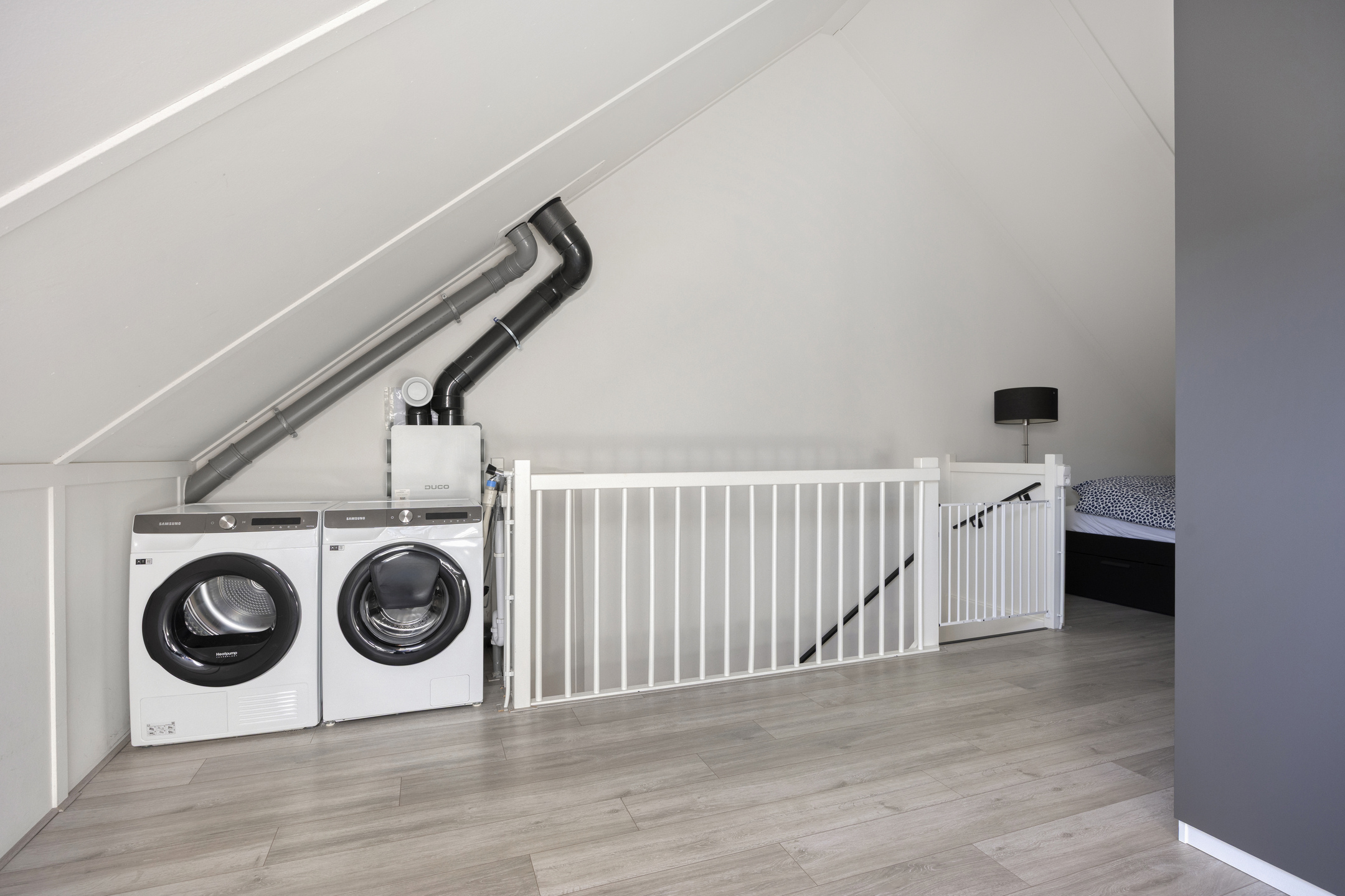 Via een vaste trap bereik je de tweede verdieping. Hier vind je een fijne ruimte die zich uitstekend leent als logeerkamer of werkruimte. Tevens is de wasmachine en droger op deze verdieping geplaatst. De aanwezige knieschotten zorgen voor extra bergruimte en maken dat je de beschikbare vierkante meters optimaal benut. De gehele verdieping is afgewerkt met een laminaatvloer en schilderwerk op de wanden. Aan de voorzijde is een dakraam geplaatst. Door het plaatsen van een dakraam aan de achterzijde is het eenvoudig deze verdieping te splitsen in meerdere kamers.