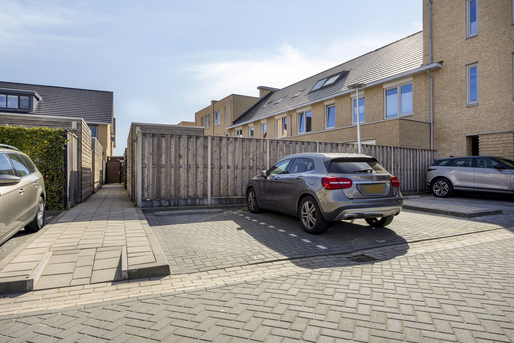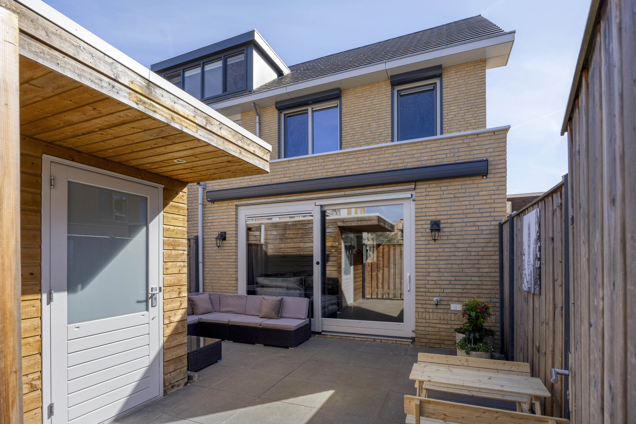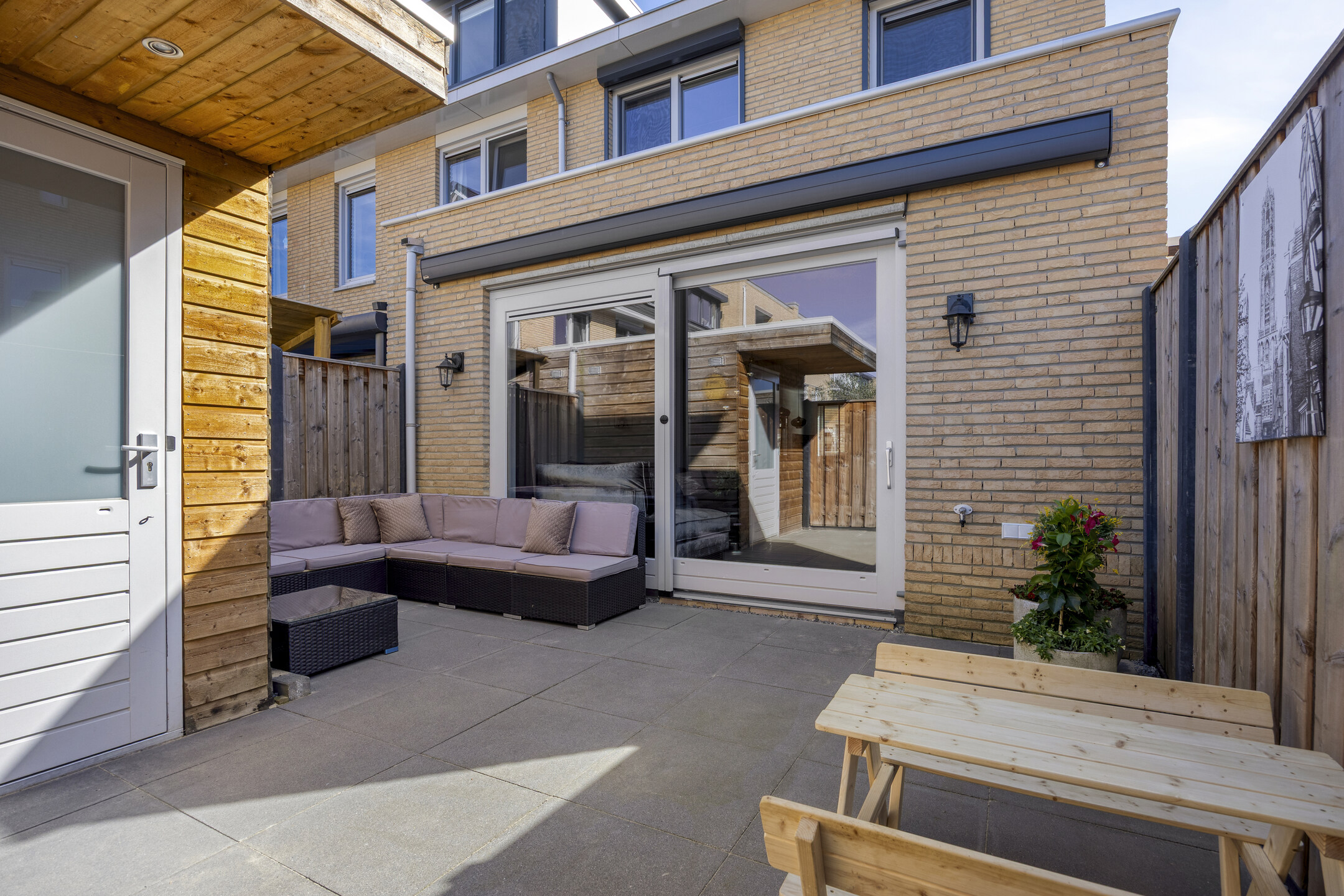 De achtertuin is op het westen gelegen en heeft een achterom en een houten berging. Tevens is er een elektrisch zonnescherm en een hor aanwezig. Aan de achterzijde bevindt zich op het binnenplein een eigen parkeerplaats.