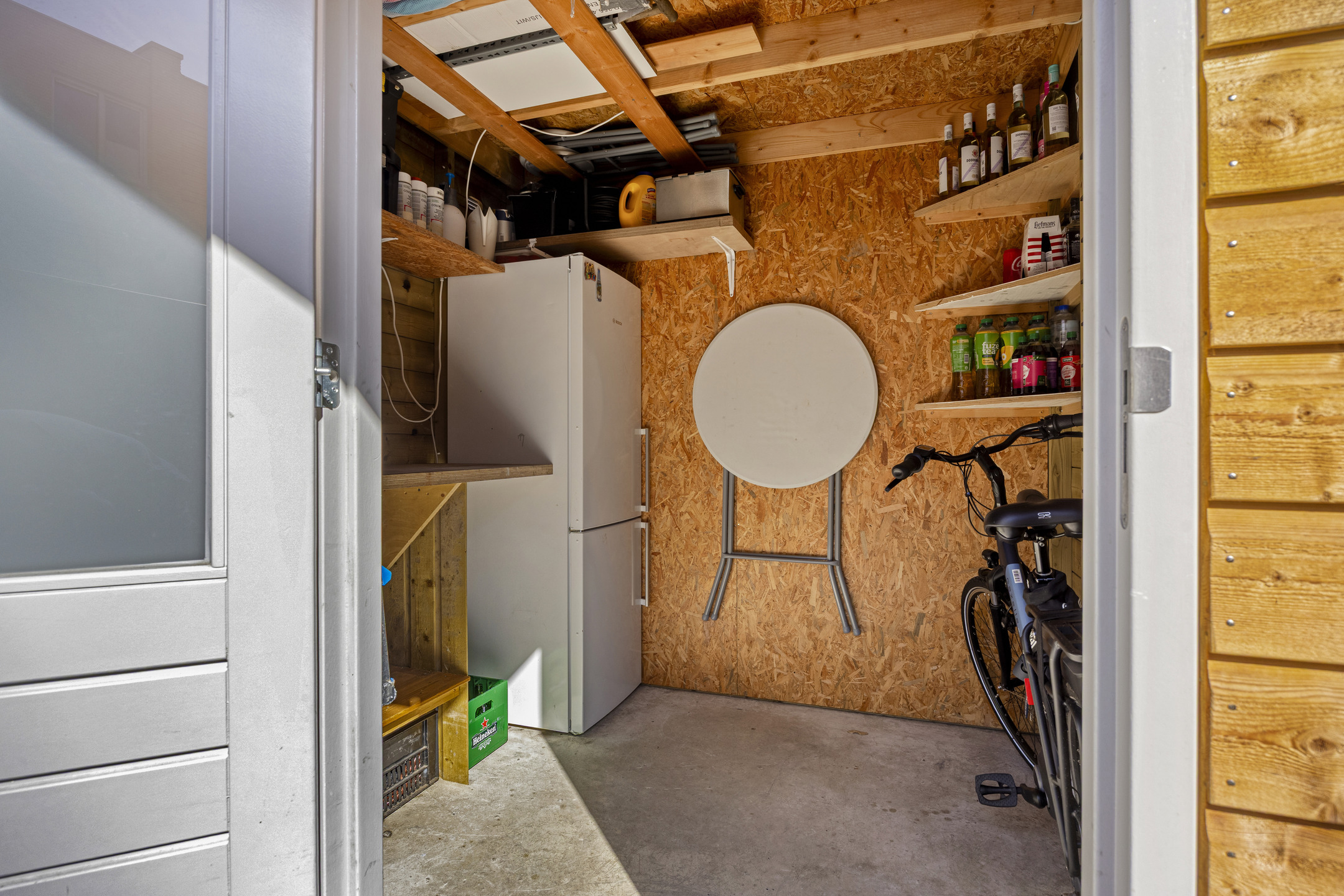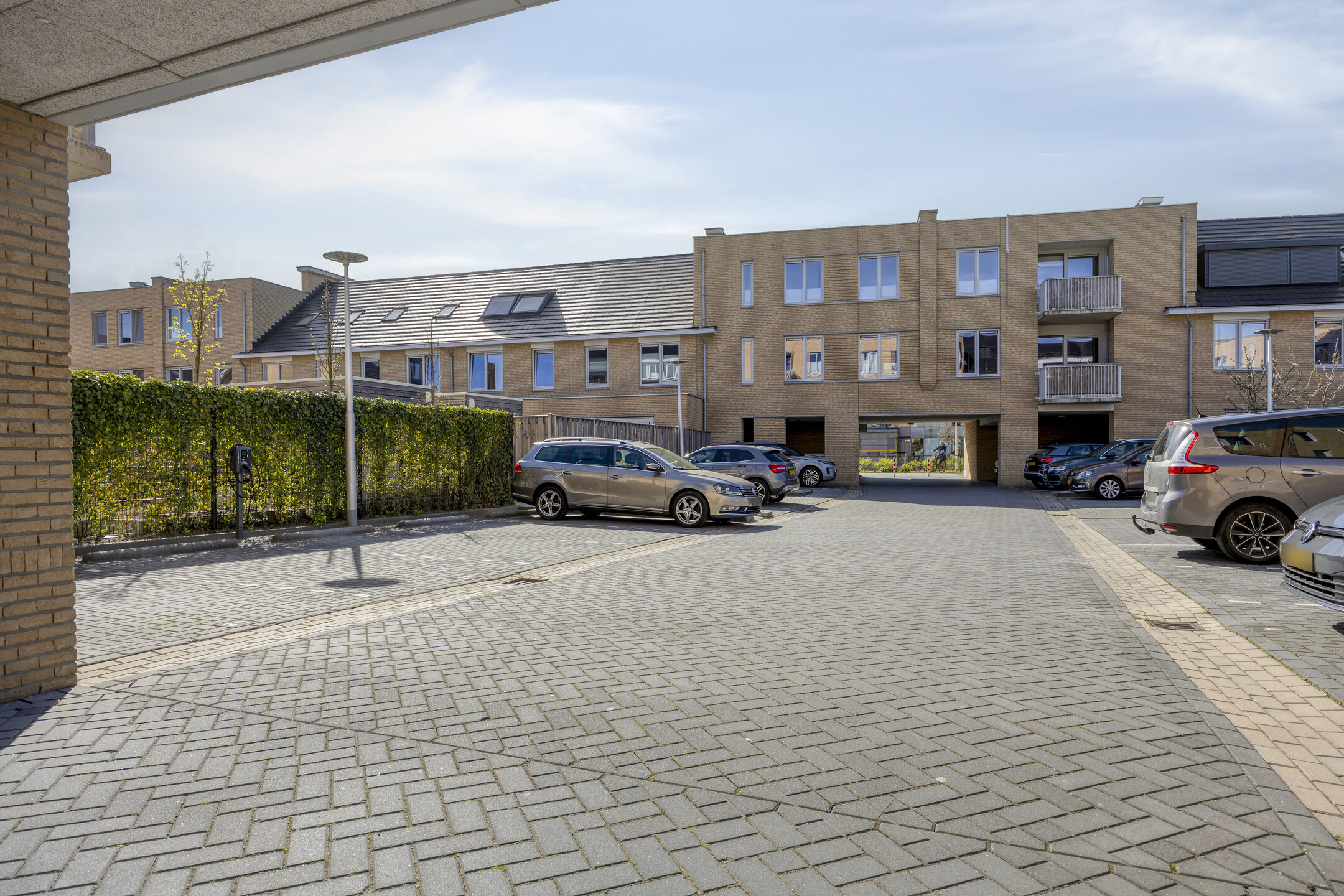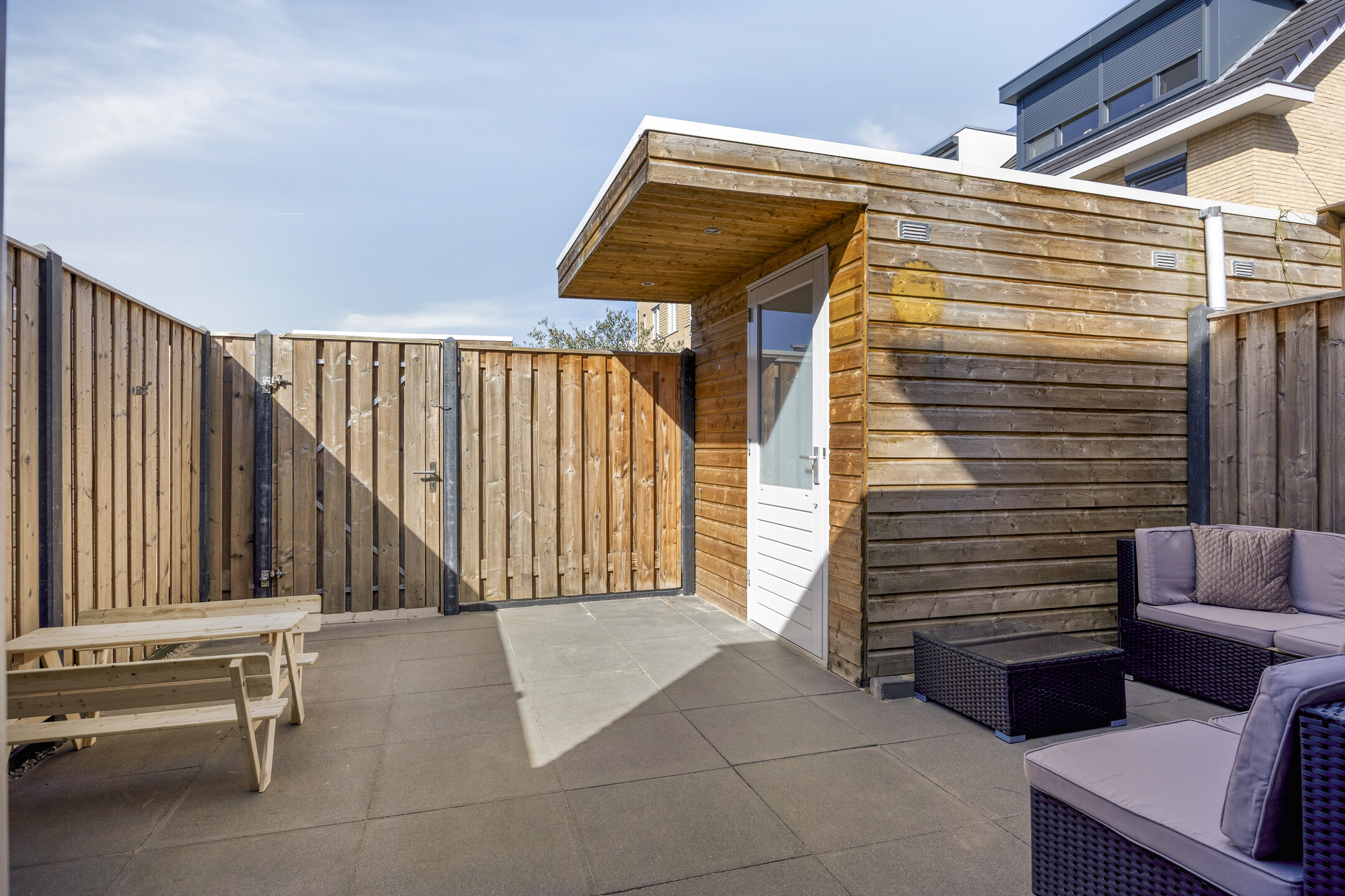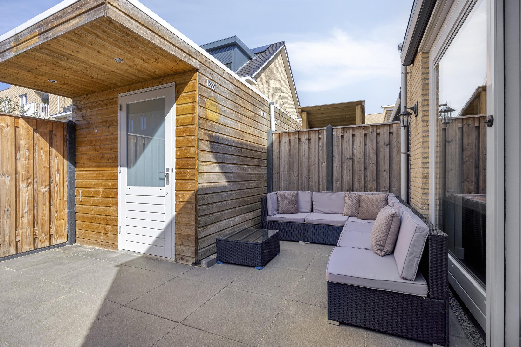 De achtertuin is op het westen gelegen en heeft een achterom en een houten berging. Tevens is er een elektrisch zonnescherm en een hor aanwezig. Aan de achterzijde bevindt zich op het binnenplein een eigen parkeerplaats.