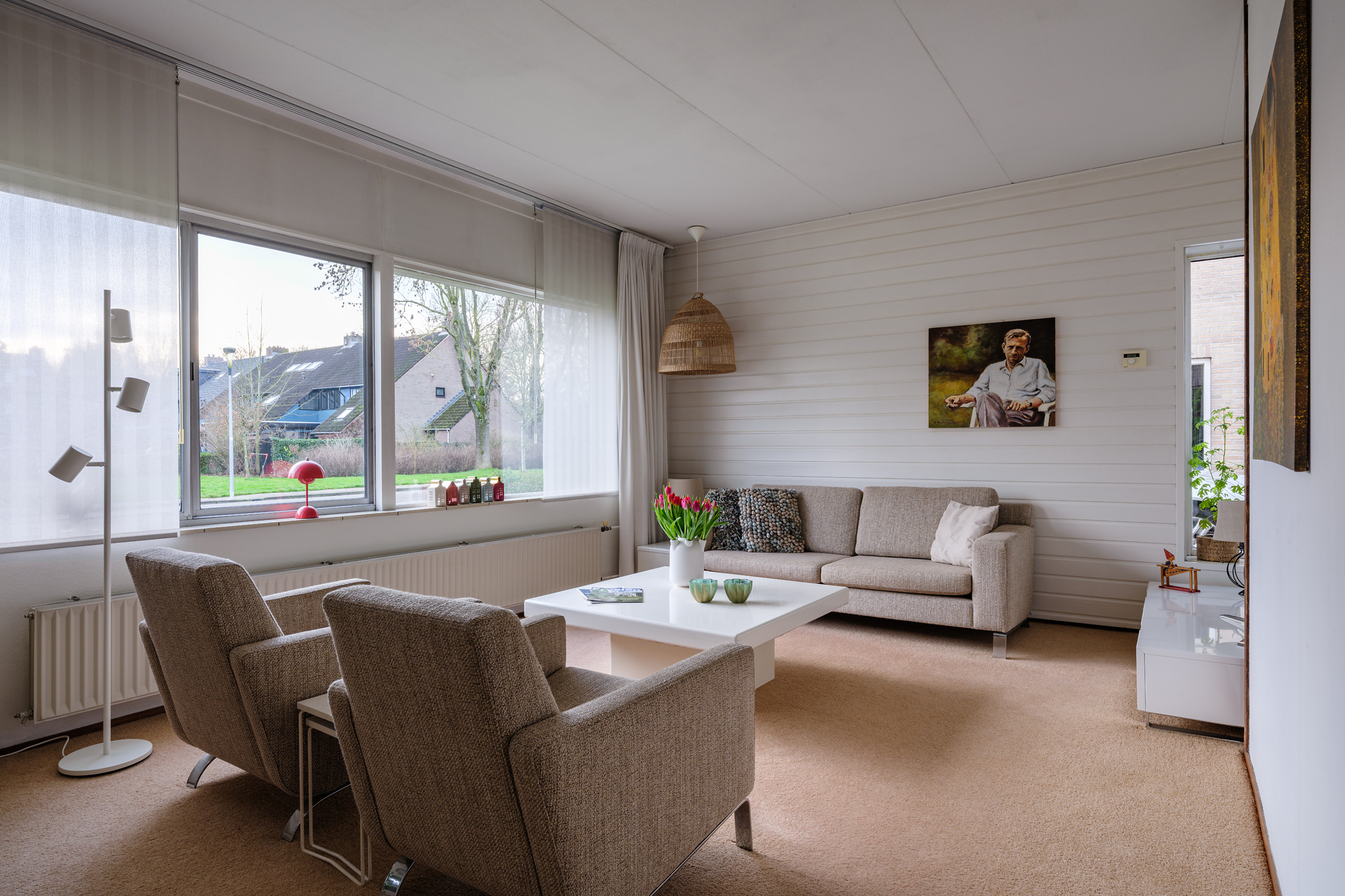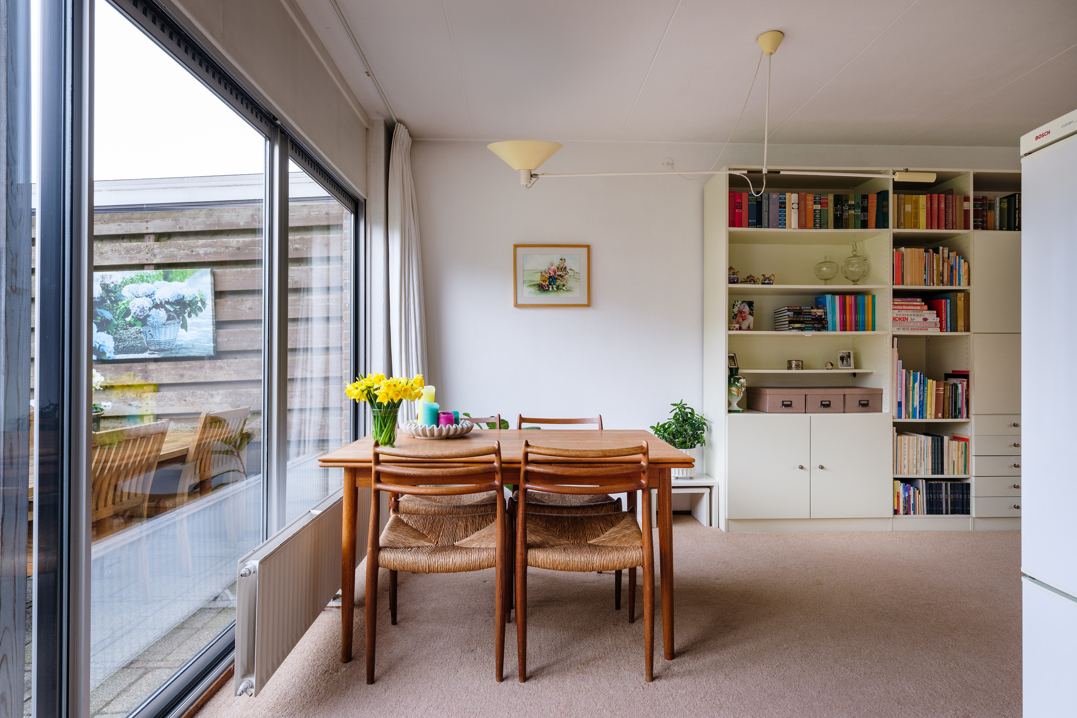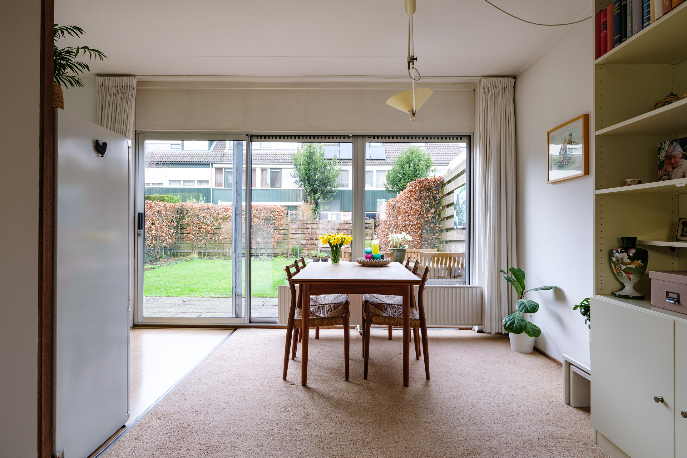 Je komt binnen in een ruime hal met een garderobe, een meterkast en een toilet met fontein. De lichte woonkamer aan de voorzijde loopt door naar de eetkamer aan de achterzijde en vormt samen met de keuken een aangename leefruimte van circa 47 m². De aan de achterzijde gesitueerde keuken in L-opstelling is voorzien van een 4-pits keramische kookplaat, oven en een losstaande koelkast. Via de schuifpui stap je zo het terras op en de garage of tuin in.
