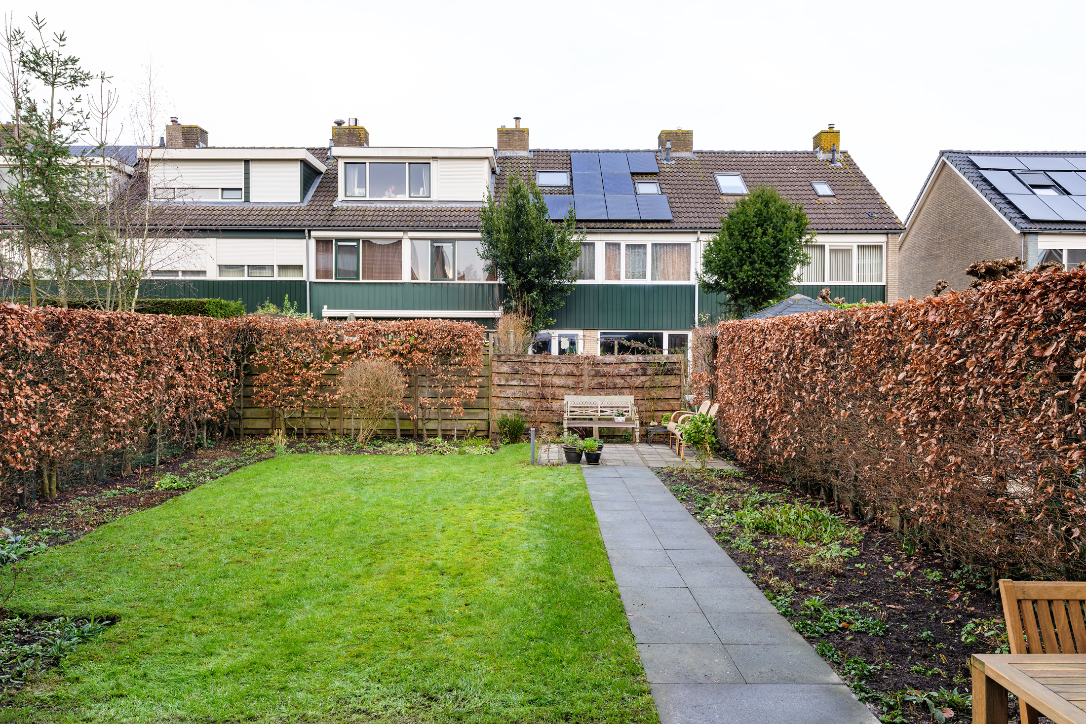De achtertuin is op het noorden gelegen en is royaal met een diepte van ongeveer 14 meter. Je beschikt hier over twee terrassen waardoor je altijd een fijne plek vindt om buiten te zitten. De tuin is bovendien fraai omsloten door groen en heeft fleurige borders. Aan de voorzijde grenst de tuin direct aan een plantsoen. Dit geeft niet alleen een ruim groen uitzicht, maar ook een heerlijk vrij en open gevoel. Parkeren is mogelijk op eigen terrein; op de oprit is er ruimte voor twee auto’s en daarnaast is er een flink bemeten garage voorzien van betonvloer en een sectionaal deur.