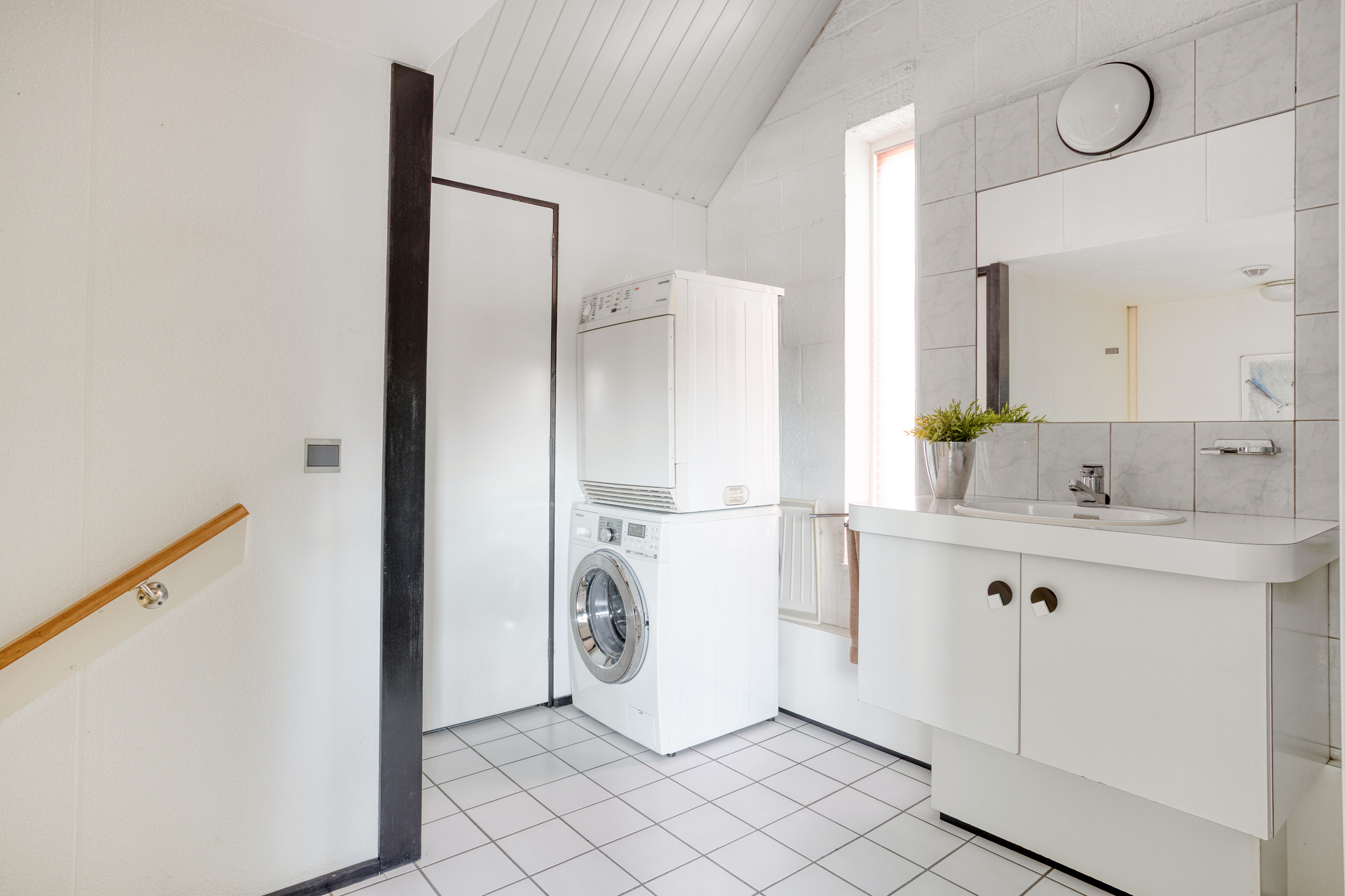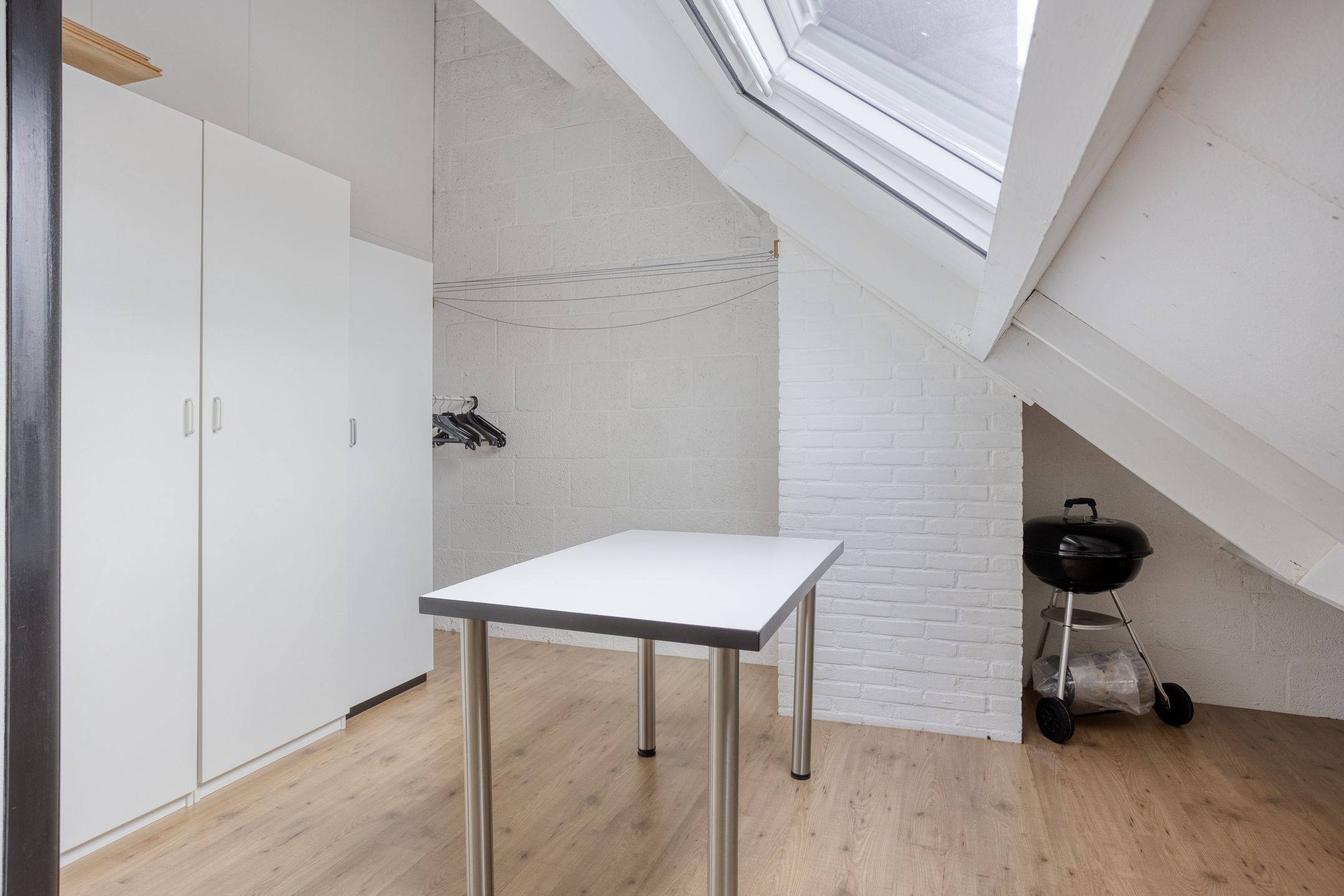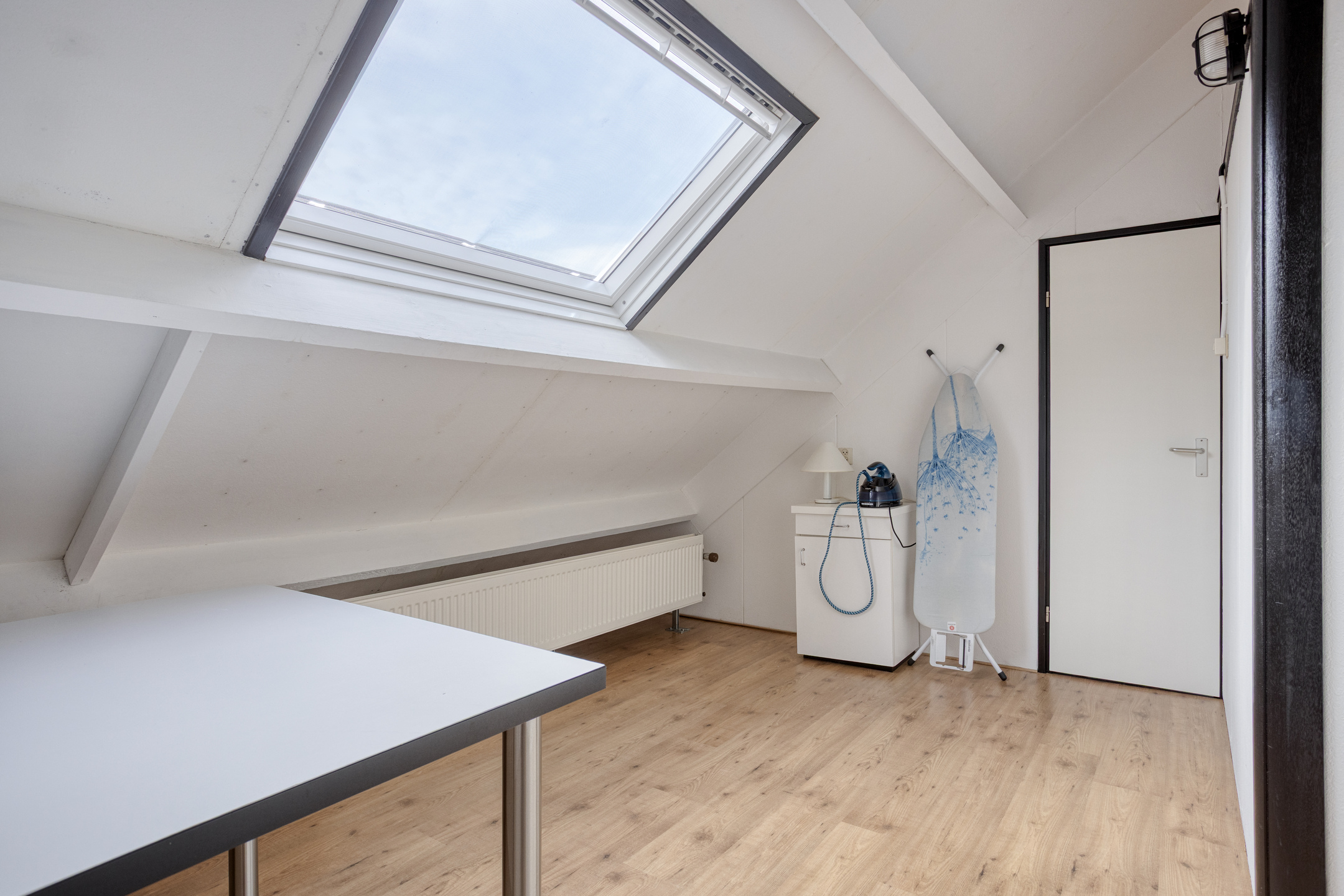 De tweede verdieping biedt nog eens twee slaapkamers en een tweede badkamer. De slaapkamer aan de achterzijde is extra licht dankzij een dakkapel en is slim ingericht met een op maat gemaakt bureau, bed en kastenwand. Daarnaast is er op creatieve wijze een tweede hoogslaper gerealiseerd – ideaal voor logees of als speelse slaapplek. Ook de tweede slaapkamer is netjes afgewerkt met schilderwerk wanden en een laminaatvloer. De tweede badkamer is praktisch ingedeeld en voorzien van een douche. De wanden zijn tot circa 1,80 meter hoog betegeld in een neutrale stijl. Op de overloop bevindt zich de aansluiting voor de wasmachine en droger, en er is een wastafelmeubel geplaatst.