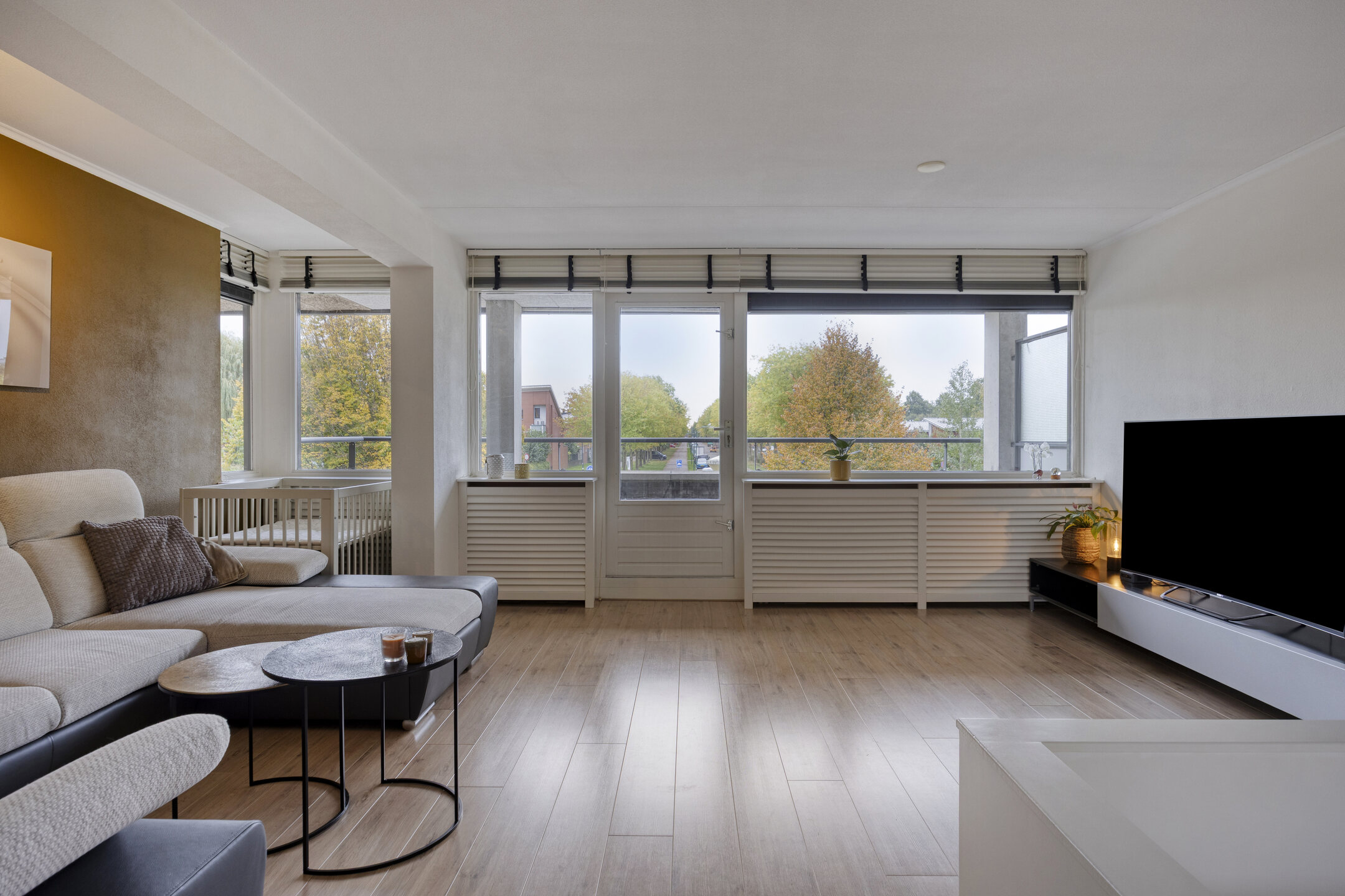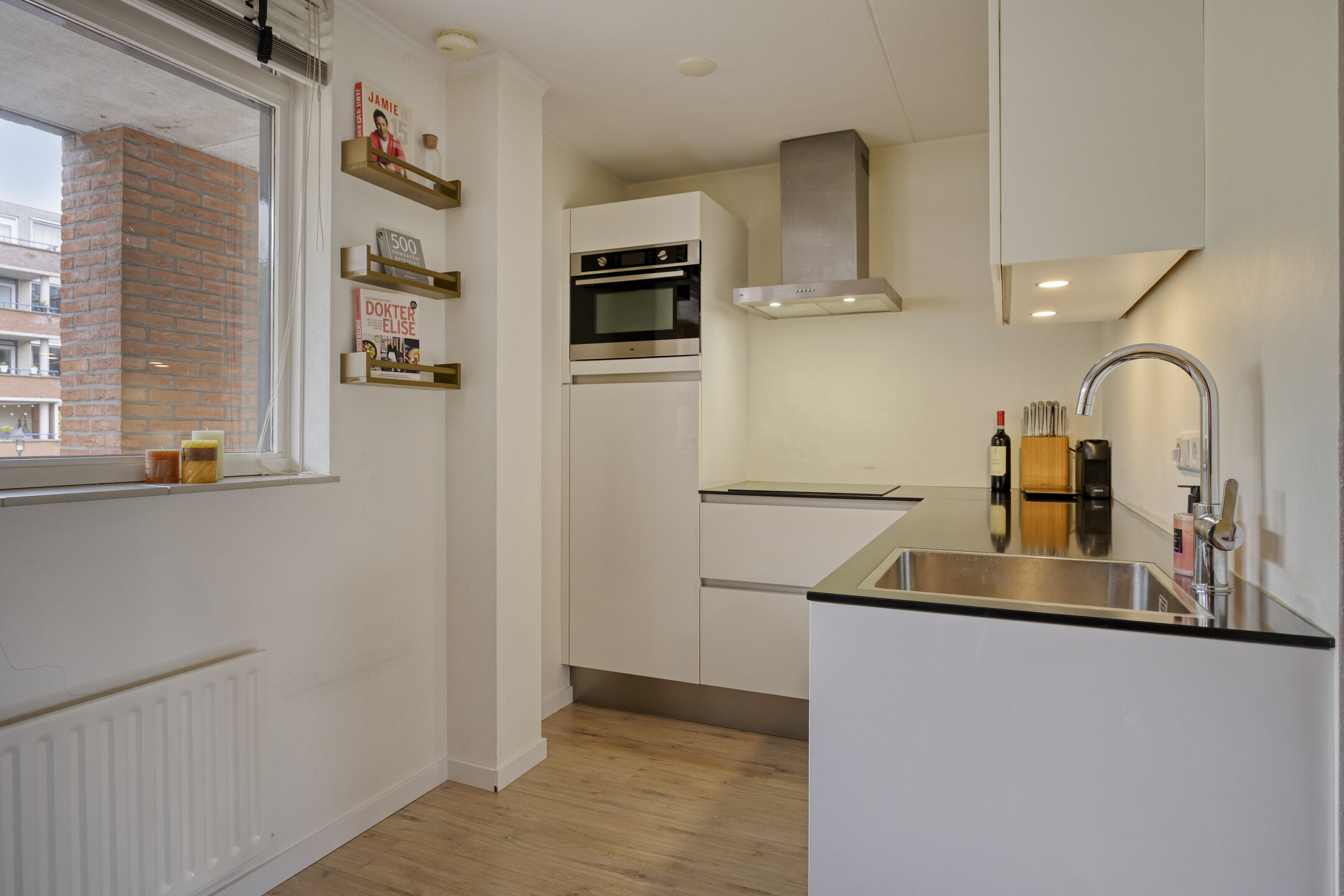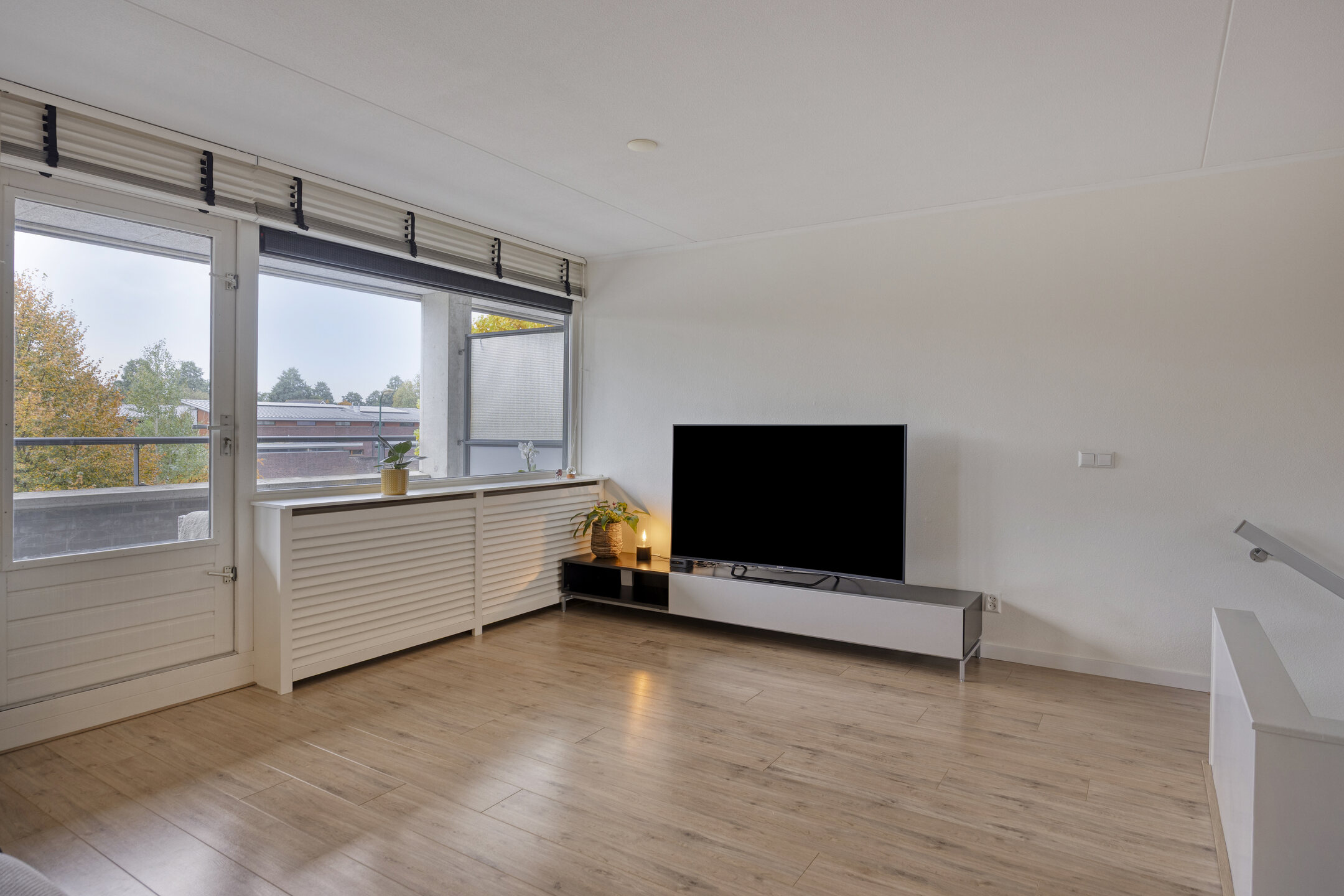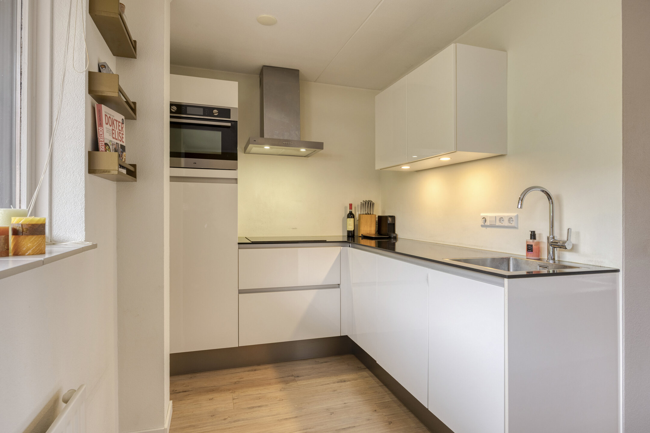 De eerste verdieping is volledig ingericht als leefruimte, met een lichte woonkamer en een open keuken. De laminaatvloer en de wanden met fijn granol en schilderwerk zorgen voor een verzorgde uitstraling. De keuken bevindt zich aan de voorzijde en is uitgevoerd in een hoekopstelling. Deze keuken, geplaatst in 2016, is uitgerust met een 4-pits inductiekookplaat, een rvs-afzuigkap (recirculatie), combi-magnetron, koelkast en vaatwasmachine. Het geheel is afgewerkt met een granito aanrechtblad. Aan de zuidoostzijde ligt over de volle breedte van de maisonnette een overdekt balkon. Dankzij de ligging op de eerste verdieping geniet je hier van een mooi uitzicht en heb je bovendien veel privacy, zonder directe inkijk vanaf de straat.