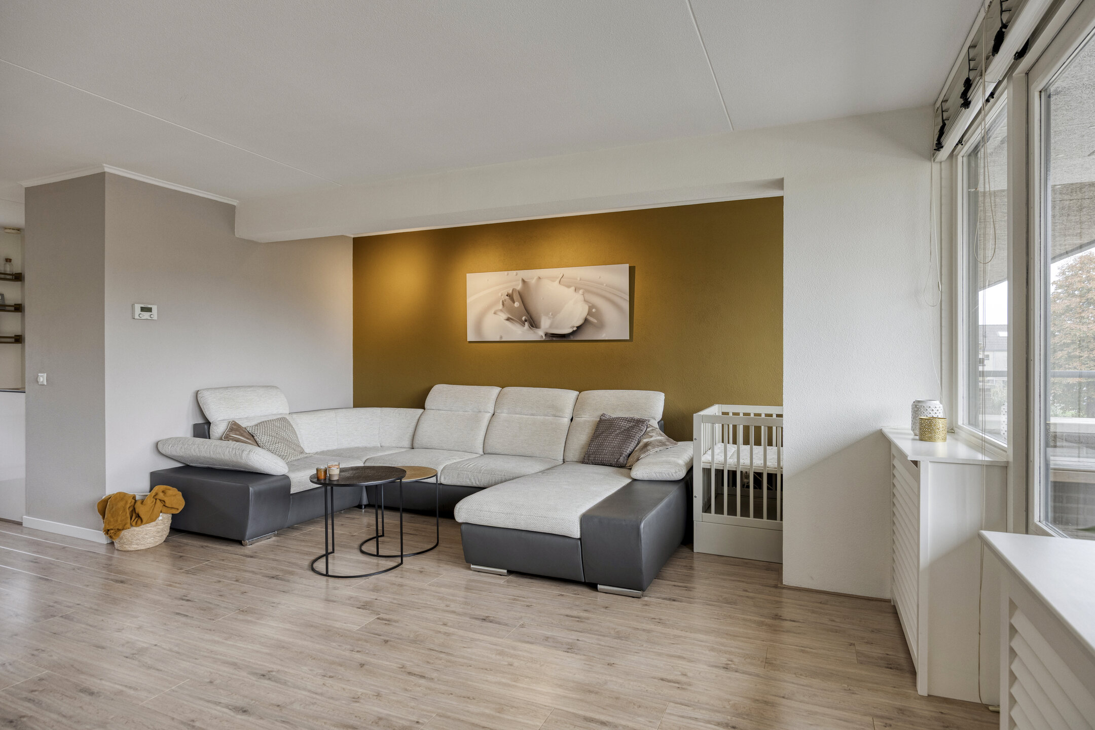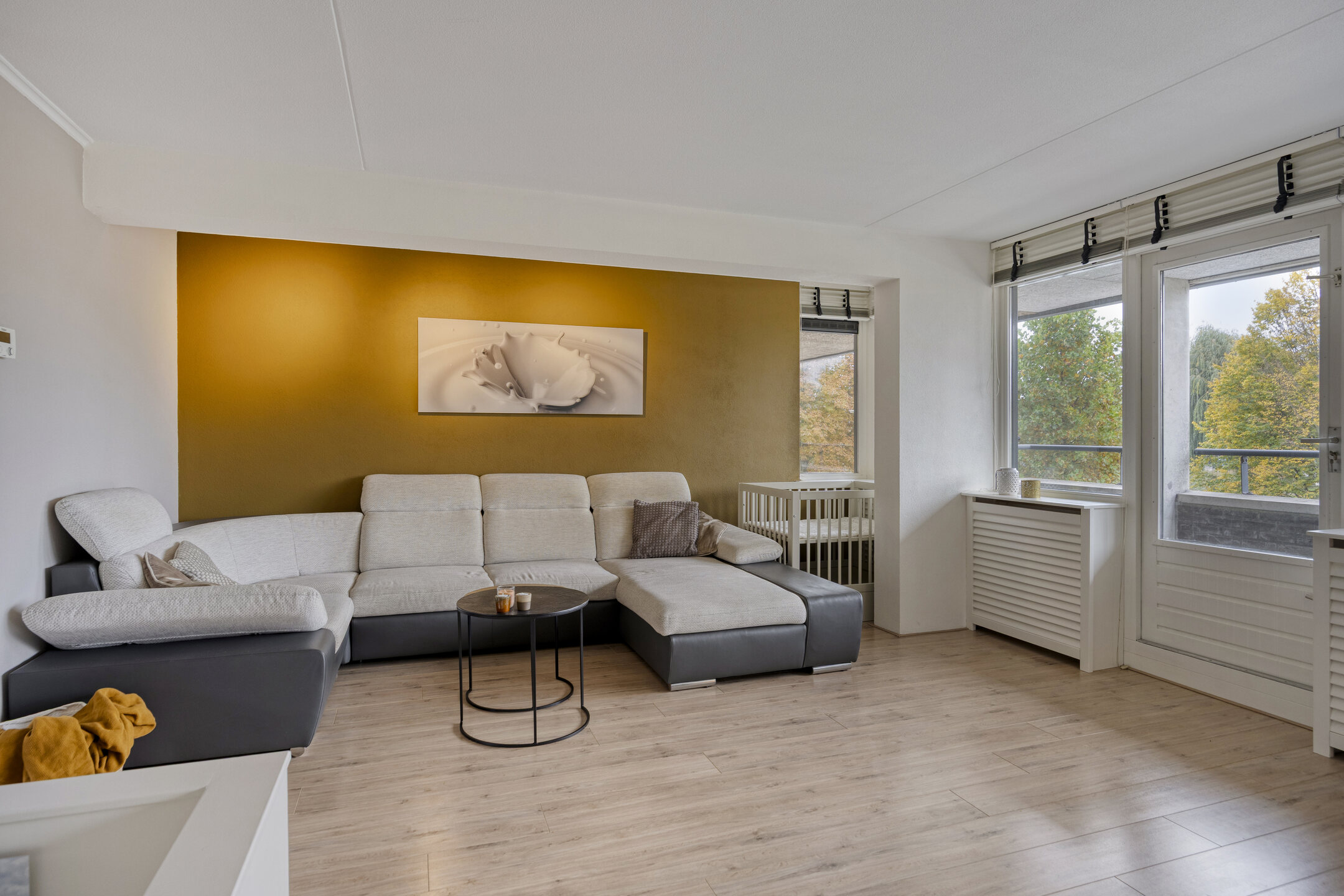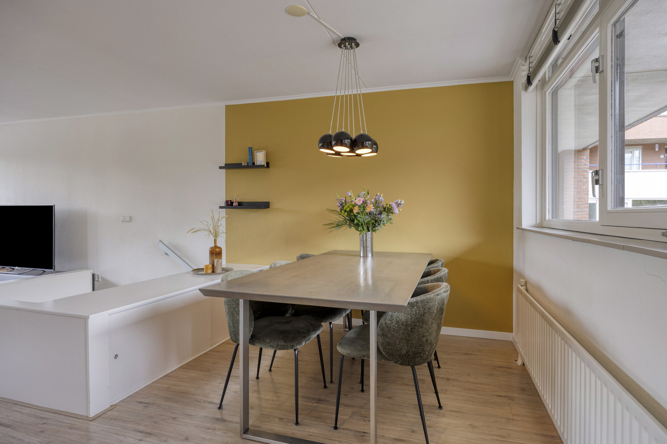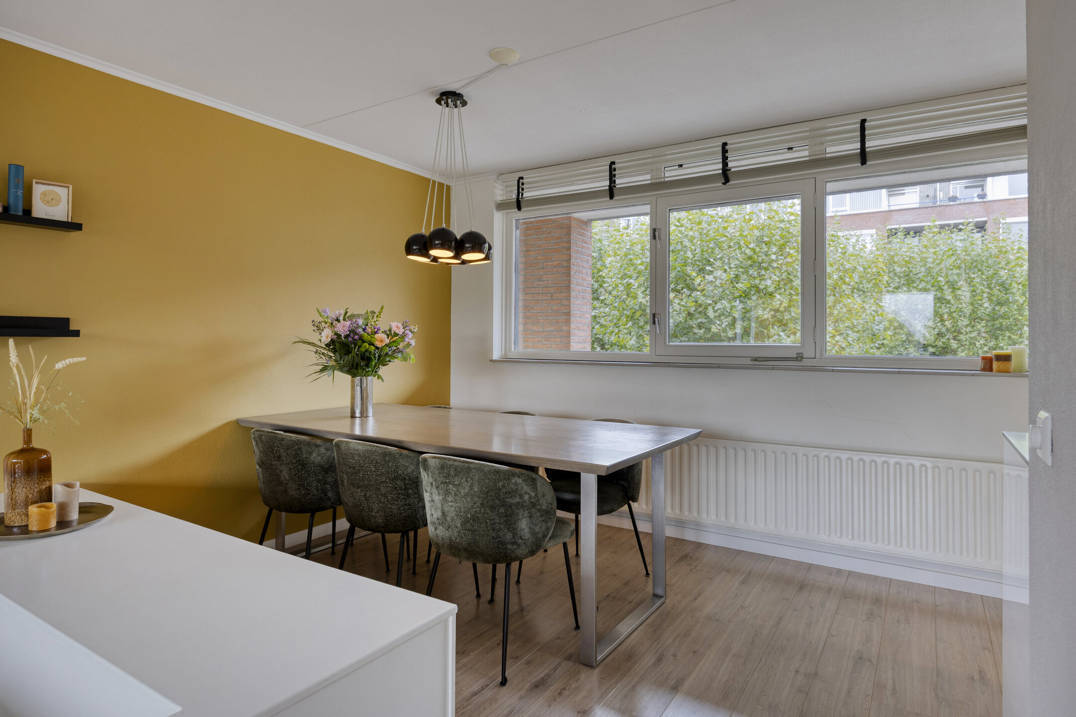De eerste verdieping is volledig ingericht als leefruimte, met een lichte woonkamer en een open keuken. De laminaatvloer en de wanden met fijn granol en schilderwerk zorgen voor een verzorgde uitstraling. De keuken bevindt zich aan de voorzijde en is uitgevoerd in een hoekopstelling. Deze keuken, geplaatst in 2016, is uitgerust met een 4-pits inductiekookplaat, een rvs-afzuigkap (recirculatie), combi-magnetron, koelkast en vaatwasmachine. Het geheel is afgewerkt met een granito aanrechtblad. Aan de zuidoostzijde ligt over de volle breedte van de maisonnette een overdekt balkon. Dankzij de ligging op de eerste verdieping geniet je hier van een mooi uitzicht en heb je bovendien veel privacy, zonder directe inkijk vanaf de straat.