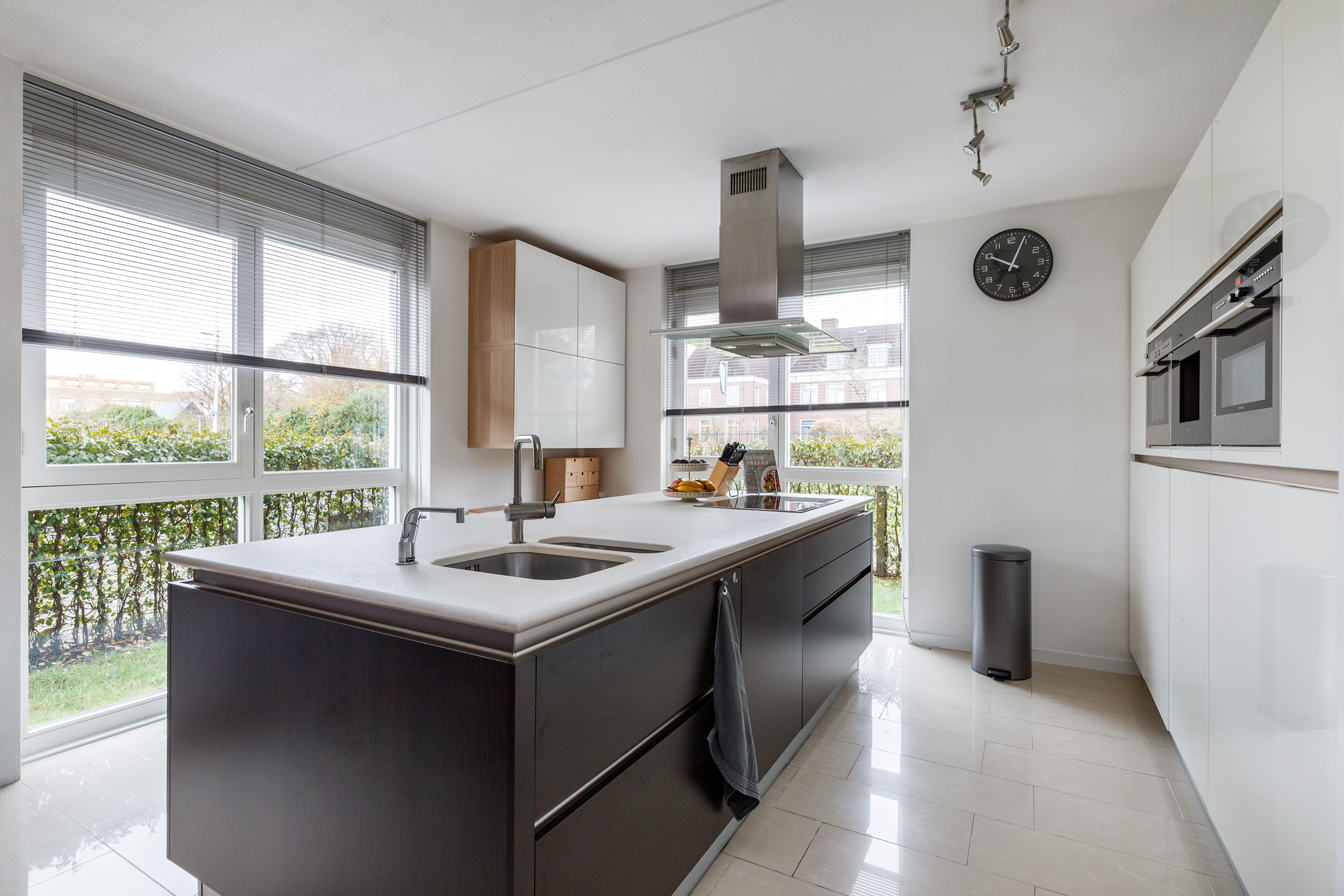 Je stapt binnen in de entree met garderobe, meterkast en toilet. Het toilet is vrijhangend met fontein en volledig tot aan het plafond betegeld. De lichte vloer met vloerverwarming (met Honeywell Evohome-systeem) loopt door over de hele begane grond en is uitgevoerd in Italiaanse granieten tegels. De strak gestucte wanden geven de ruimte een frisse en open uitstraling. De woonkamer valt op door de brede opzet en het vele glas. Het daglicht valt rijkelijk binnen via de openslaande deuren naar de tuin en het vaste raamkozijn. Het vrije uitzicht aan de voor- en zijkant versterkt de lichte en ruime sfeer. De keuken is een echte eyecatcher. Het brede kook- en spoeleiland is afgewerkt met een composiet natuurstenen blad en uitgerust met een 4-pits inductiekookplaat met recirculatiekap. Je hebt hier bovendien een koelkast (2021), quooker, stoomoven, combi-oven, volledig geïntegreerde vaatwasser (2025) en een ingebouwde koffiemachine (2025). Samen met de extra ingebouwde koelkast én diepvries vormt dit een heerlijke plek. Tevens is er een diepe trapkast aanwezig.
