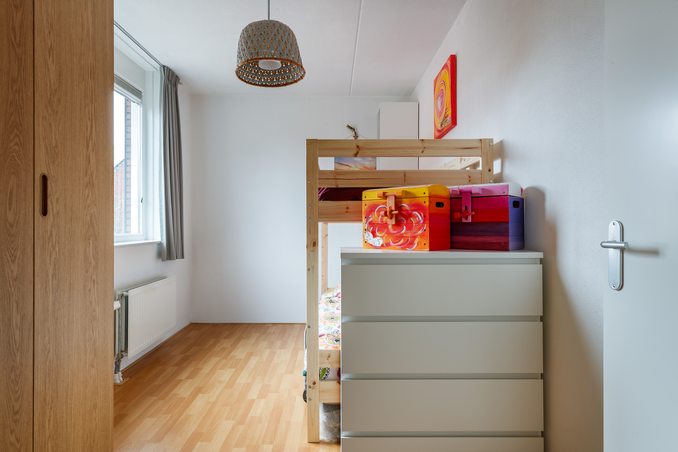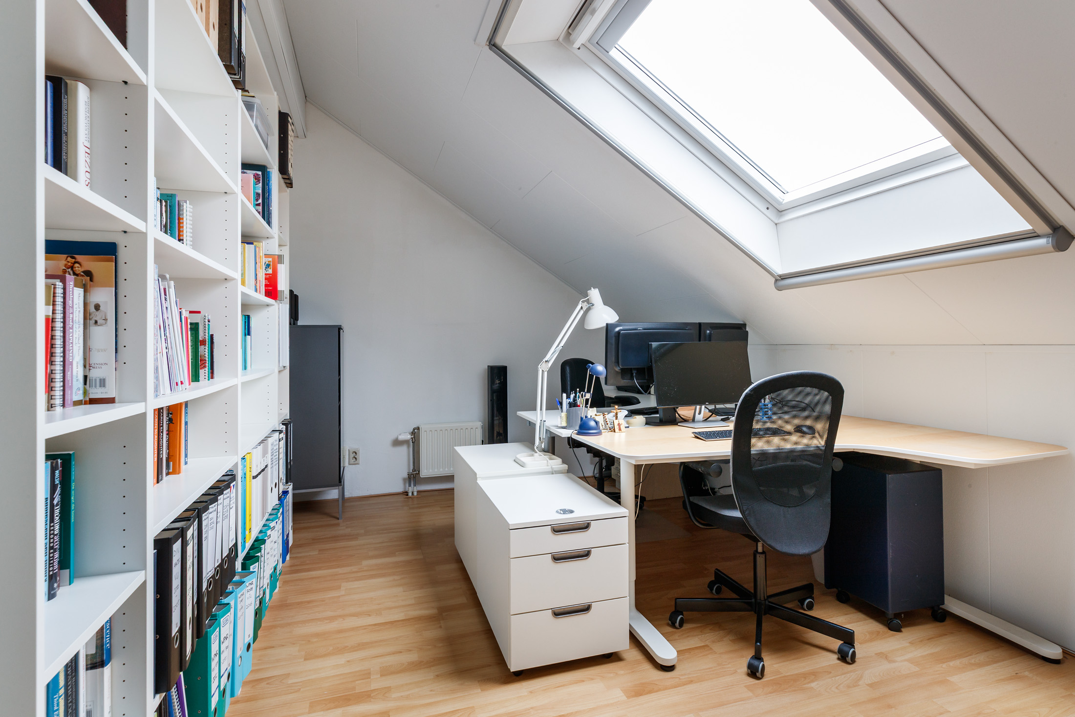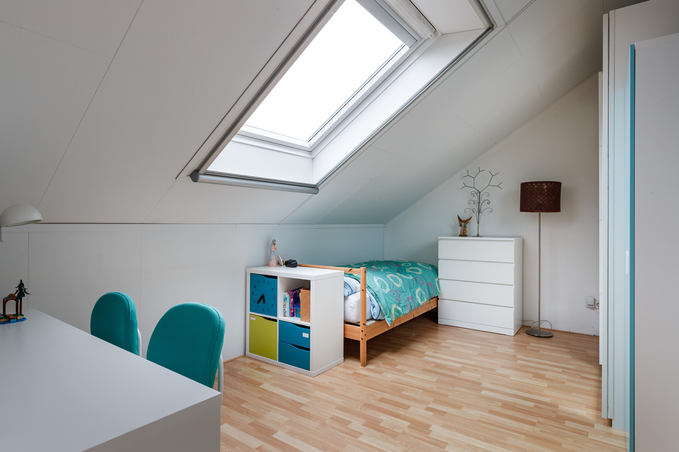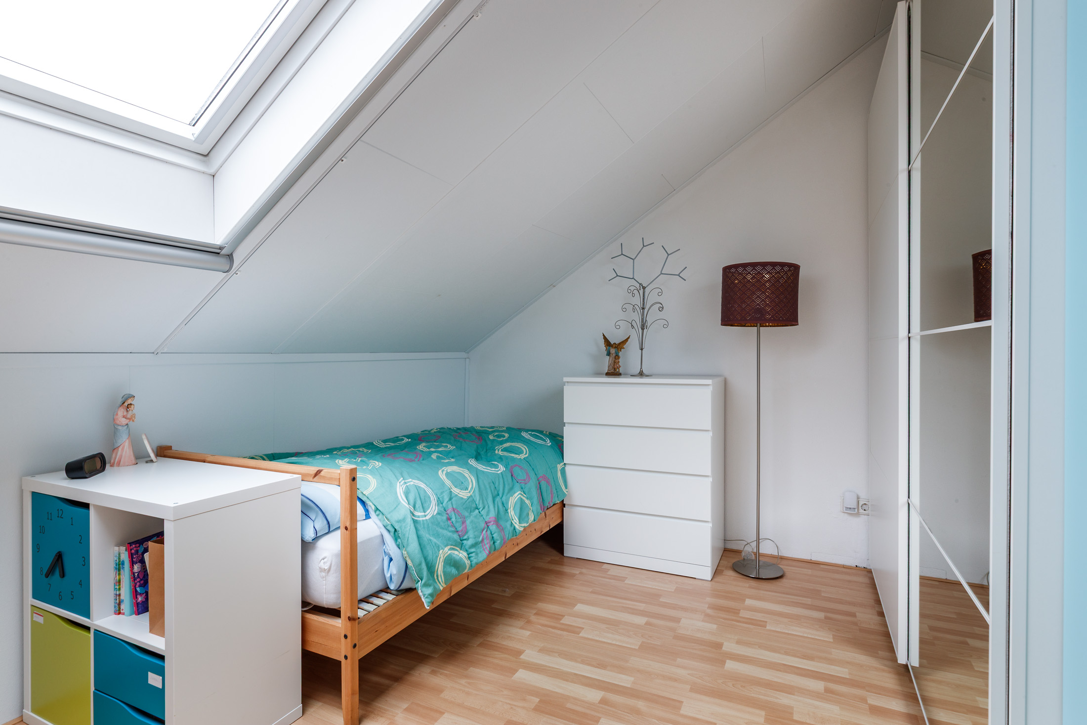 De tweede verdieping is bereikbaar via een vaste trap en biedt twee slaapkamers. Op de voorzolder is de wasruimte met aansluiting voor wasmachine en droger. Beide slaapkamers zijn voorzien van een laminaatvloer, schilderwerk wanden en Velux Integra-dakramen, die zorgen voor veel licht. De dakramen zijn elektrisch bedienbaar en beschikken aan de achterzijde over een regensensor. Ook hier zijn rolhorren en – gordijnen aanwezig.