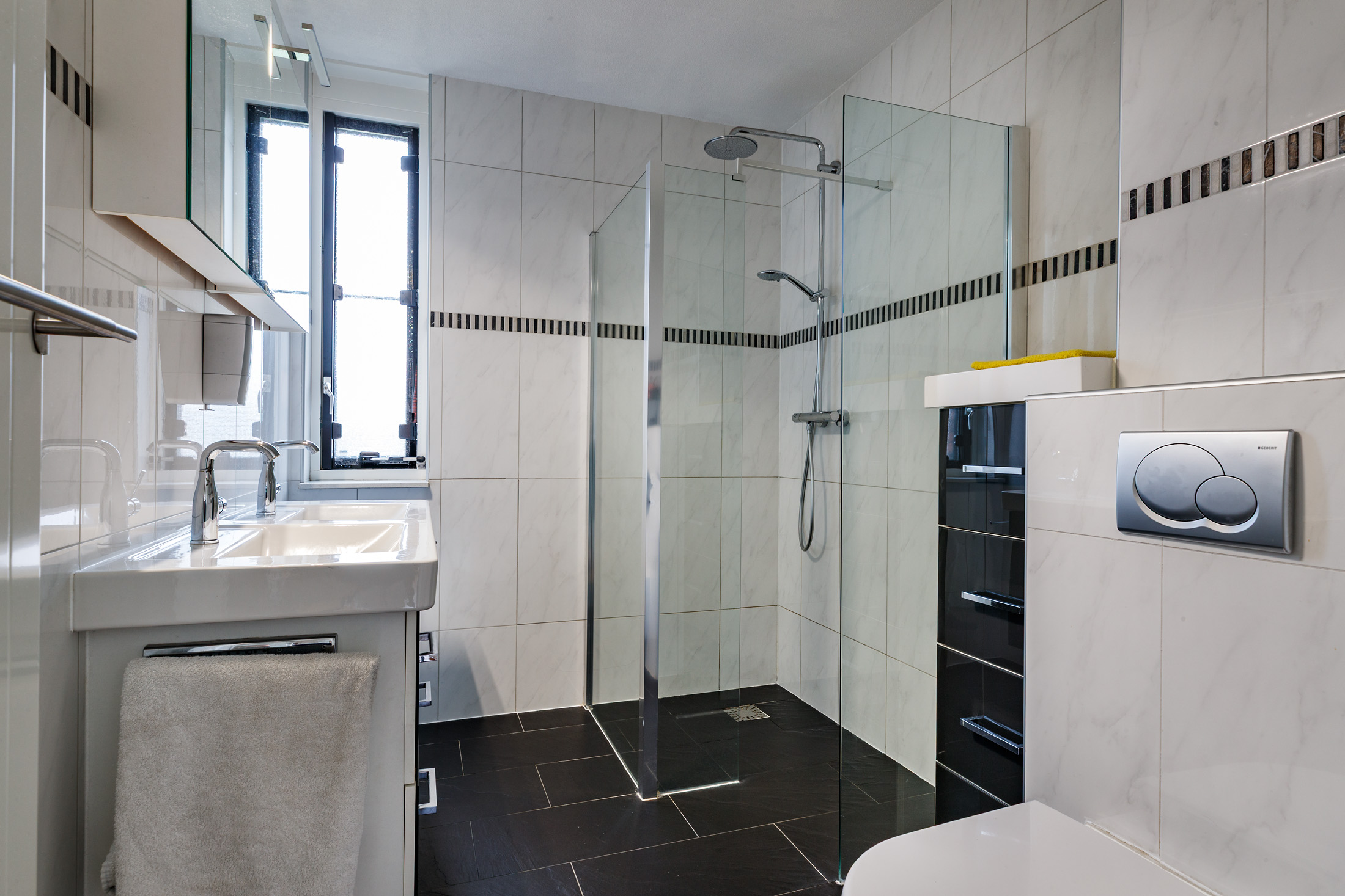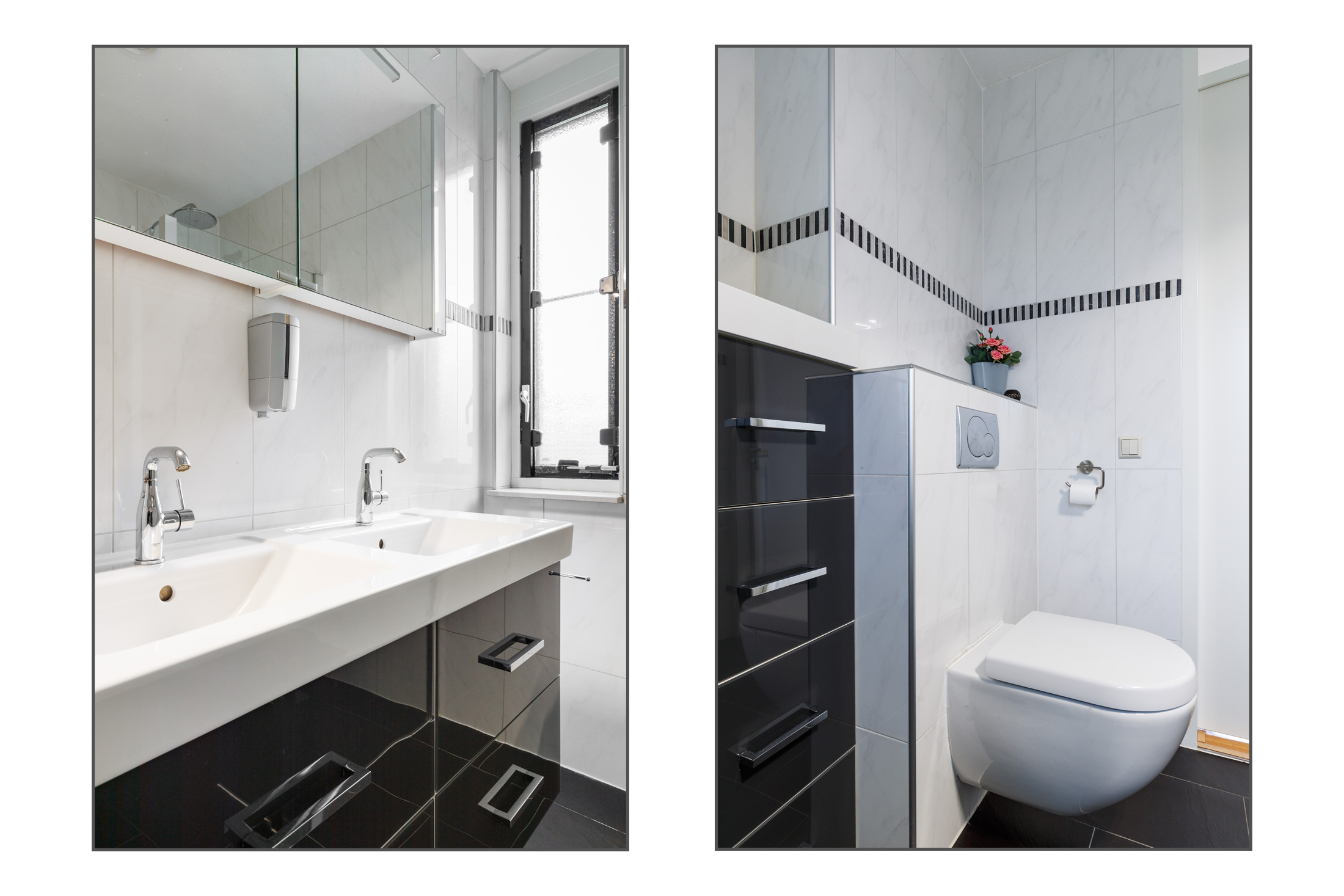 - Badkamervoorzieningen Toilet, douche, dubbele wastafel